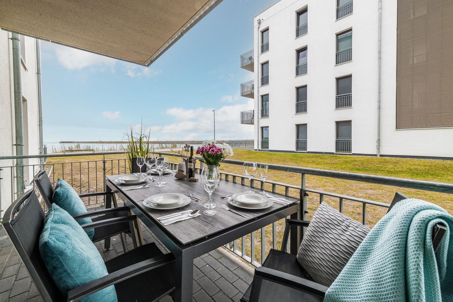 Der traumhafte Balkon bietet einen weiten Blick auf das Hafenkino, vorbeiziehenden Segelschiffe und Ausflugsdampfer. Eine hochwertige Sitzgarnitur sowie Sonnenliegen stehen bereit um erholsame Sonnenstunden zu genießen.