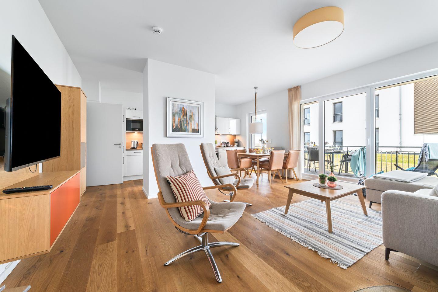 Der Wohnbereich ist mit hellen Möbeln und hochwertigem Parkettboden ausgestattet, sodass das Apartment ein nordisch elegantes Flair versprüht. Bequeme Sitzmöbel und ein Kaminofen laden – auch an „Schietwetter"- Tagen - zum Entspannen ein. Mit einem Glas Rotwein in der Hand und knisterndem Kaminfeuer im Hintergrund ist die Urlaubsstimmung perfekt.