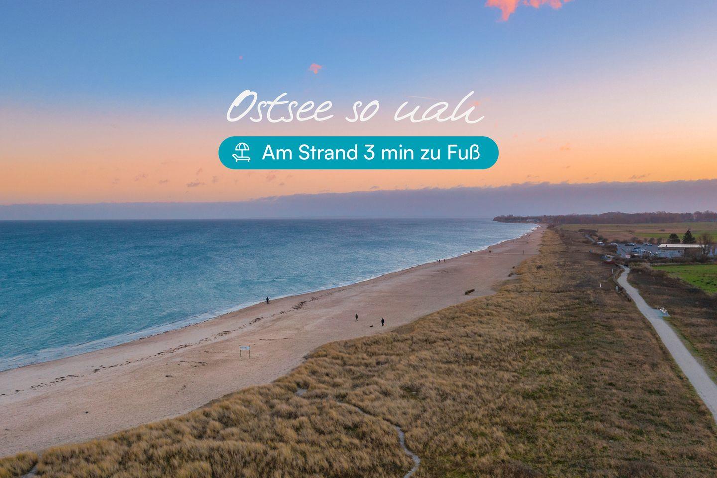 Der breite, weiße Sandstrand (Weidefeld) ist nur drei Gehminuten von Ihrem Feriendomizil entfernt und bietet Badespaß für jedermann, Restaurants und verschiedene Strandabschnitte für FKK-Liebhaber, Hunde, Surfer und Kiter.