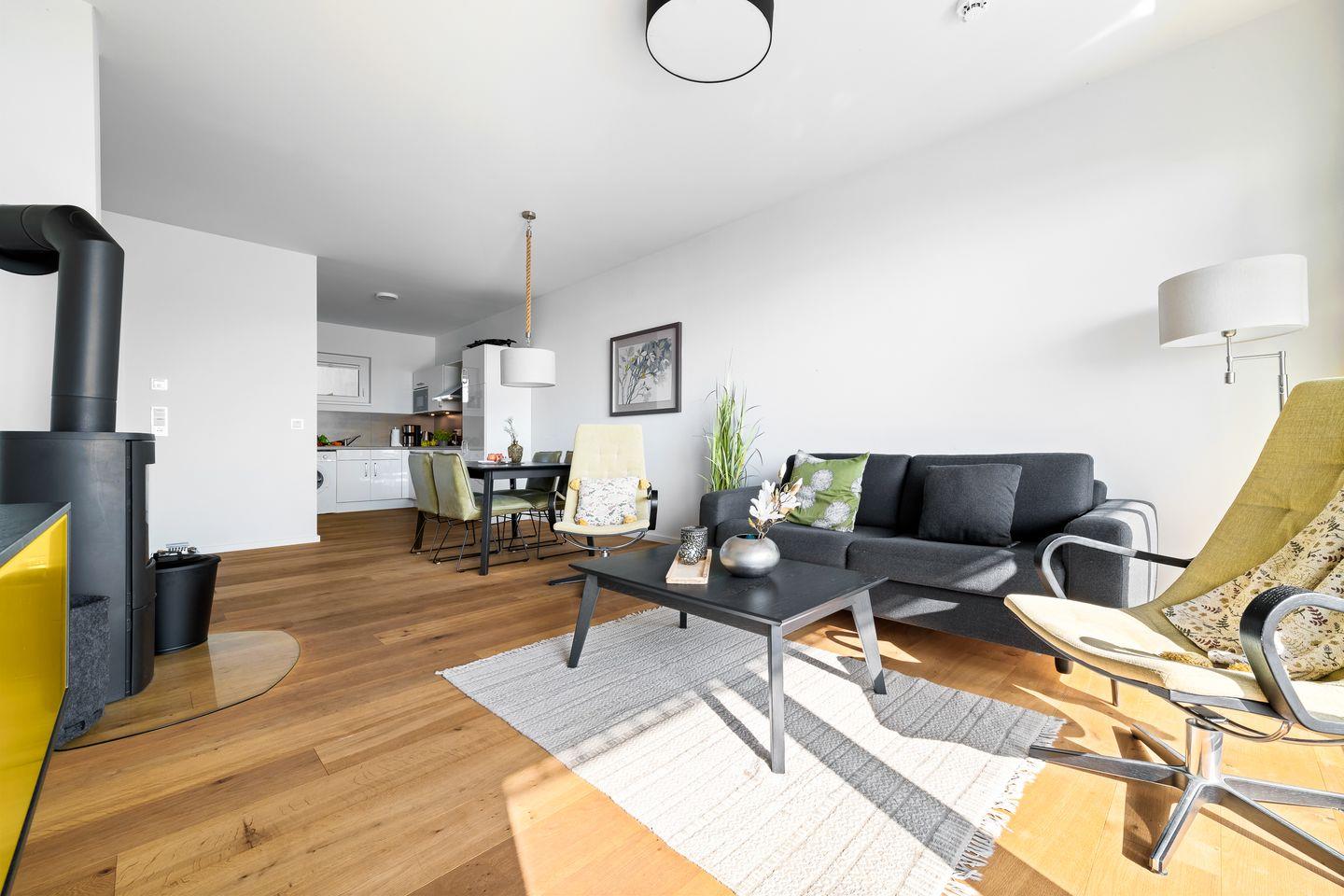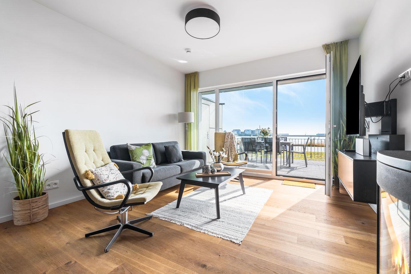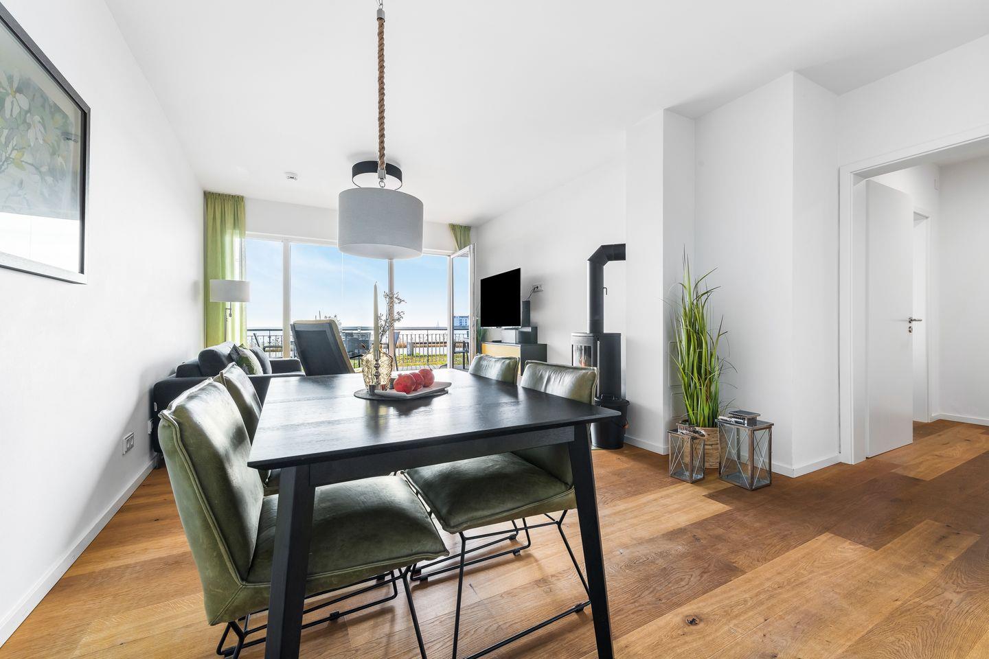 Ein wahrer Wohlfühlort ist der stilvoll möblierte Wohnbereich mit hellem Parkettboden, der durch die Panoramafront einen herrlichen Blick auf die Ostsee bietet. Für Gemütlichkeit sorgt außerdem ein Kaminofen und bequeme Sitzmöbel. Direkt an den Wohnbereich schließt die hochwertige Einbauküche an, sie ist mit allem ausgestattet, was das Hobbykoch-Herz begehrt. Während des Kochens blickt man auf die vorbeiziehenden Segelschiffe - was will man Meer?