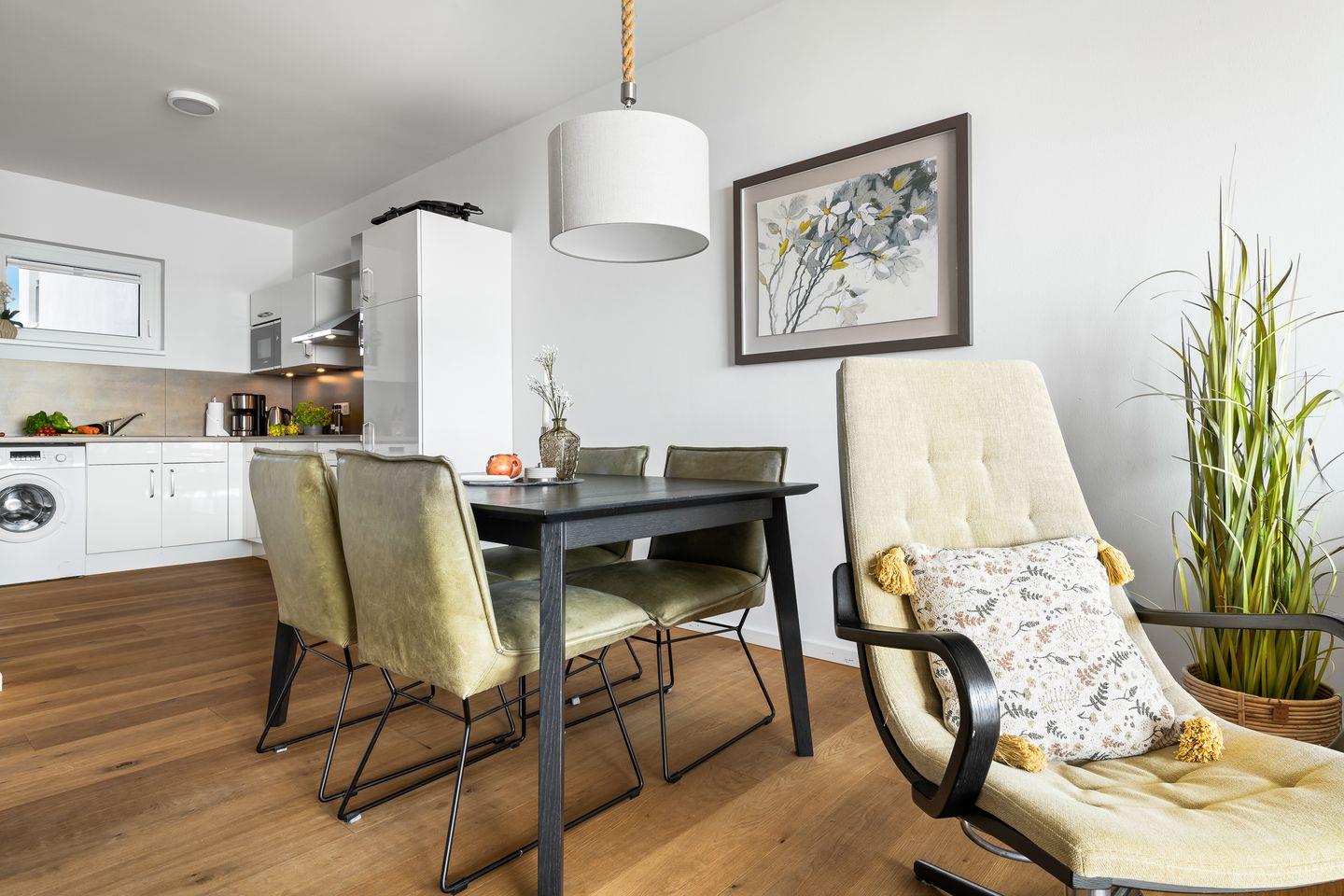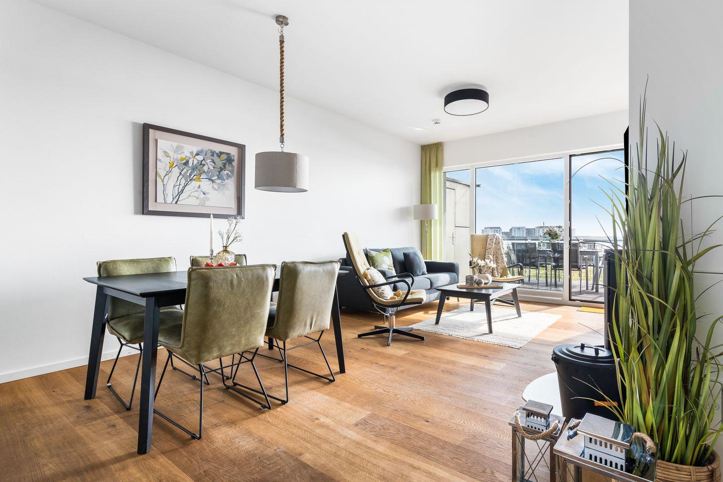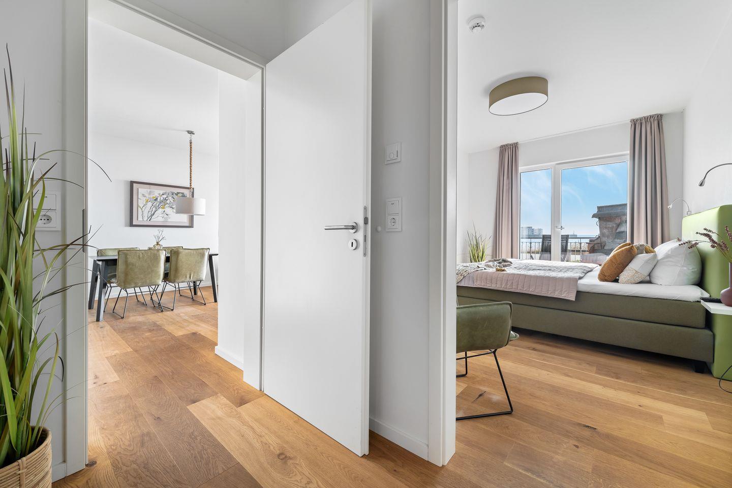 Ein wahrer Wohlfühlort ist der stilvoll möblierte Wohnbereich mit hellem Parkettboden, der durch die Panoramafront einen herrlichen Blick auf die Ostsee bietet. Für Gemütlichkeit sorgt außerdem ein Kaminofen und bequeme Sitzmöbel. Direkt an den Wohnbereich schließt die hochwertige Einbauküche an, sie ist mit allem ausgestattet, was das Hobbykoch-Herz begehrt. Während des Kochens blickt man auf die vorbeiziehenden Segelschiffe - was will man Meer?