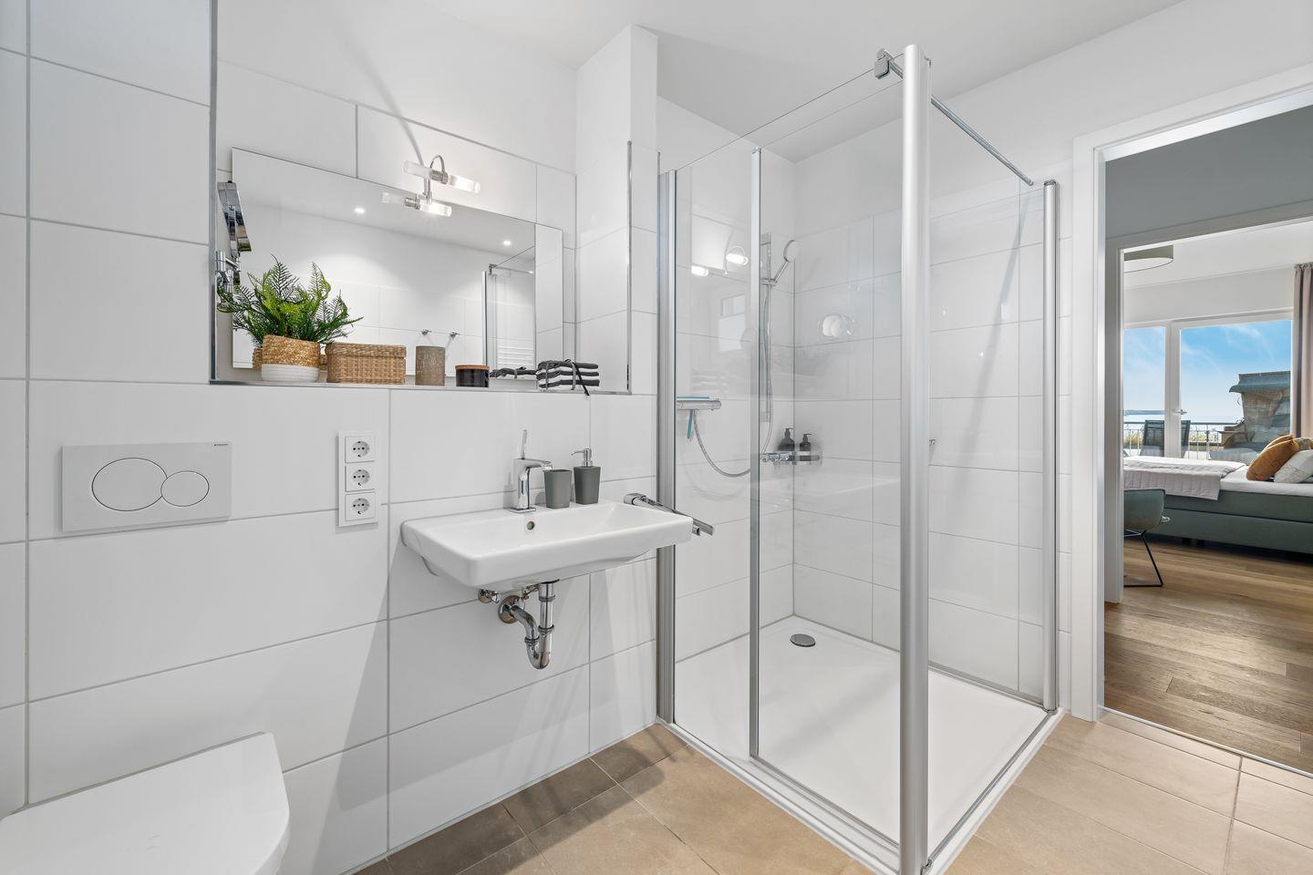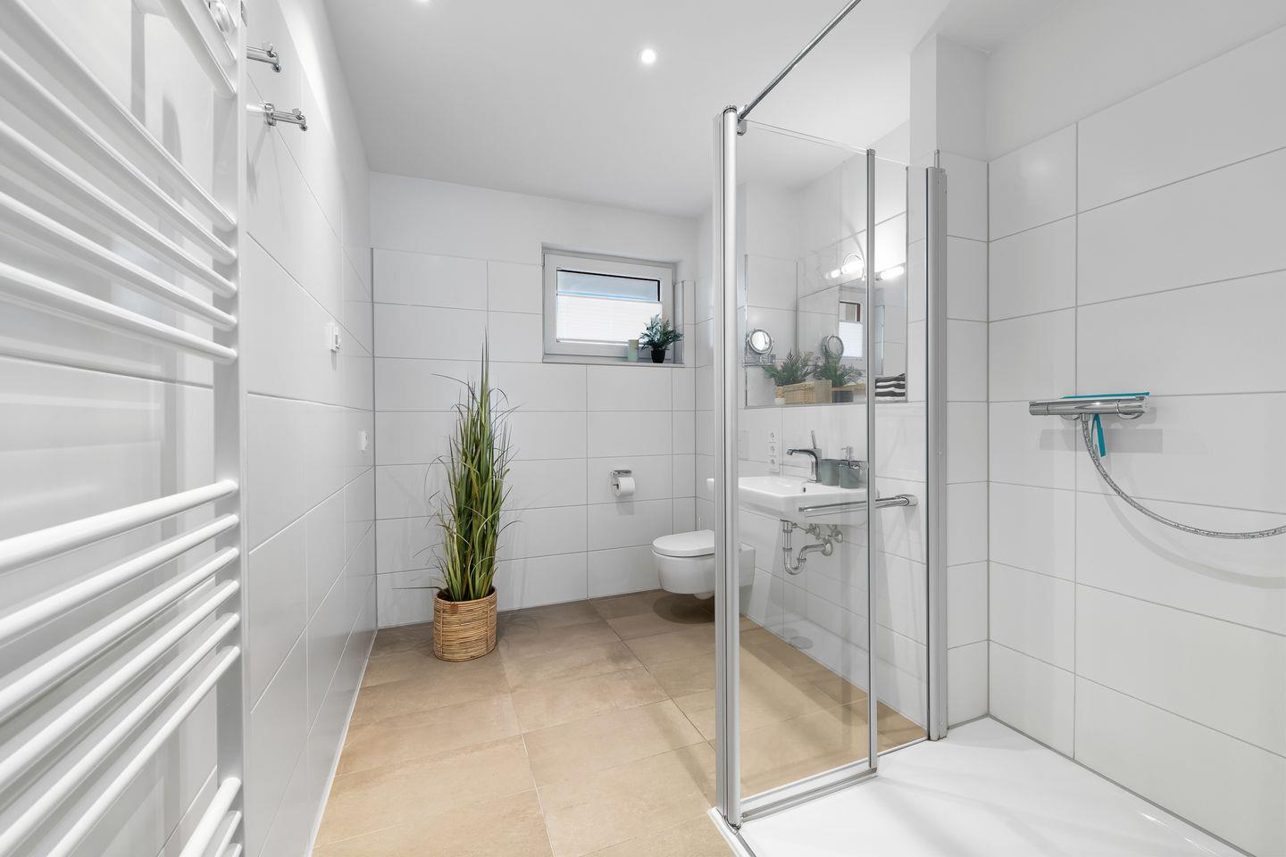 Das moderne Badezimmer mit großer, ebenerdiger Dusche und Fußbodenheizung lässt ebenfalls keine Wünsche offen.