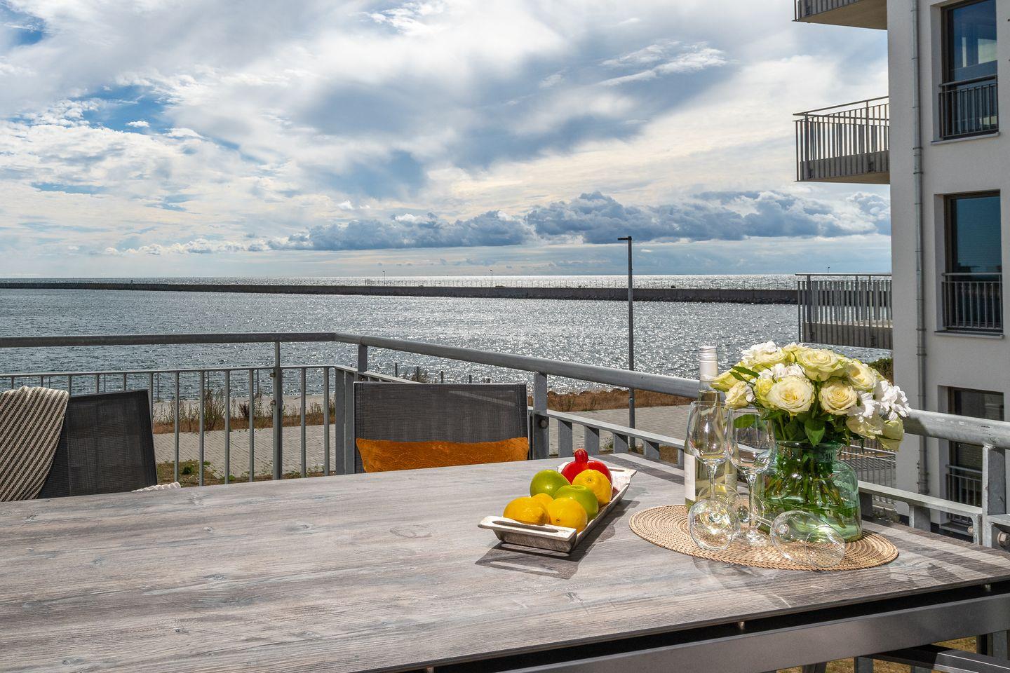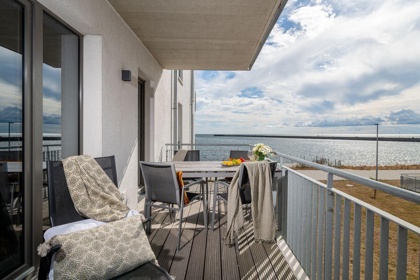 Der traumhafte Balkon bietet einen weiten Blick auf das Hafenkino, vorbeiziehenden Segelschiffe und Ausflugsdampfer. Eine hochwertige Sitzgarnitur sowie Sonnenliegen stehen bereit um erholsame Sonnenstunden zu genießen. Bei schönem Wetter steht den Gästen ein Elektro-Grill zur freien Verfügung.