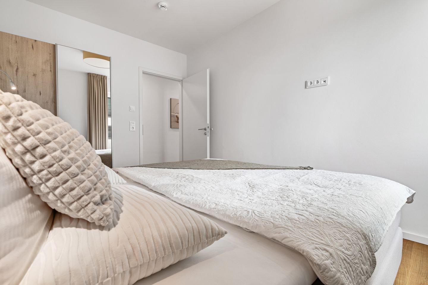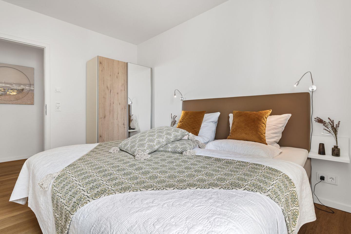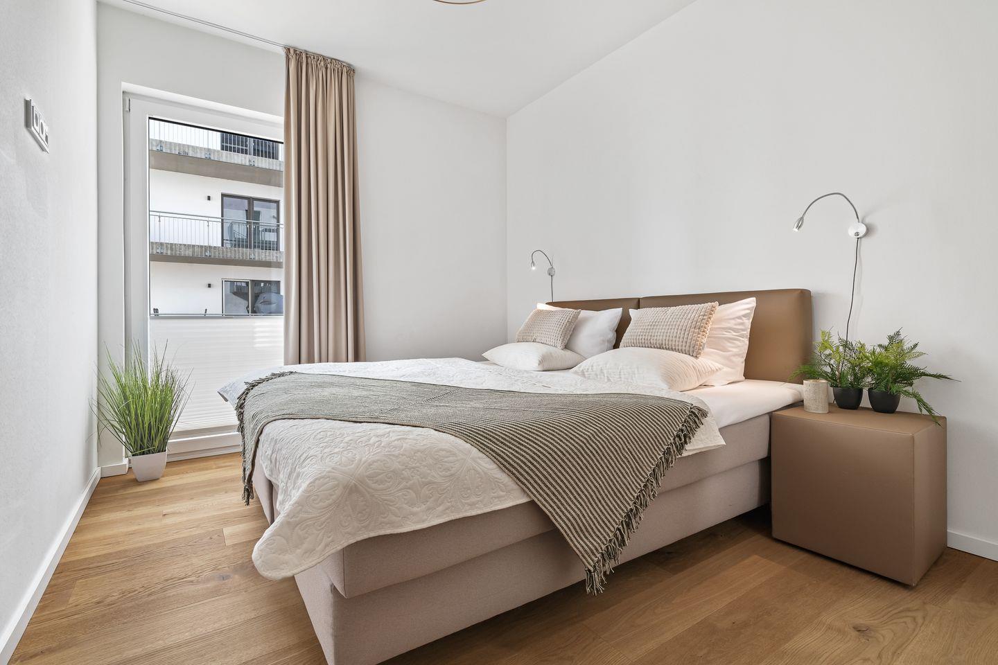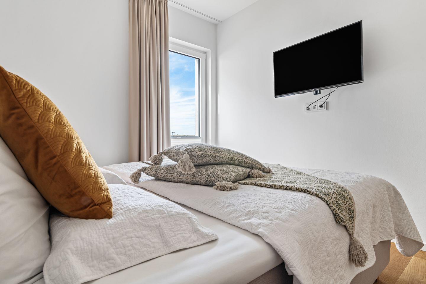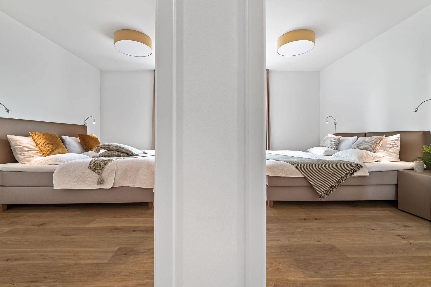 Beide Schlafzimmer verfügen über zwei einzelne Boxspringbetten, die für einen tiefen und erholsamen Schlaf sorgen. Die bodentiefen Fenster lassen sich jeweils durch Gardinen abdunkeln.