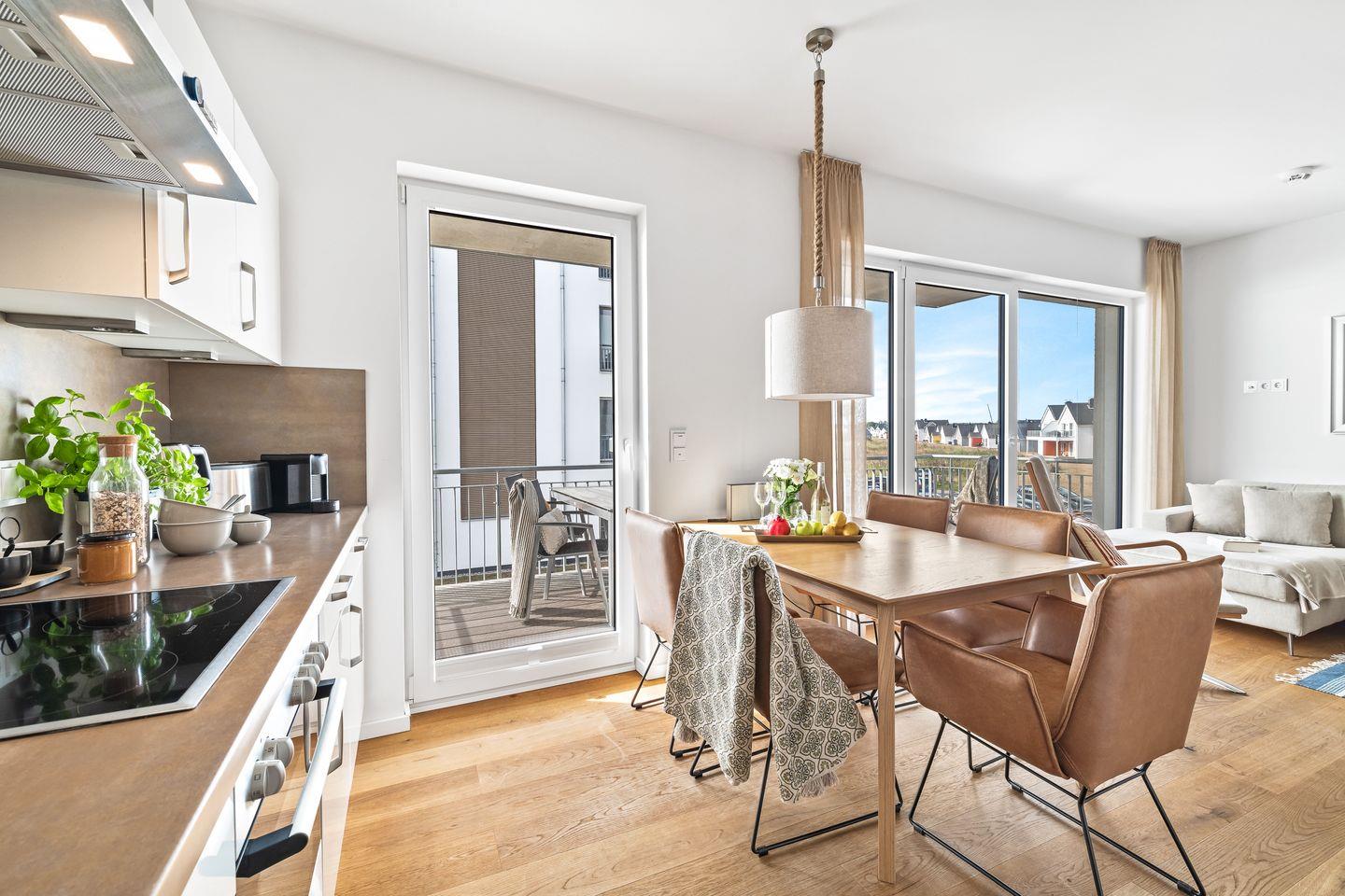 An den Wohnbereich grenzt der offene Koch- und Essbereich an. Die Gäste erwartet eine moderne Einbauküche, die mit allem, was das Herz eines Hobbykochs begehrt, ausgestattet ist. Am großen Esstisch findet jeder seinen Platz, ob beim gemütlichen Abendessen oder einem Spieleabend.
