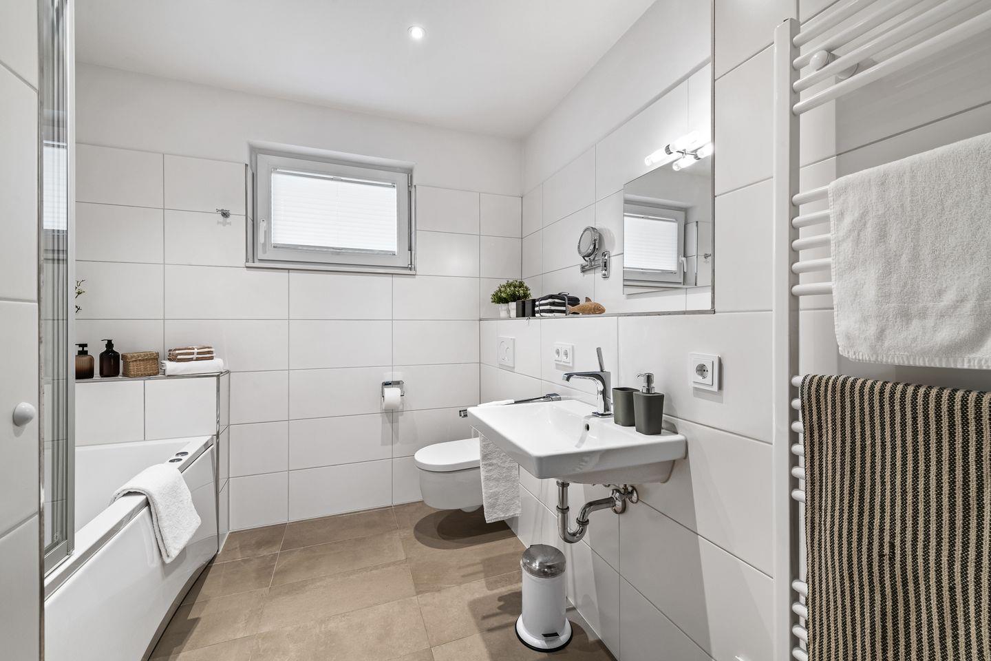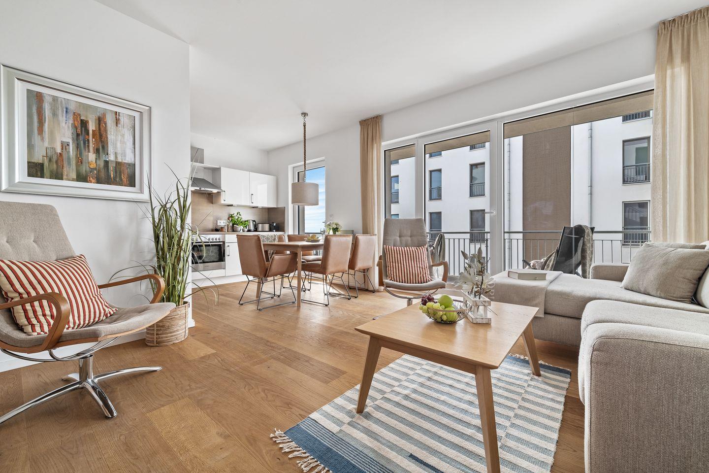 Der Wohnbereich ist mit hellen Möbeln und hochwertigem Parkettboden ausgestattet, sodass das Apartment ein nordisch, elegantes Flair versprüht. Bequeme Sitzmöbel und ein Kaminofen laden – auch an „Schietwetter"- Tagen - zum Entspannen ein. Mit einem Glas Rotwein in der Hand und knisterndem Kaminfeuer im Hintergrund ist die Urlaubsstimmung perfekt.