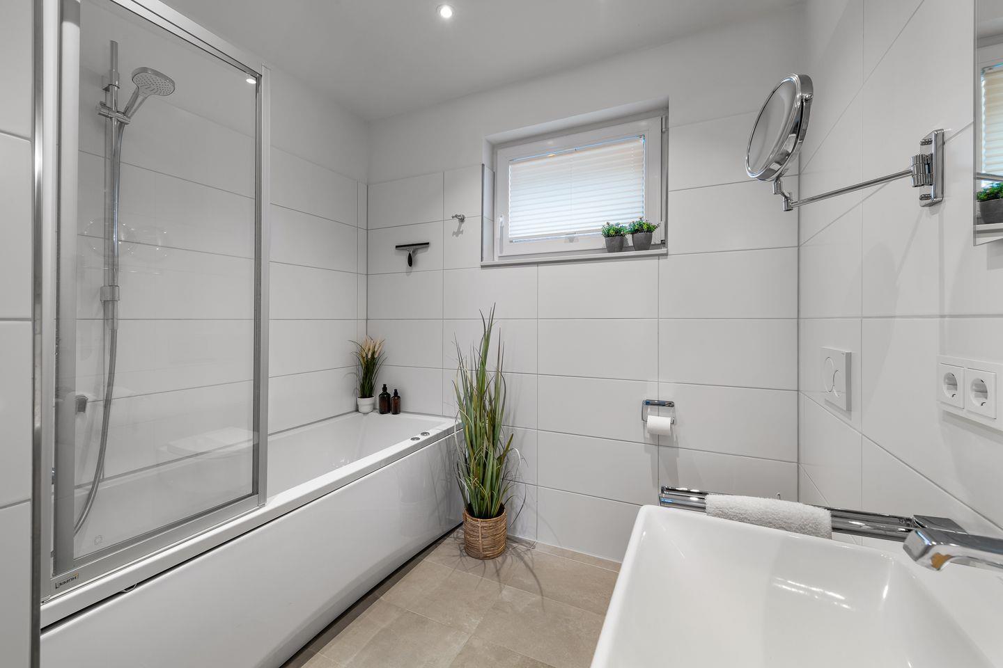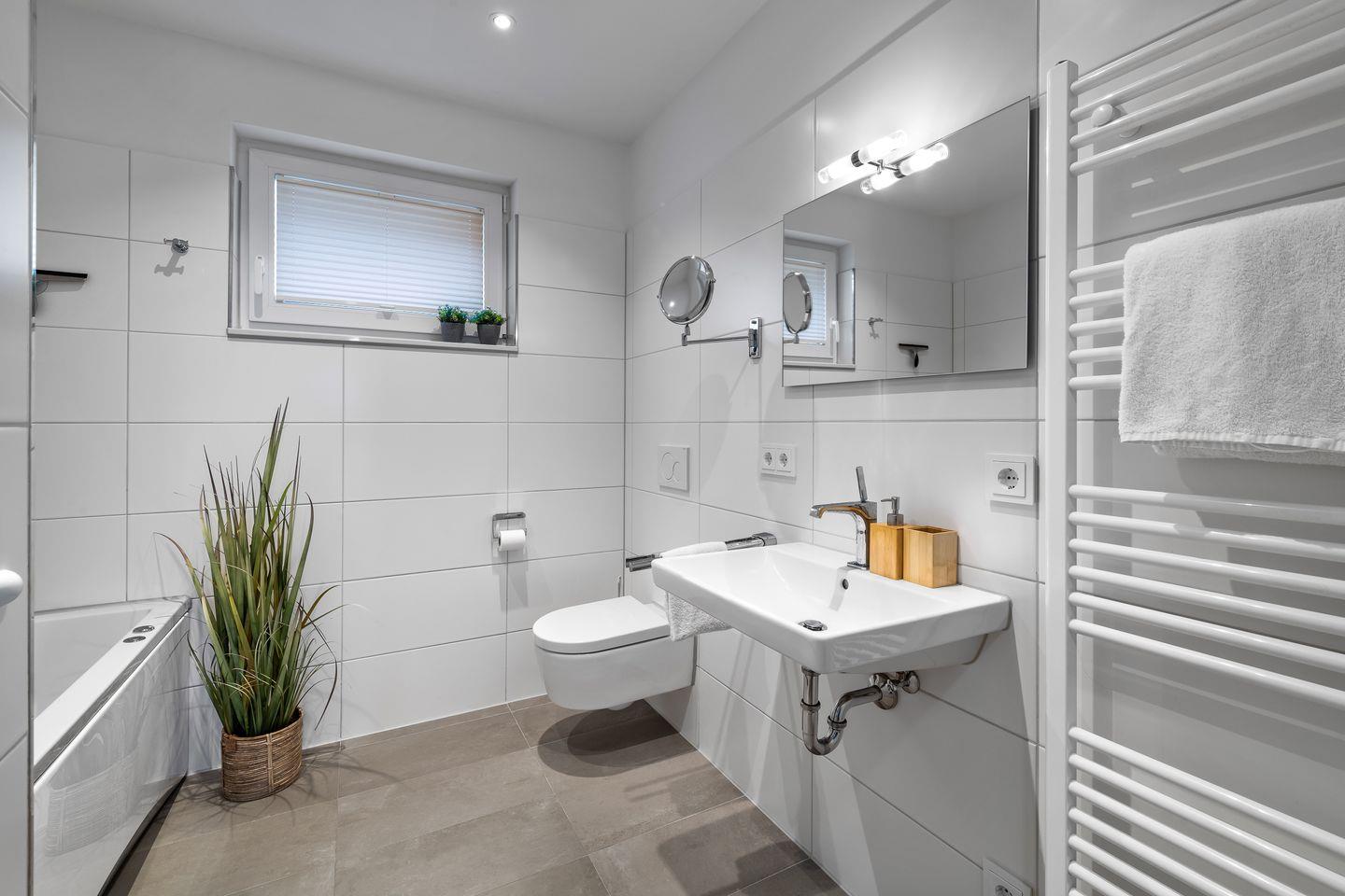 Das moderne Badezimmer lässt keine Wünsche offen und verfügt über eine Whirlwanne, in der es sich herrlich nach einem ereignisreichen Urlaubstag entspannen lässt.