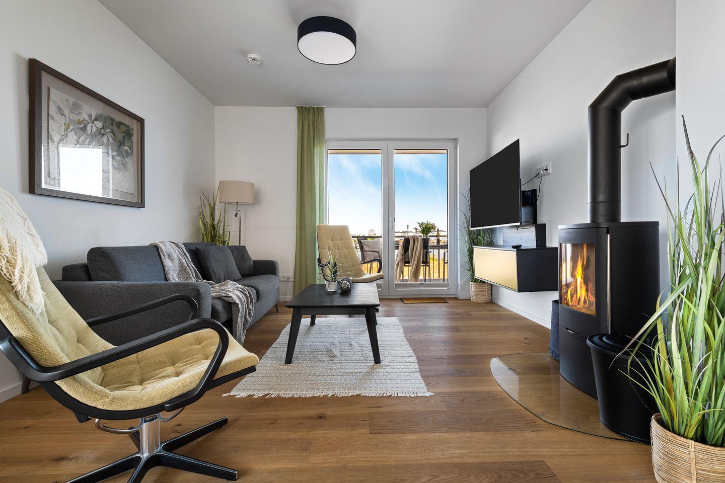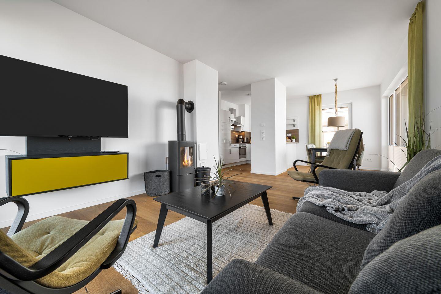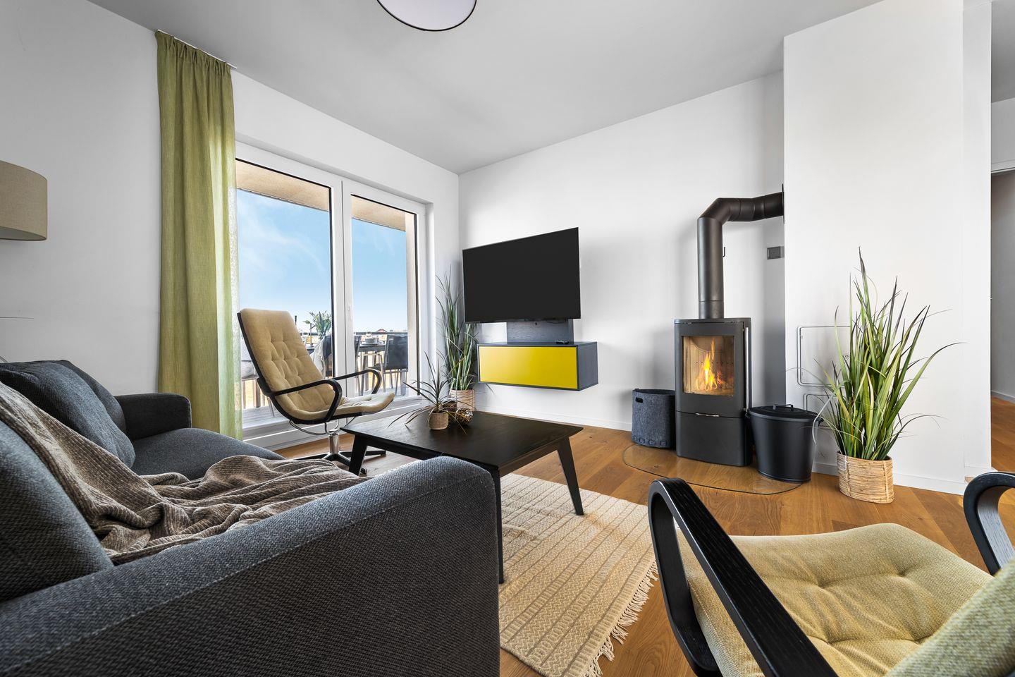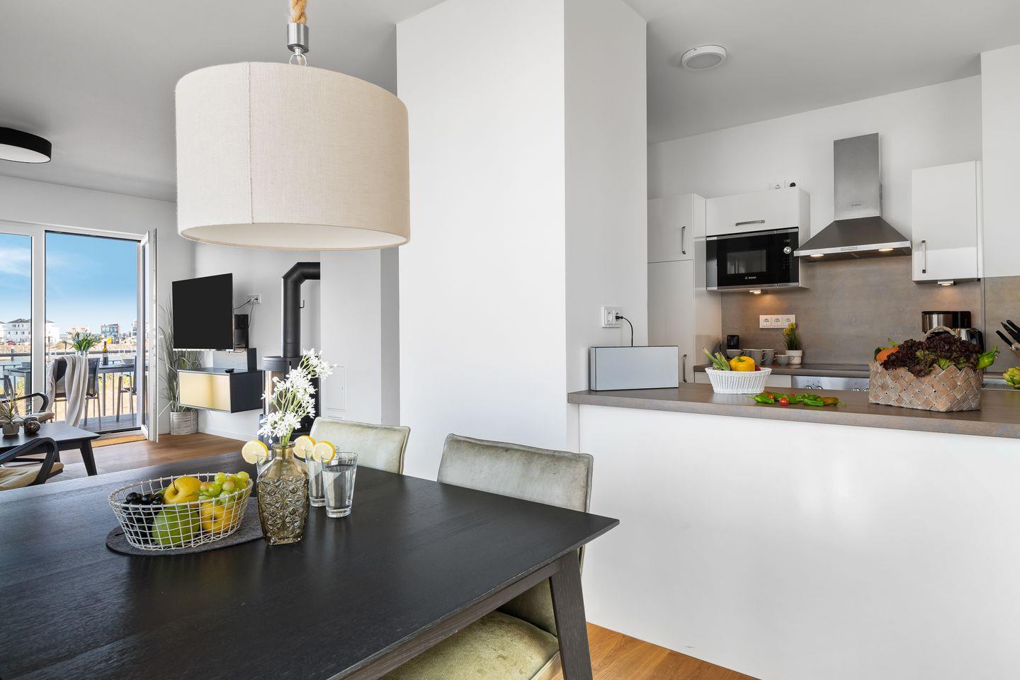 Das elegant-maritim eingerichtete Apartment besticht besonders durch den traumhaft freien Blick auf die Ostsee. Durch die verglaste Front des Koch- und Wohnbereichs fällt der Blick immer ins Blaue, während man es sich auf den bequemen Sitzmöbeln gemütlich macht. Ein Kamin trägt, besonders in der kalten Jahreszeit, zur wohligen Stimmung bei. Mit einem Glas Wein in der Hand vor knisterndem Kaminfeuer, während draußen die Ostsee tobt - was gibt es Schöneres?