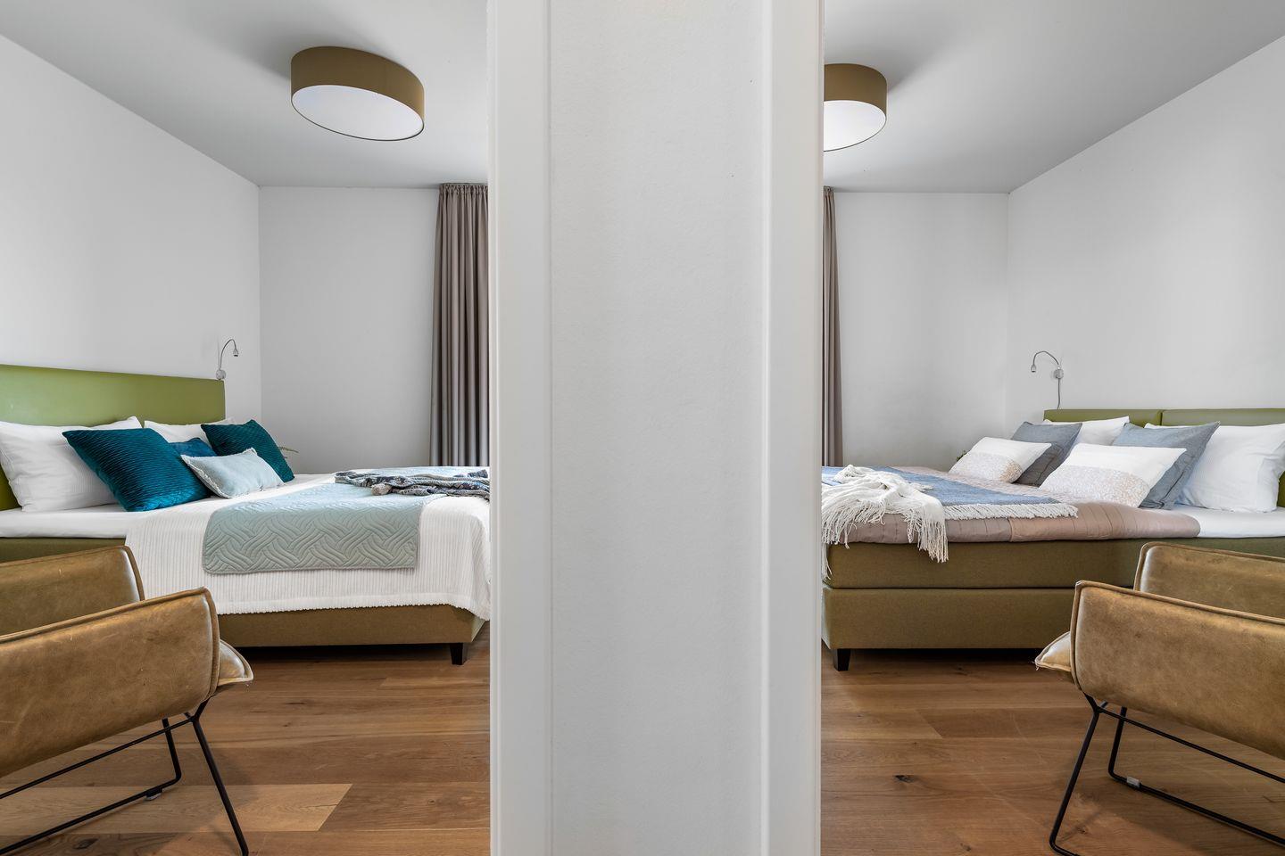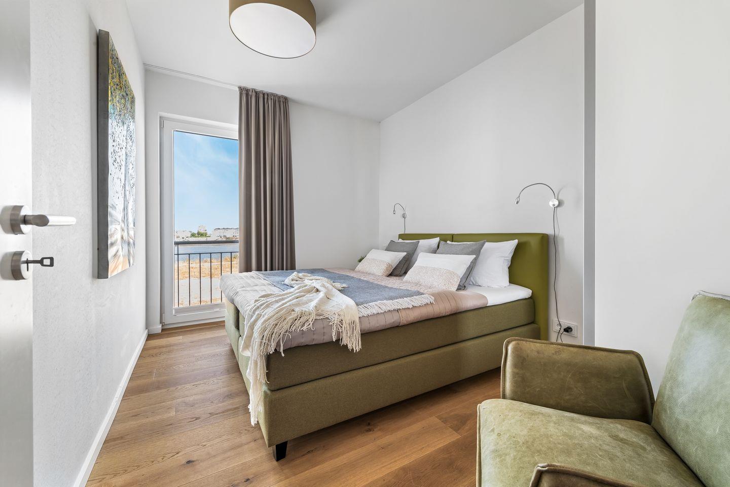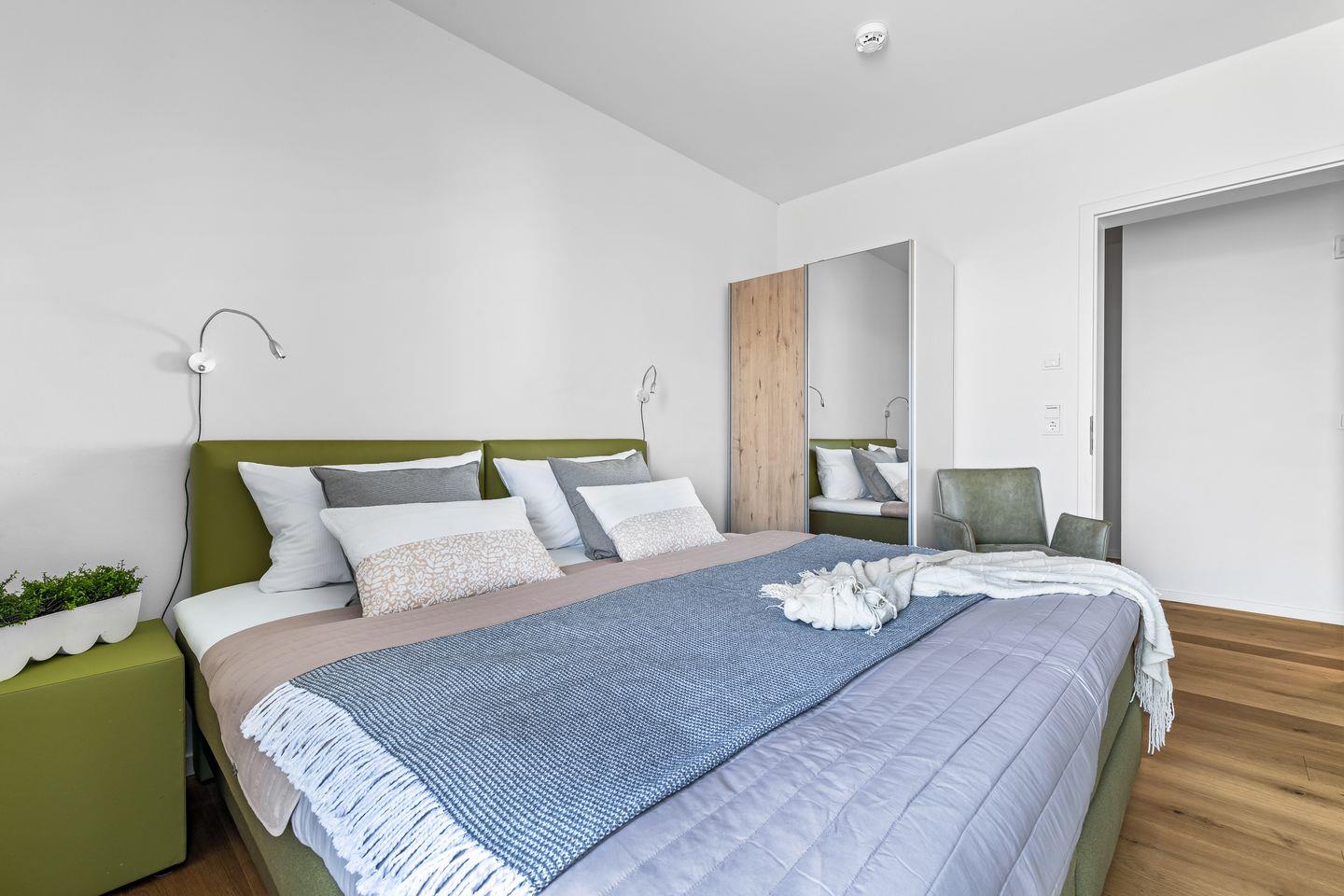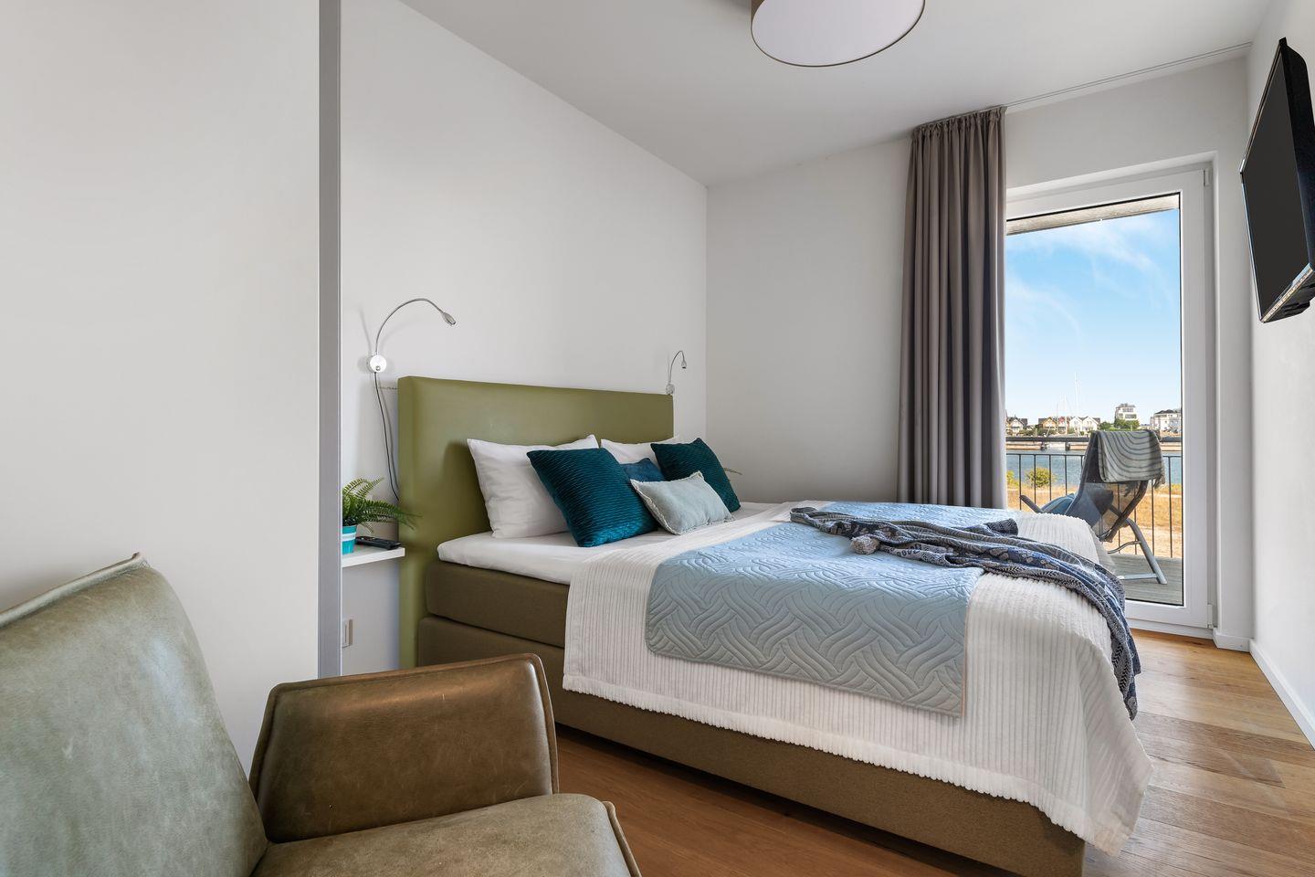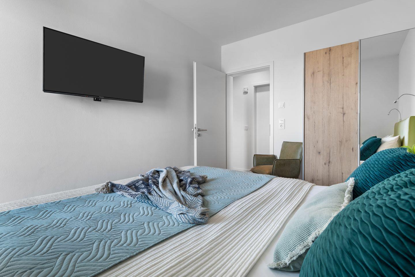 Zwei Schlafzimmer bieten Platz für vier Gäste und verfügen über große Boxspringbetten, Kleiderschränke und bodentiefe Fenster. Aufwachen mit Blick ins Blaue. Eines der beiden Schlafzimmer besitzt außerdem einen Flatscreen.