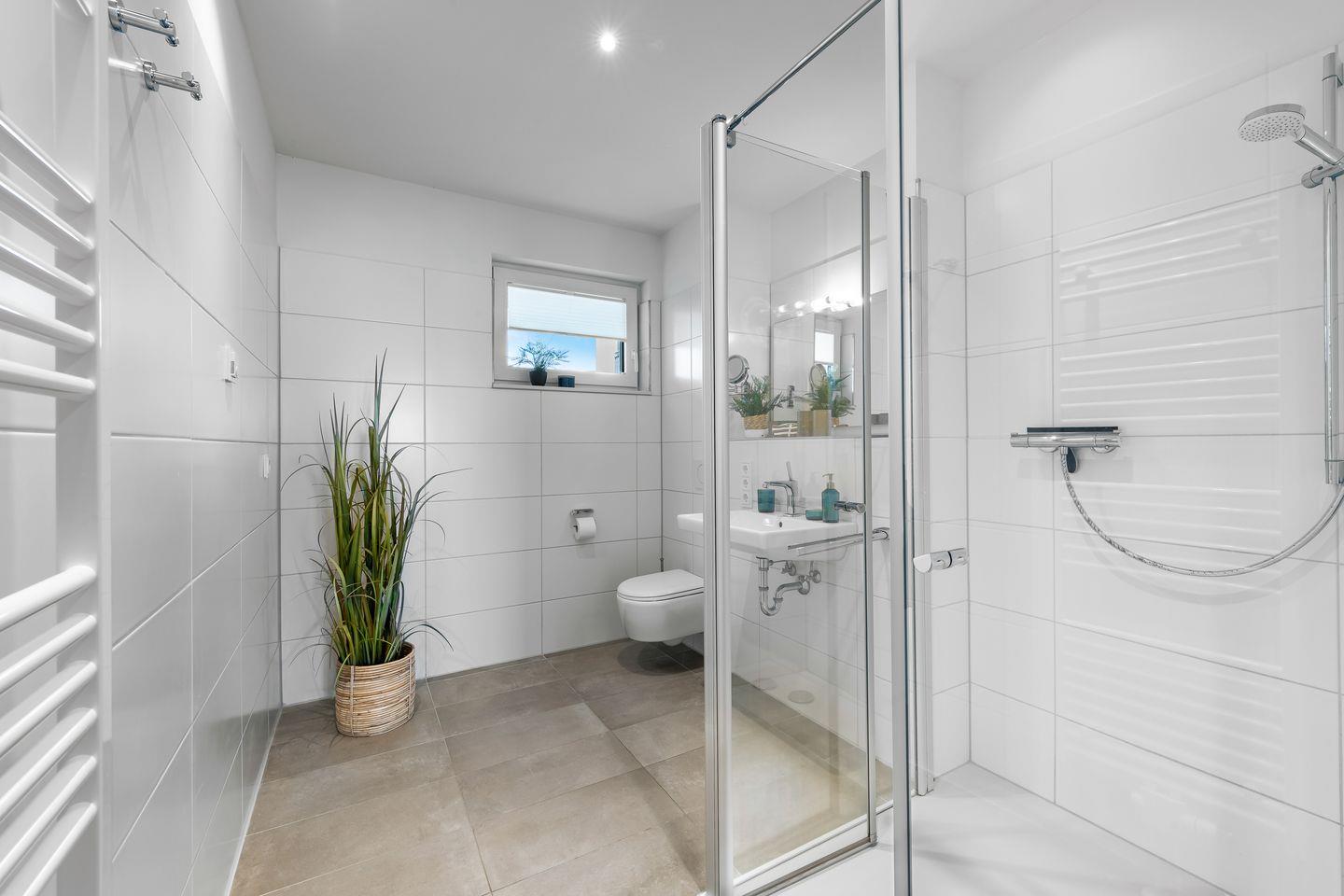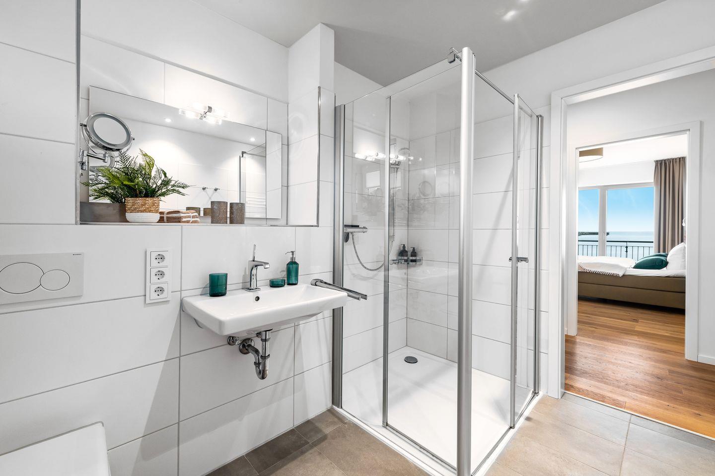 Die Ferienwohnung "Ocean Water" ist ein wahrer Wohlfühlort ist das moderne Badezimmer mit großer, bodengleicher Dusche und Fußbodenheizung.