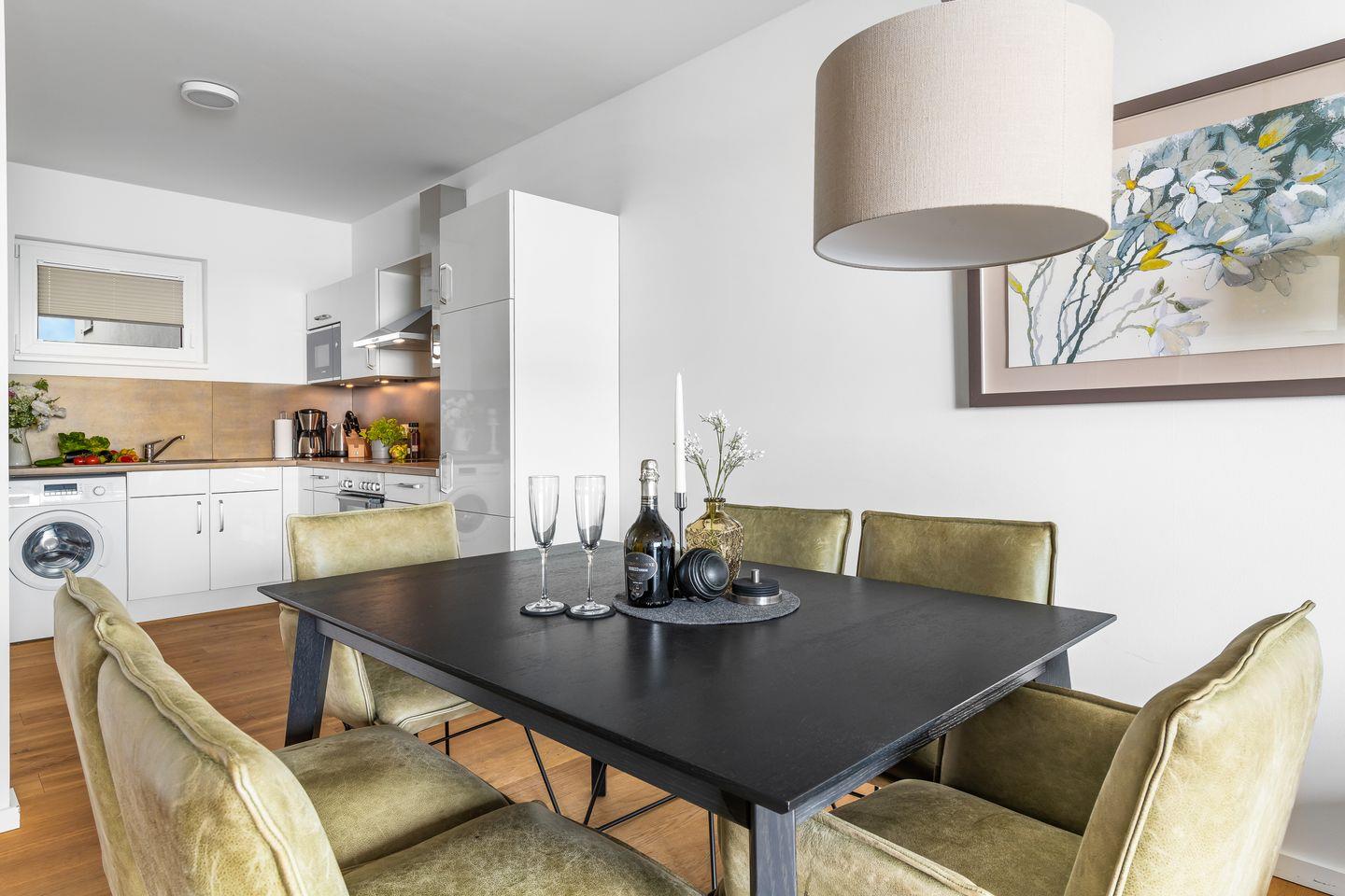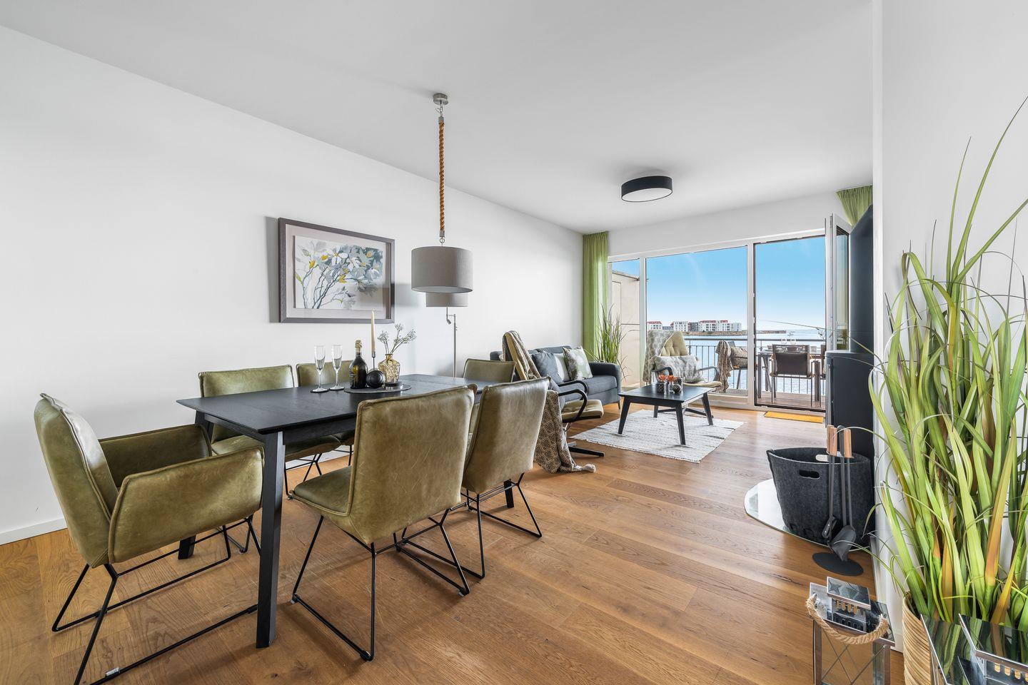 Der hochwertig möblierte Wohnbereich des "Ocean Water" besticht durch die Panoramafront mit direktem Blick ins Blaue. Auch an Tagen, an denen die Ostsee tobt, sorgt ein Kaminofen und ein Flatscreen für Urlaubsgemütlichkeit. Der Wohnbereich erstreckt sich direkt in den voll ausgestatteten Koch- und Essbereich, hier wird jeder Hobby-Koch glücklich. Der offen gestaltete Raum ermöglicht ein herrliches Beisammensein, beim Kochen und Entspannen.