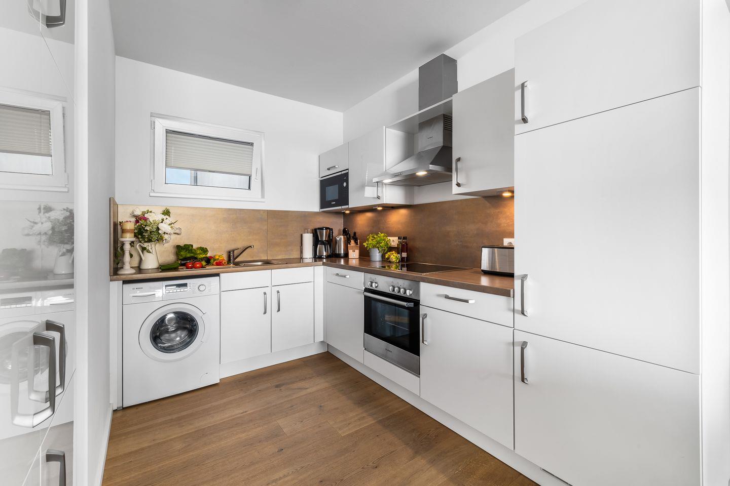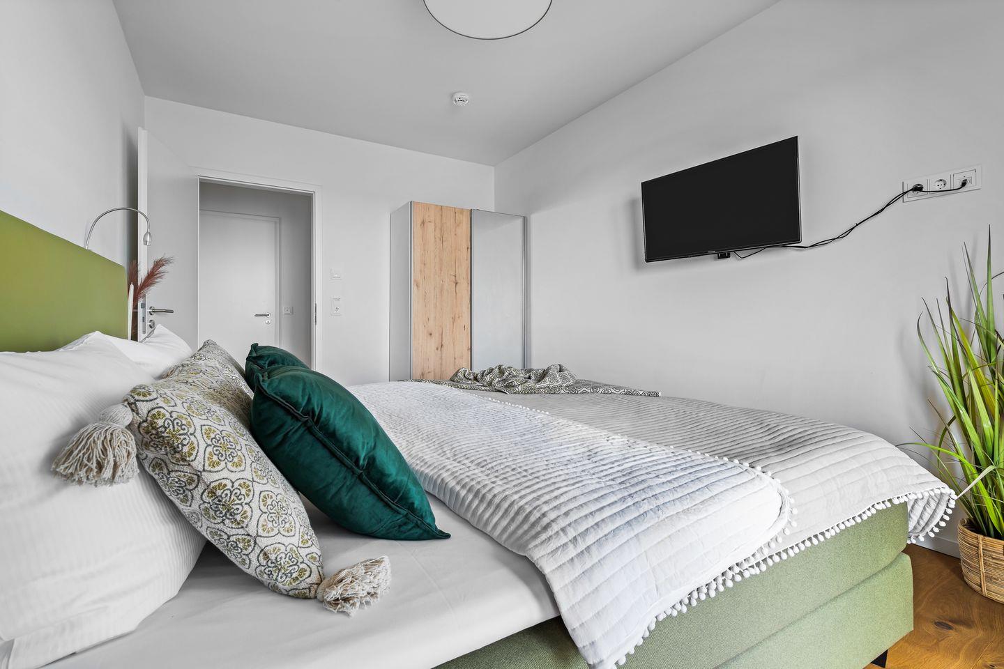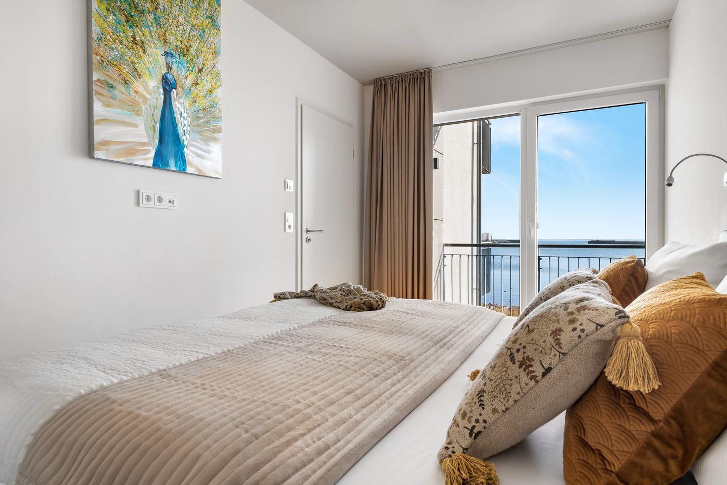 Die zwei Schlafzimmer leuchten in einem hellen Grünton und verfügen über große, gemütliche Boxspringbetten, Kleiderschränke und bodentiefe Fenster. Aufwachen mit Meerblick, was gibt es Schöneres?