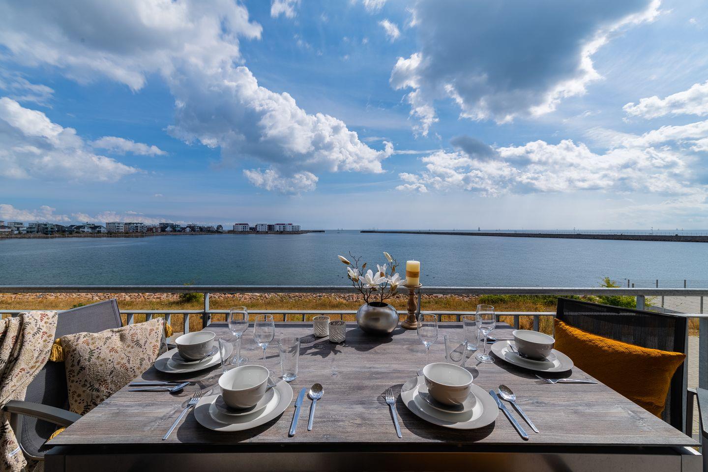 Der traumhafte Balkon bietet einen weiten Blick auf das Hafenkino und die vorbeiziehenden Segelschiffe. Eine hochwertige Sitzgarnitur sowie Sonnenliegen stehen bereit um erholsame Sonnenstunden zu genießen.