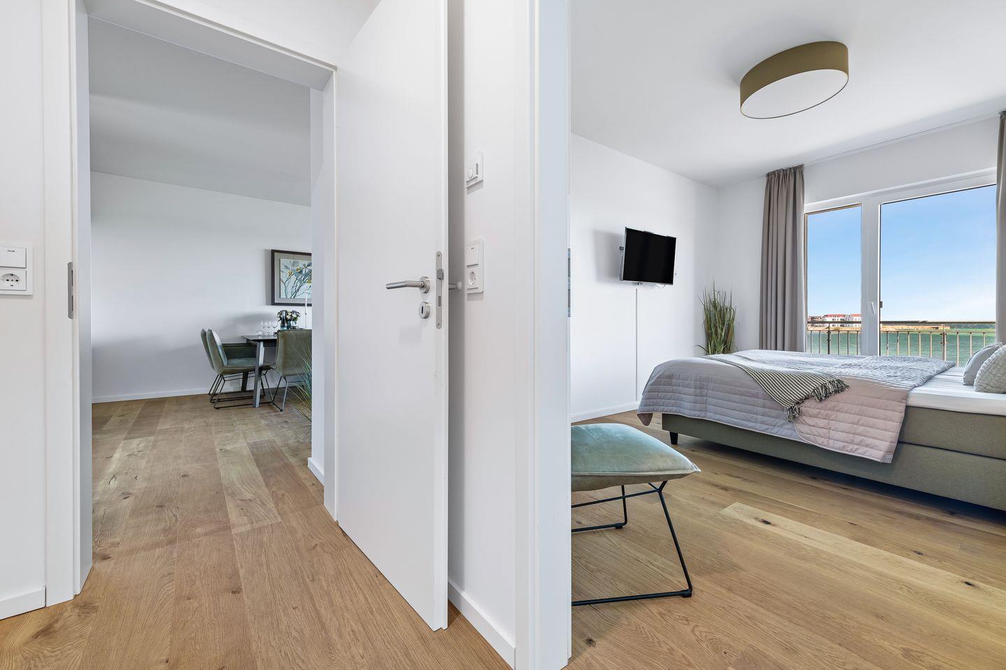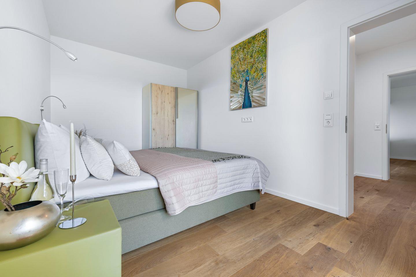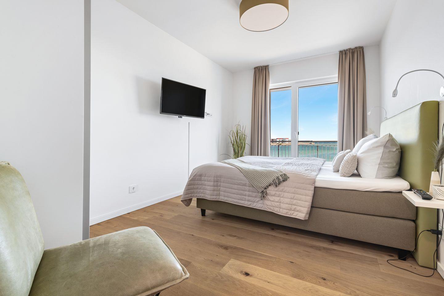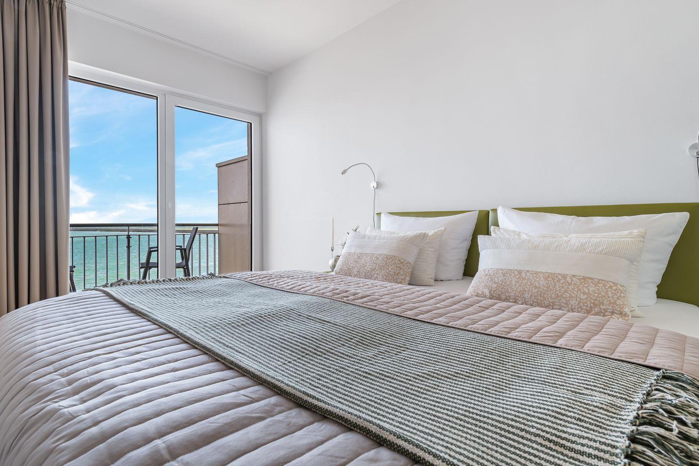 Die Schlafzimmer sind in hellen Erd- und Grüntönen gehalten und verfügen über hochwertige Boxspringbetten und bodentiefe Fenster. Diese ermöglichen einen traumhaften Blick ins Blaue.