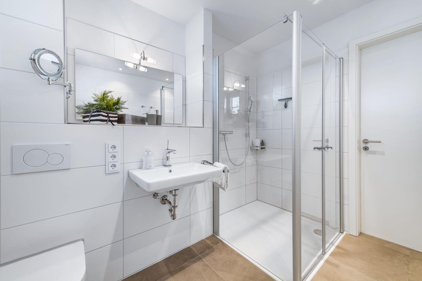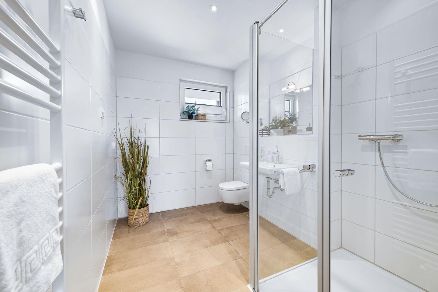 Das moderne Badezimmer mit großer, ebenerdiger Dusche und Fußbodenheizung lässt ebenfalls keine Wünsche offen.