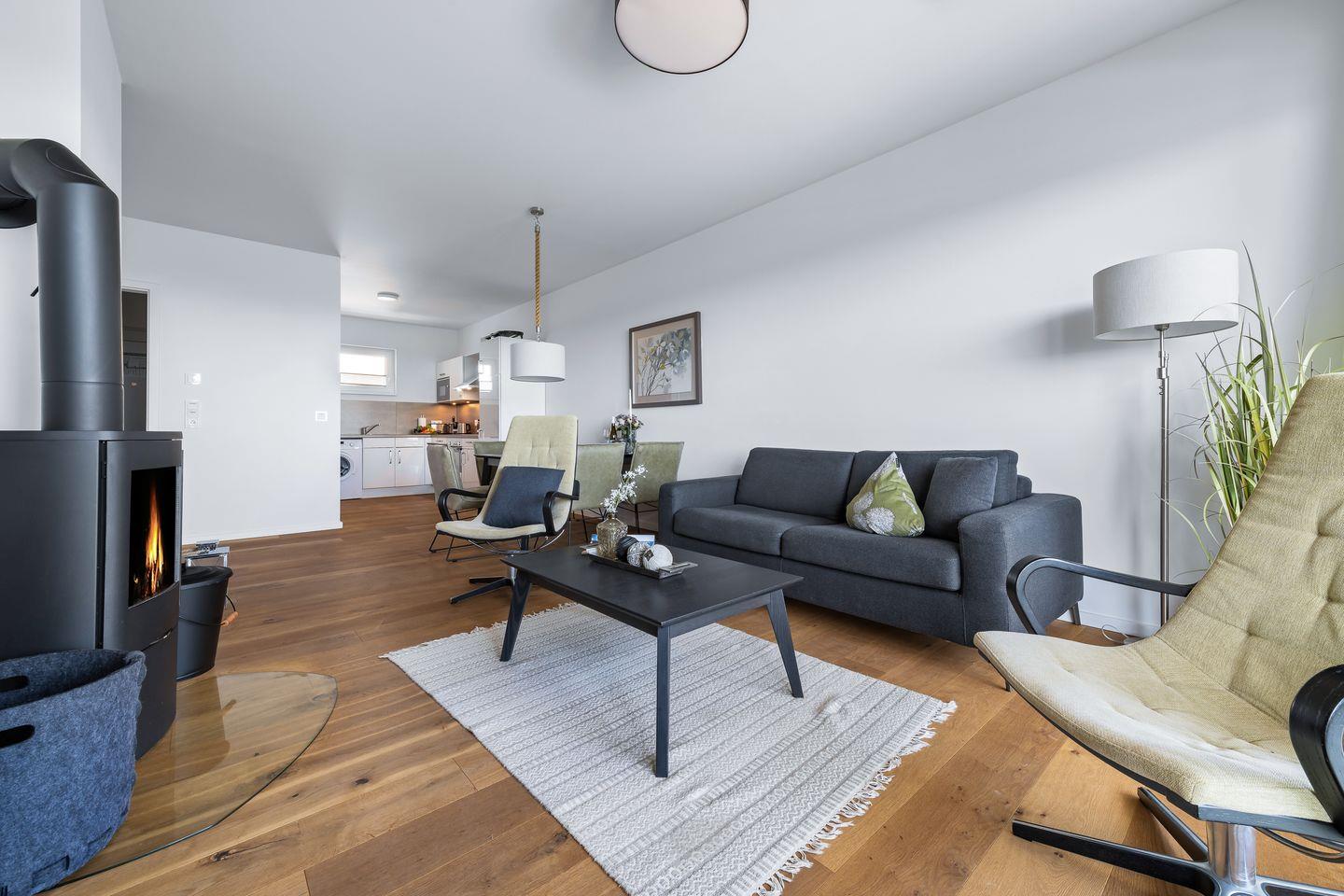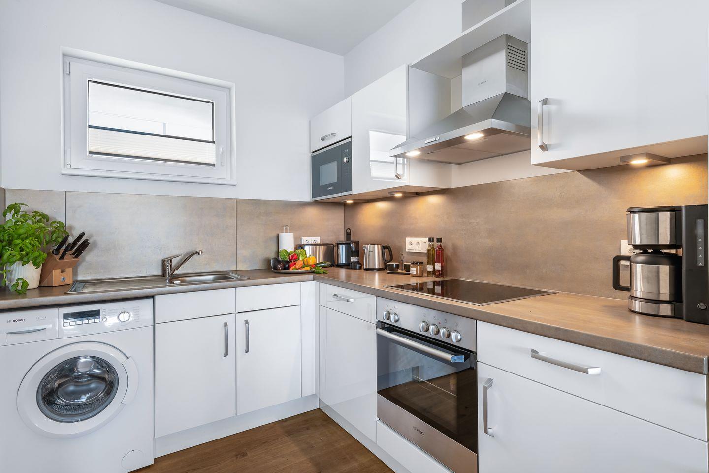 Ein wahrer Wohlfühlort ist der stilvoll möblierte Wohnbereich mit hellem Parkettboden, der durch die Panoramafront einen herrlichen Blick auf die Ostsee bietet. Für Gemütlichkeit sorgt außerdem ein Kaminofen und bequeme Sitzmöbel. Direkt an den Wohnbereich schließt die hochwertige Einbauküche an, sie ist mit allem ausgestattet, was das Hobbykoch-Herz begehrt. Während das Kochens blickt man auf die vorbeiziehenden Segelschiffe - was will man Meer?
