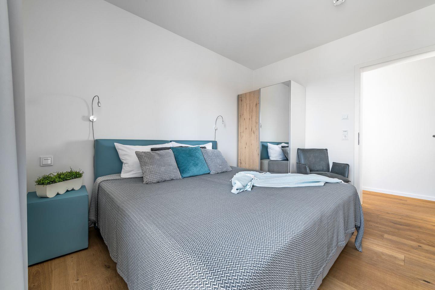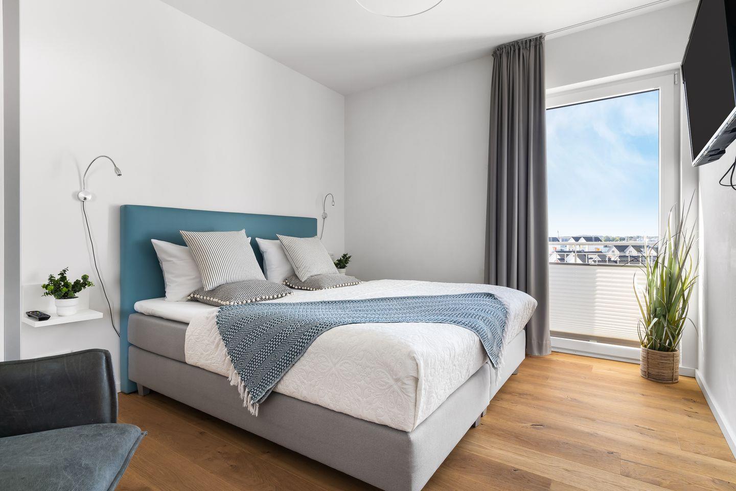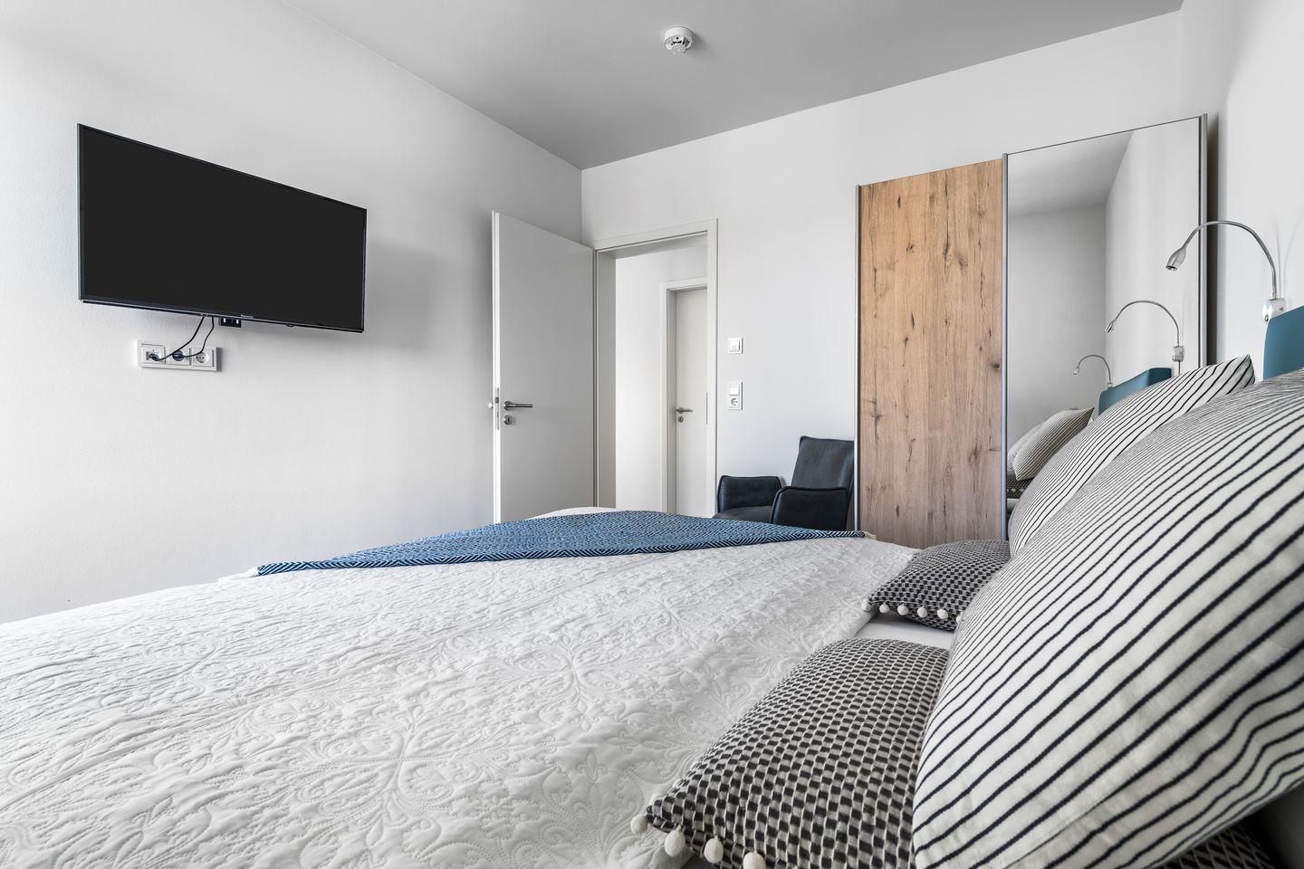 Zwei Schlafzimmer mit bodentiefen Fenstern, die sich durch Gardinen abdunkeln lassen, und bequemen Boxspringbetten garantieren geruhsame Nächte. Von hier aus haben unsere Gäste ebenfalls einen schönen Blick auf das Hafenkino.