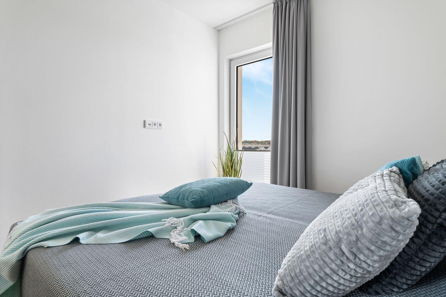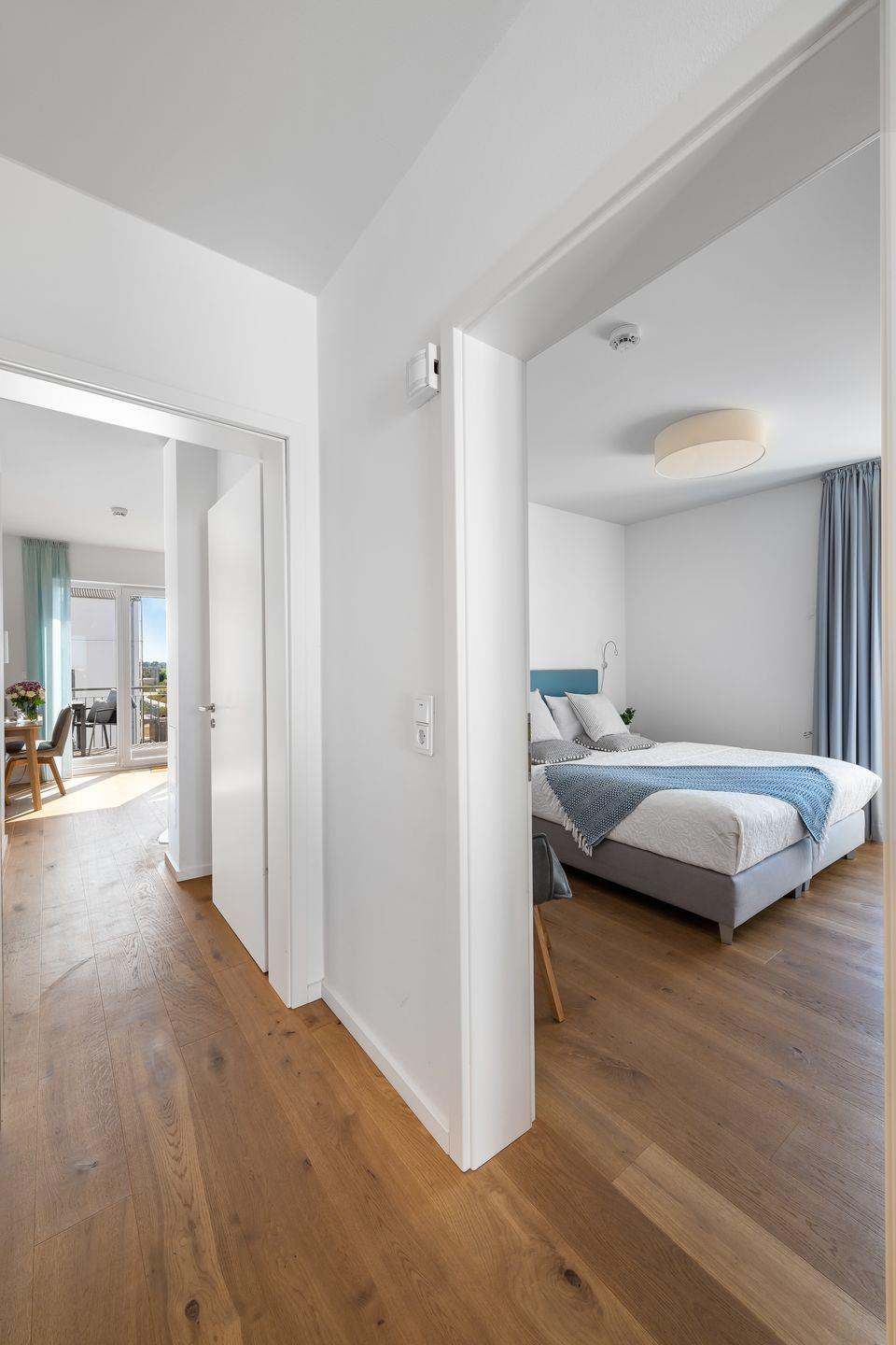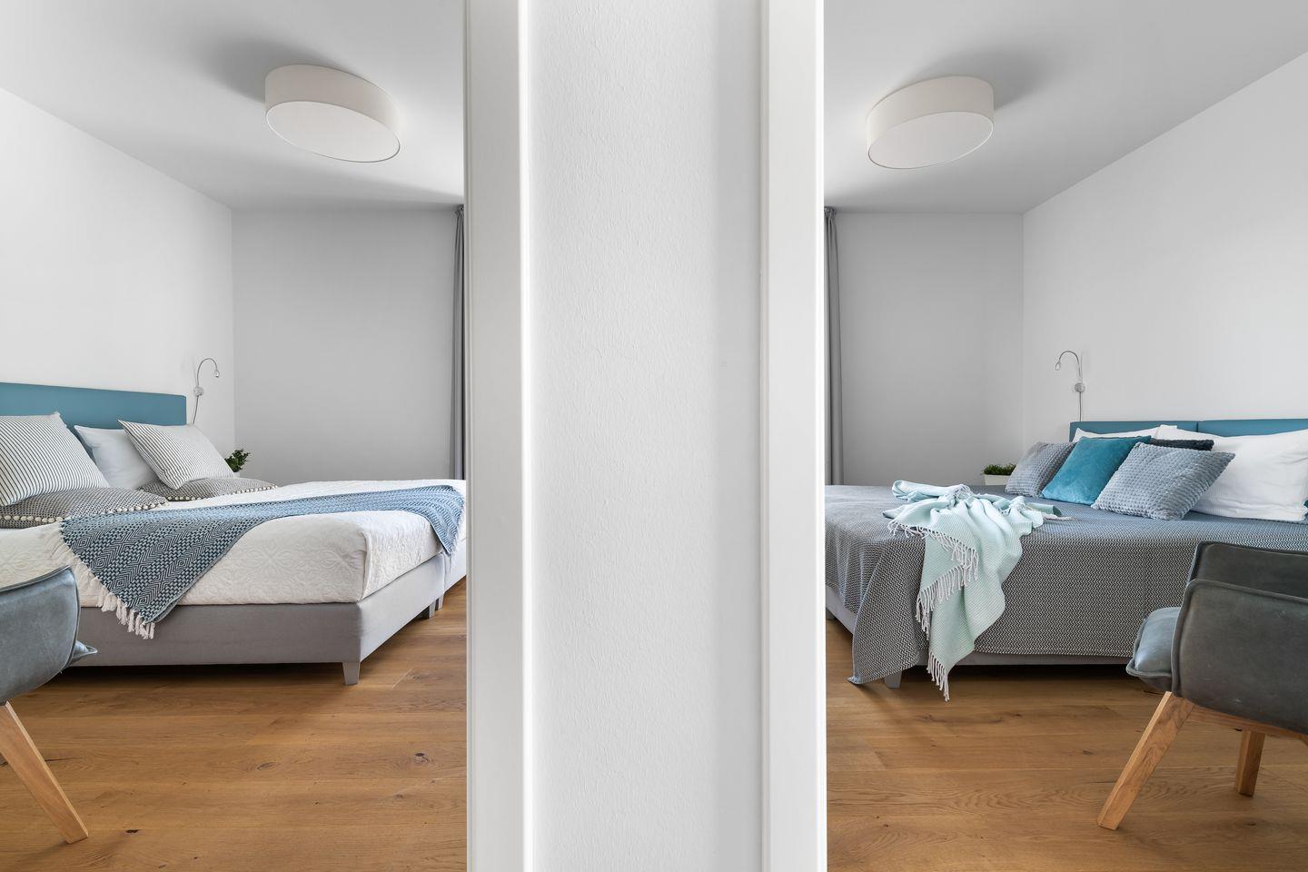 Zwei Schlafzimmer mit bodentiefen Fenstern, die sich durch Gardinen abdunkeln lassen, und bequemen Boxspringbetten garantieren geruhsame Nächte. Von hier aus haben unsere Gäste ebenfalls einen schönen Blick auf das Hafenkino.