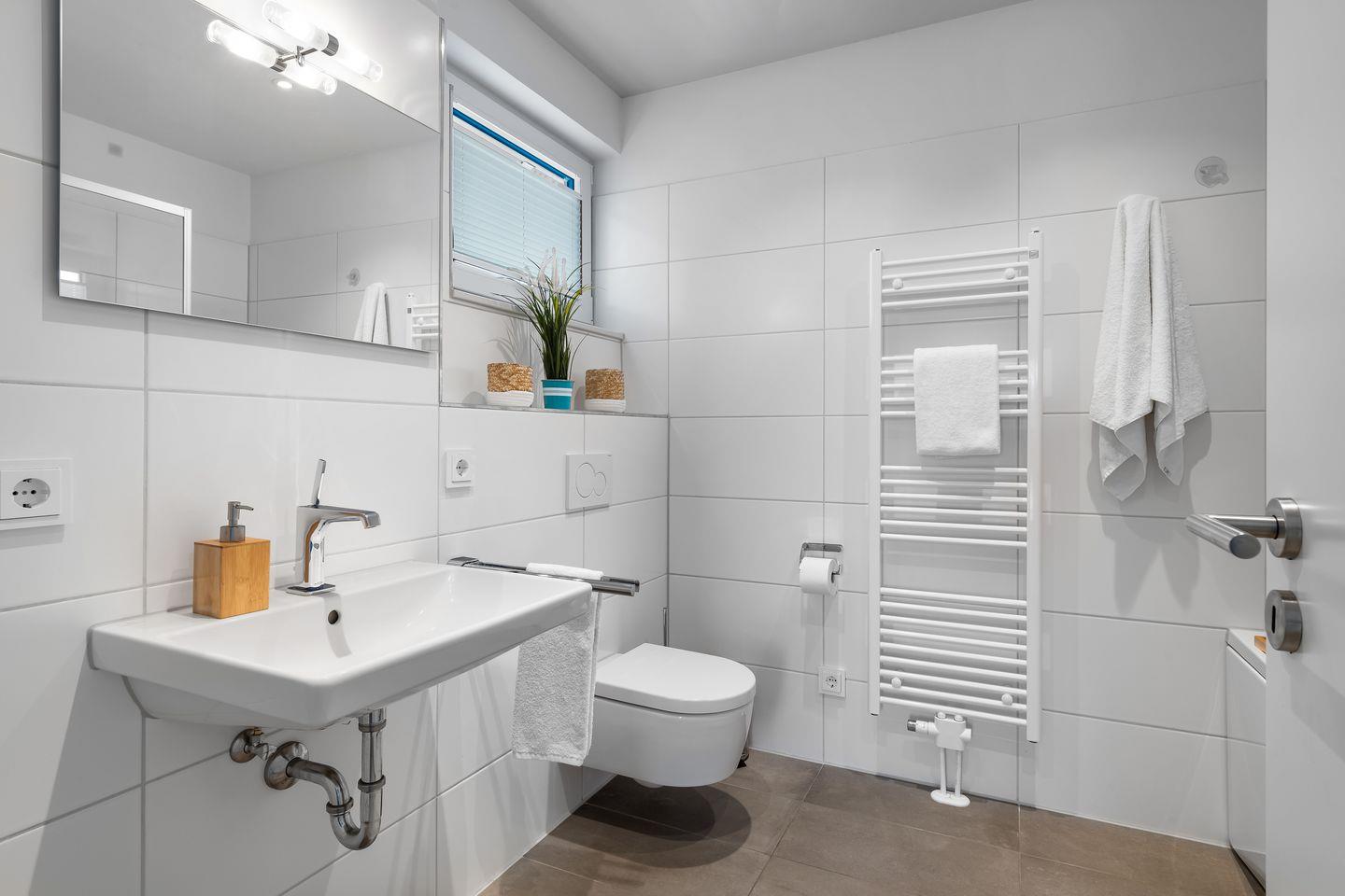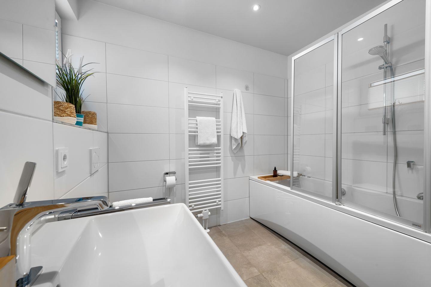 Das moderne Badezimmer verfügt über eine Whirlwanne und ist somit der ideale Ort für Entspannung.