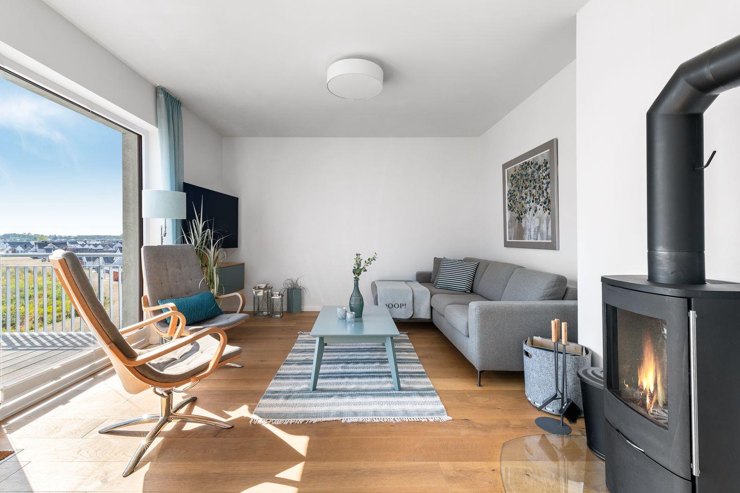 Der nordisch elegante Wohnbereich, des "Ocean Place", lädt mit einer bequemen Sofalandschaft zu entspannten Stunden vor herrlichem Kaminfeuer ein. Für Entertainment sorgt hier ein großer Flatscreen. Die bodentiefen Panoramafenster spiegeln die unterschiedlichen Lichtverhältnisse perfekt wieder und ermöglichen zu jeder Zeit einen Blick auf die Weite des Meeres.