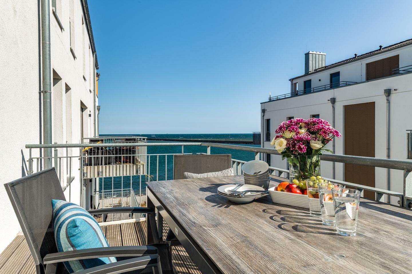 Der traumhafte Balkon bietet einen weiten Blick auf das Hafenkino und die vorbeiziehenden Segelschiffe. Eine hochwertige Sitzgarnitur sowie Sonnenliegen stehen bereit um erholsame Sonnenstunden zu genießen.