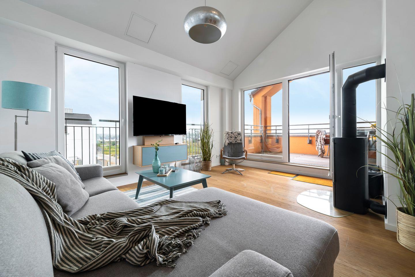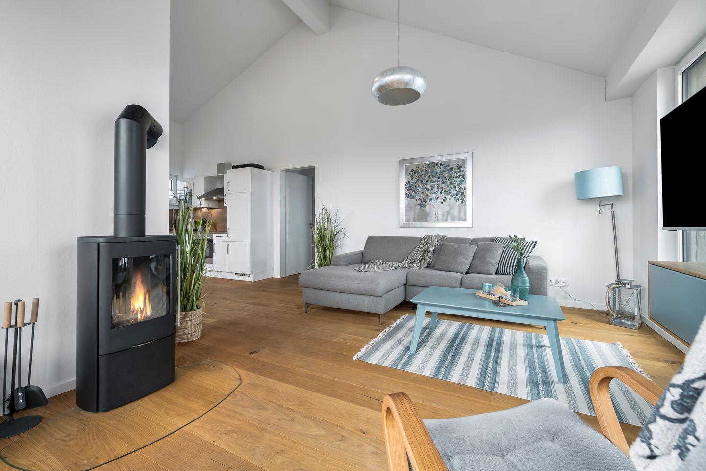 Vom offenen Wohnbereich aus blickt man ebenfalls ins Blaue. Bei knisterndem Kaminfeuer kann man es sich hier auch an „Schietwetter"-Tagen auf den komfortablen Sitzmöbeln gemütlich machen, während der Regen auf die Ostsee peitscht.