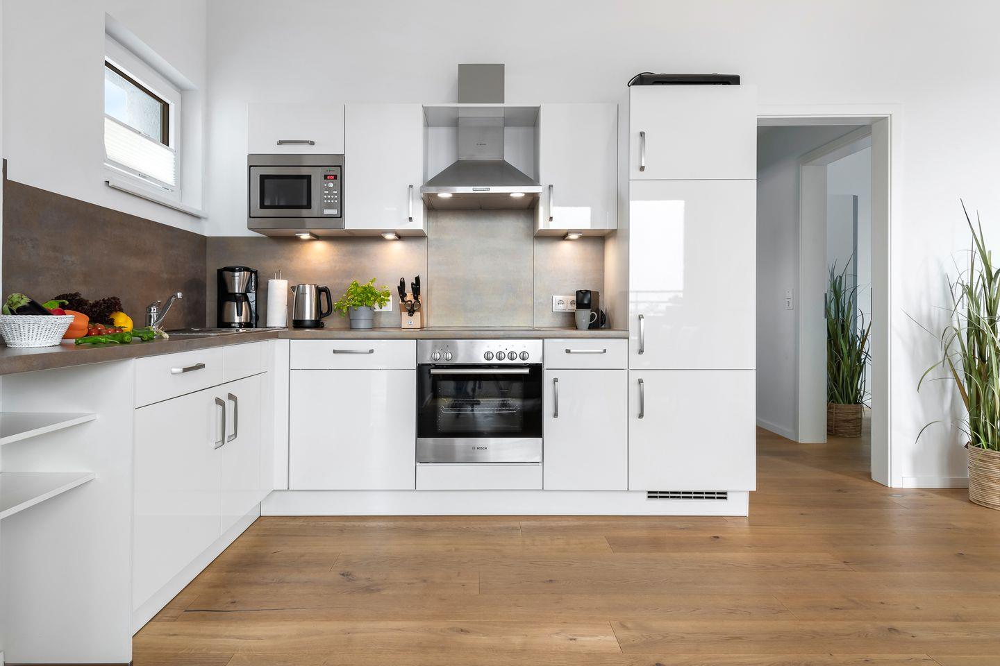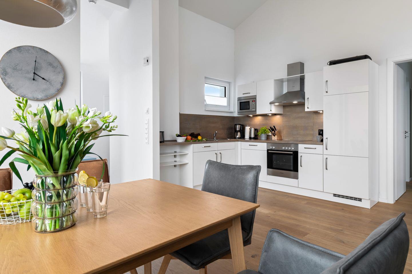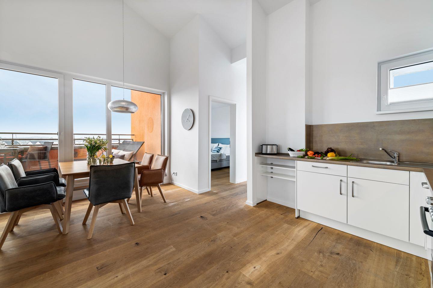 Der helle Koch- und Wohnbereich erwartet unsere Gäste mit einer hochwertig ausgestatteten Einbauküche und einem sich anschließenden Esstisch, der genug Platz für gesellige Abende mit Blick auf die Ostsee bietet. Die bodentiefen Panoramafenster spiegeln die unterschiedlichen Lichtverhältnisse perfekt wieder und ermöglichen zu jeder Zeit einen Blick auf die Weite des Meeres.