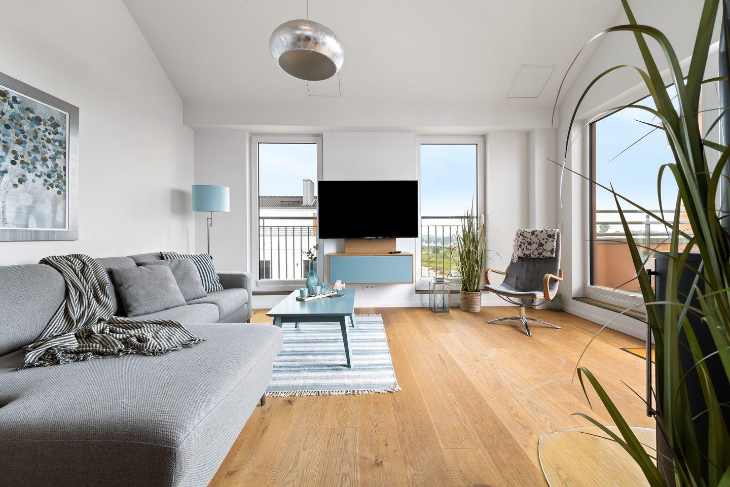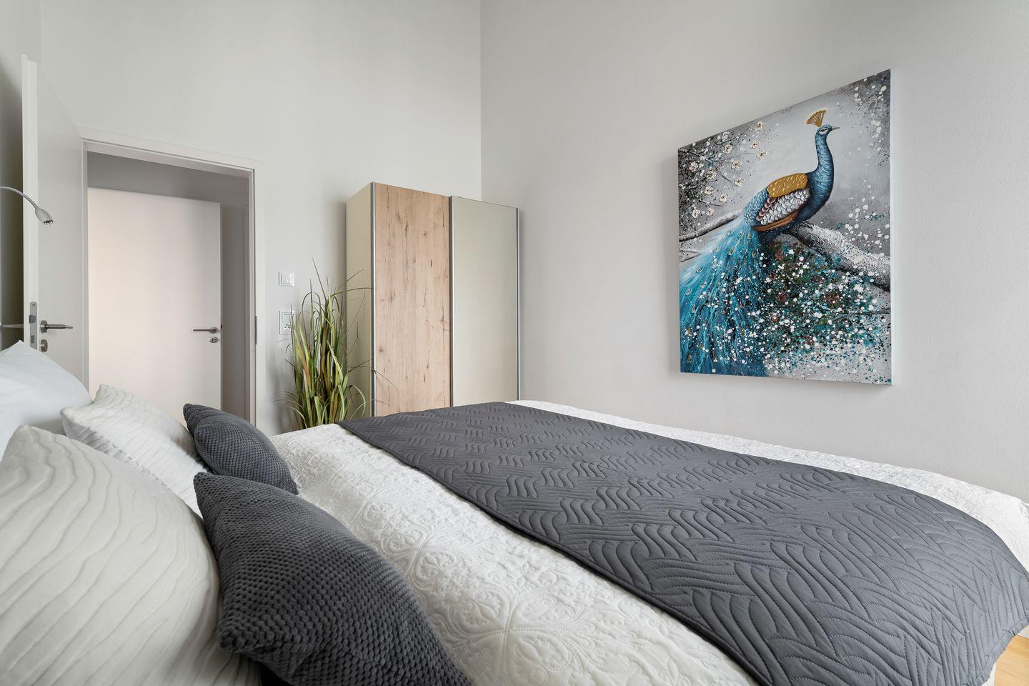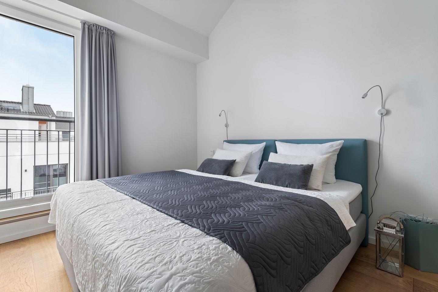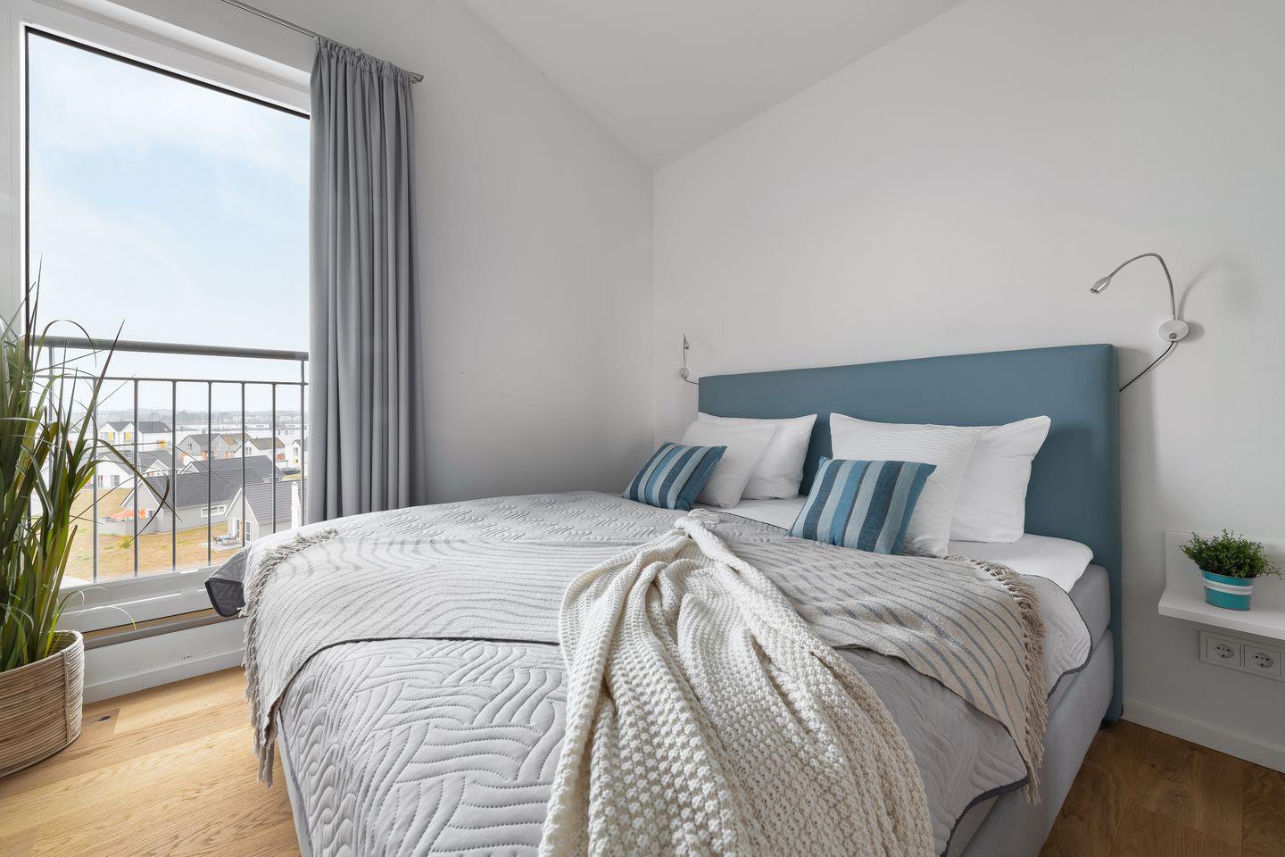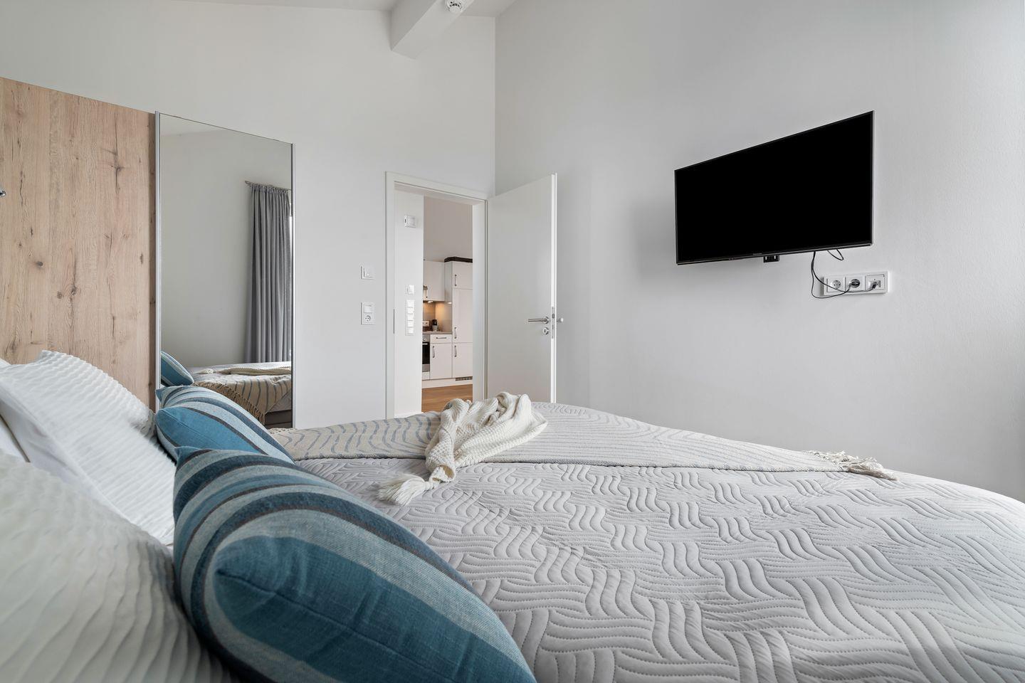 Die beiden Schlafzimmer verfügen über gemütliche Boxspringbetten und bodentiefe Fenster, die sich durch Gardinen abdunkeln lassen. Eines der beiden Schlafzimmer hat außerdem einen Smart-TV.