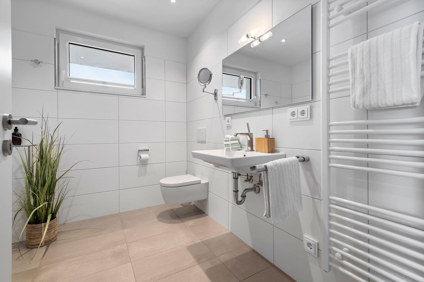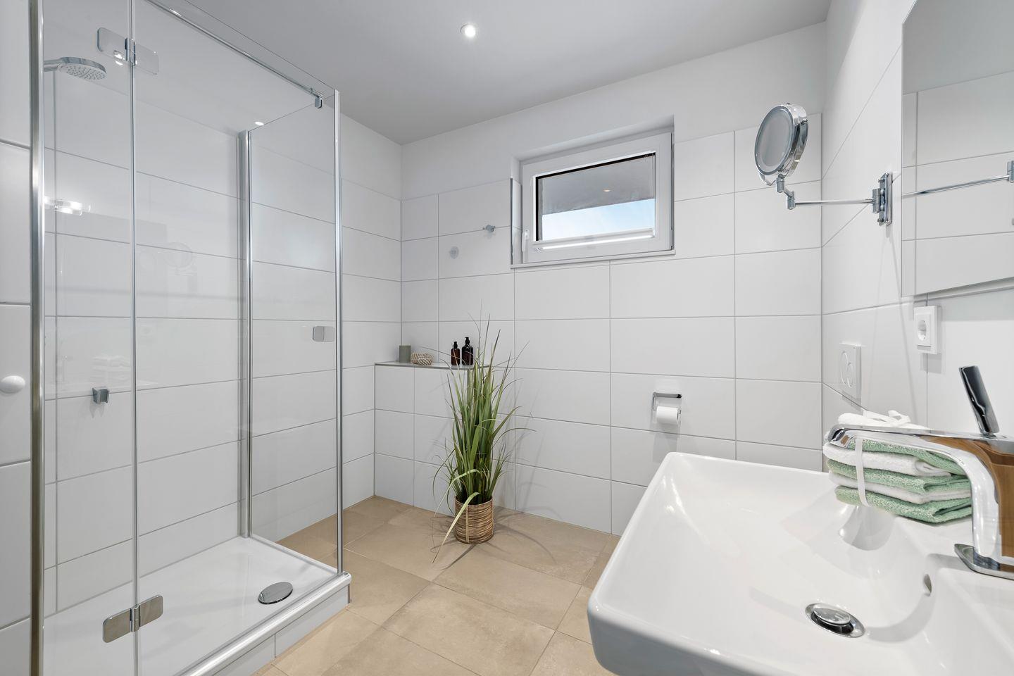 Das Badezimmer mit großer Dusche ist hell und modern gestaltet und lässt keine Wünsche offen.