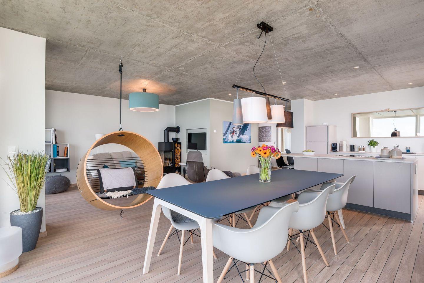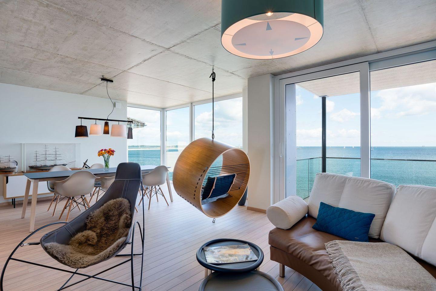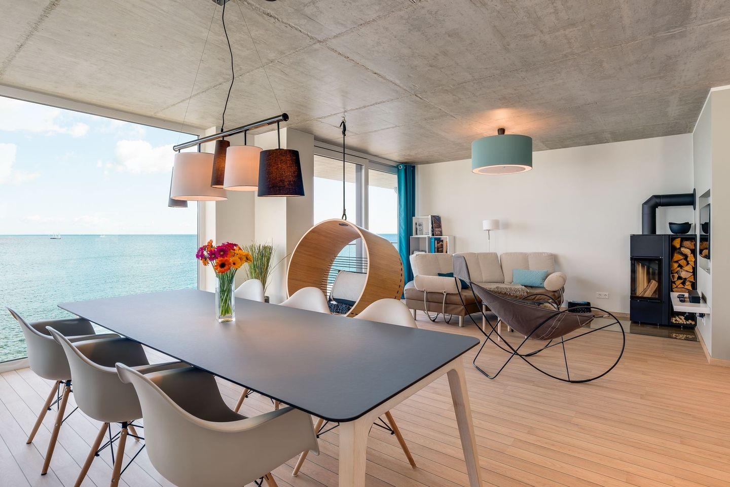 Eine hochwertige Wohnlandschaft, ein extravaganter Kamin, eine komplett ausgestattete Küche und der angrenzende Essbereich bieten Komfort auf ganzer Linie. Von hieraus auf den großen Balkon treten und die frische Ostseeluft einatmen oder beim Sundowner den Sonnenuntergang über der Schlei bewundern. Die hochwertige Möblierung und Überdachung des Balkons ermöglicht auch bei Regen den Aufenthalt an der frischen Luft. Am Morgen beim genussvollen Frühstück den Segelschiffen und Fischerbooten beim Ein- und Auslaufen aus der Schleimündung zuschauen und entspannt in den Tag starten.