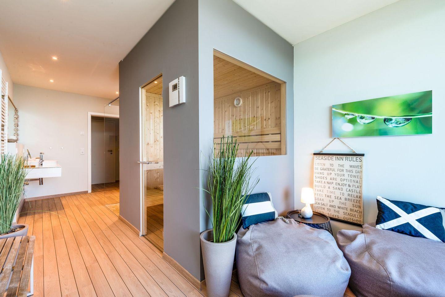 Auch bei schlechtem Wetter bietet die Wohnung allen Komfort. Auch bei schlechtem Wetter laden ein Kamin, eine finnische Sauna und ein Ruhebereich mit Blick auf die freie Ostsee zum Entspannen und ein.