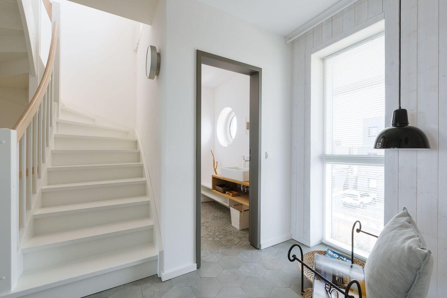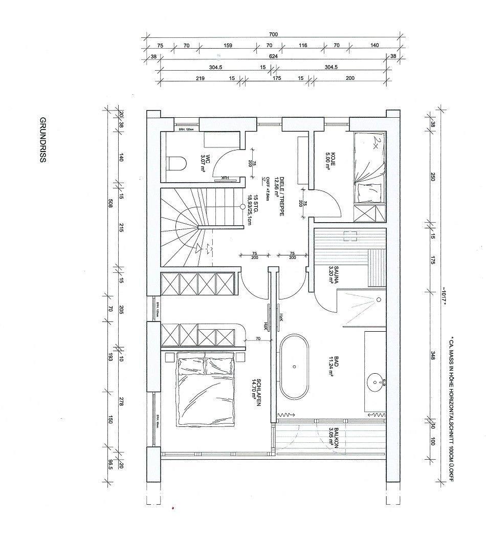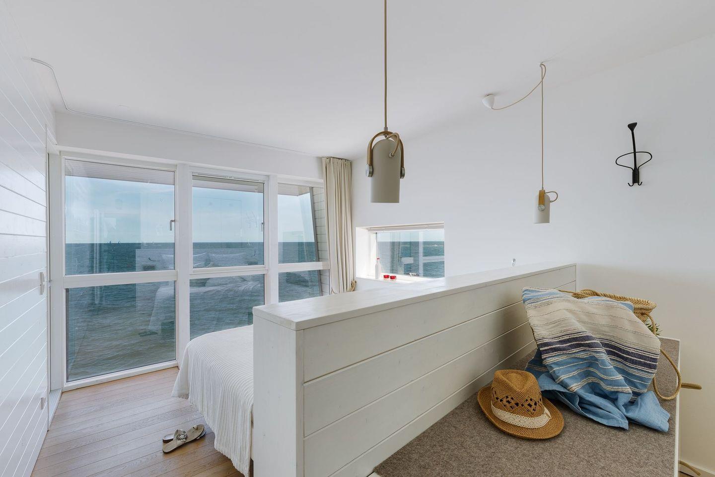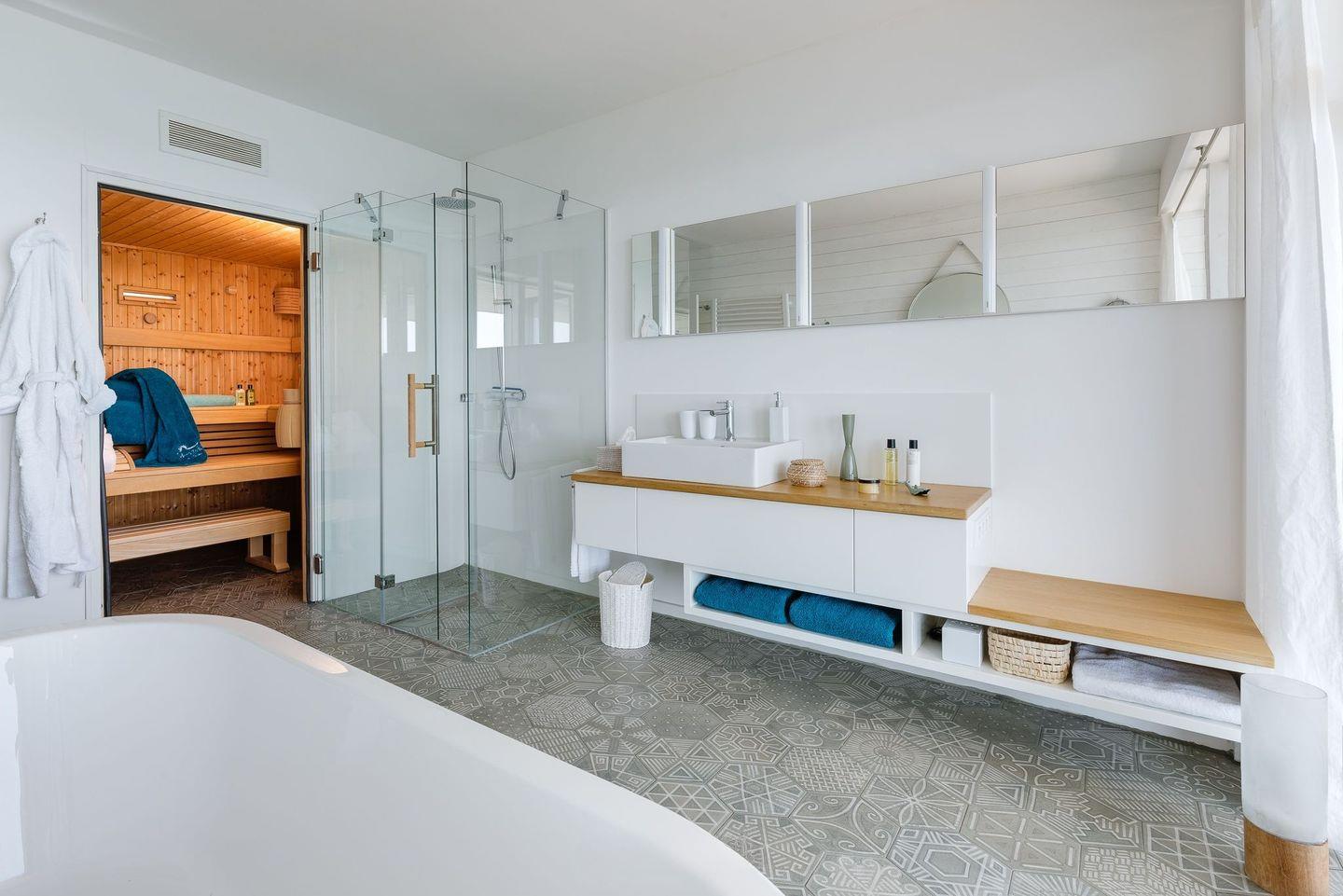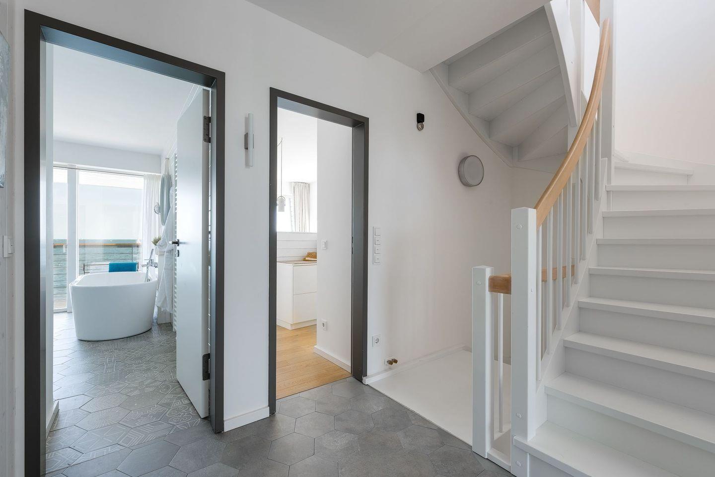 Eine Holztreppe führt Sie in die beiden oberen Etagen. Im „Mitteldeck“ befinden sich 2 weitere Schlafzimmer und ein traumhaftes Wellnessbad - hier können Sie sich in der finnischen Sauna entspannen und auf dem Frischluftbalkon abkühlen. Egal ob Sie in der Sauna schwitzen, unter der bodengleichen Dusche stehen oder in der frei stehenden Badewanne liegen - überall blicken Sie direkt aufs Meer. Zusätzlich befindet sich auf der Etage ein Gäste WC. Im ersten Schlafzimmer erwartet Sie ein herrlich breites Kingsize-Bett sowie ein atemberaubender Blick auf die freie Ostsee, über der Sie morgens die aufgehende Sonne beobachten können. Das zweite Schlafzimmer bietet ein maritimes Hochbett als Koje und einen Kleiderschrank.