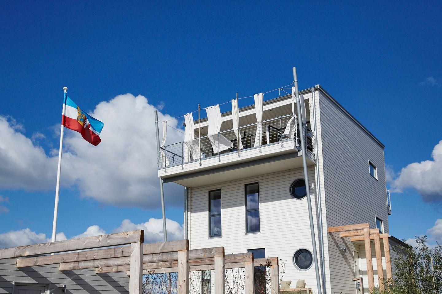 Das exklusive Holzferienhaus, "Auf der Ostsee 22", mit freiem Blick auf die Ostsee und 100 Metern zur Olpenitz Badebucht wurde von Innenarchitekten mit ökologischen Materialien gestaltet und eingerichtet. Im Unterdeck befindet sich eine umlaufende Terrasse, ein Schlafzimmer, Bad und Wirtschaftsräume. Das Mitteldeck beherbergt zwei Schlafräume und ein Wellnessbad mit Meerblick, Sauna und Badewanne. Im obersten Stock gibt es einen offenen Küchen-Essbereich und Wohnraum samt zwei Terrassen.
