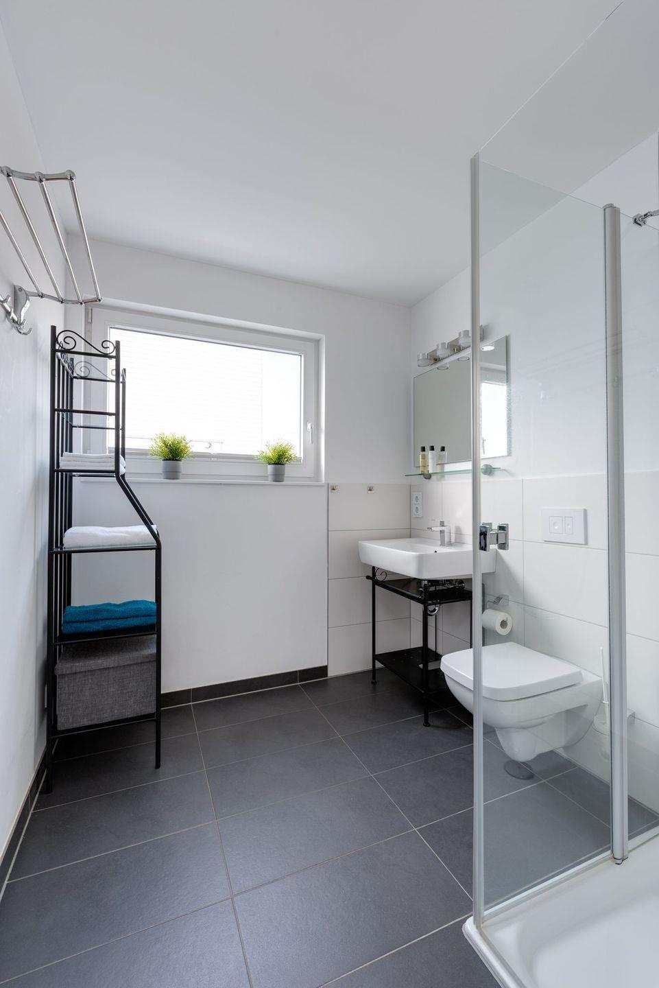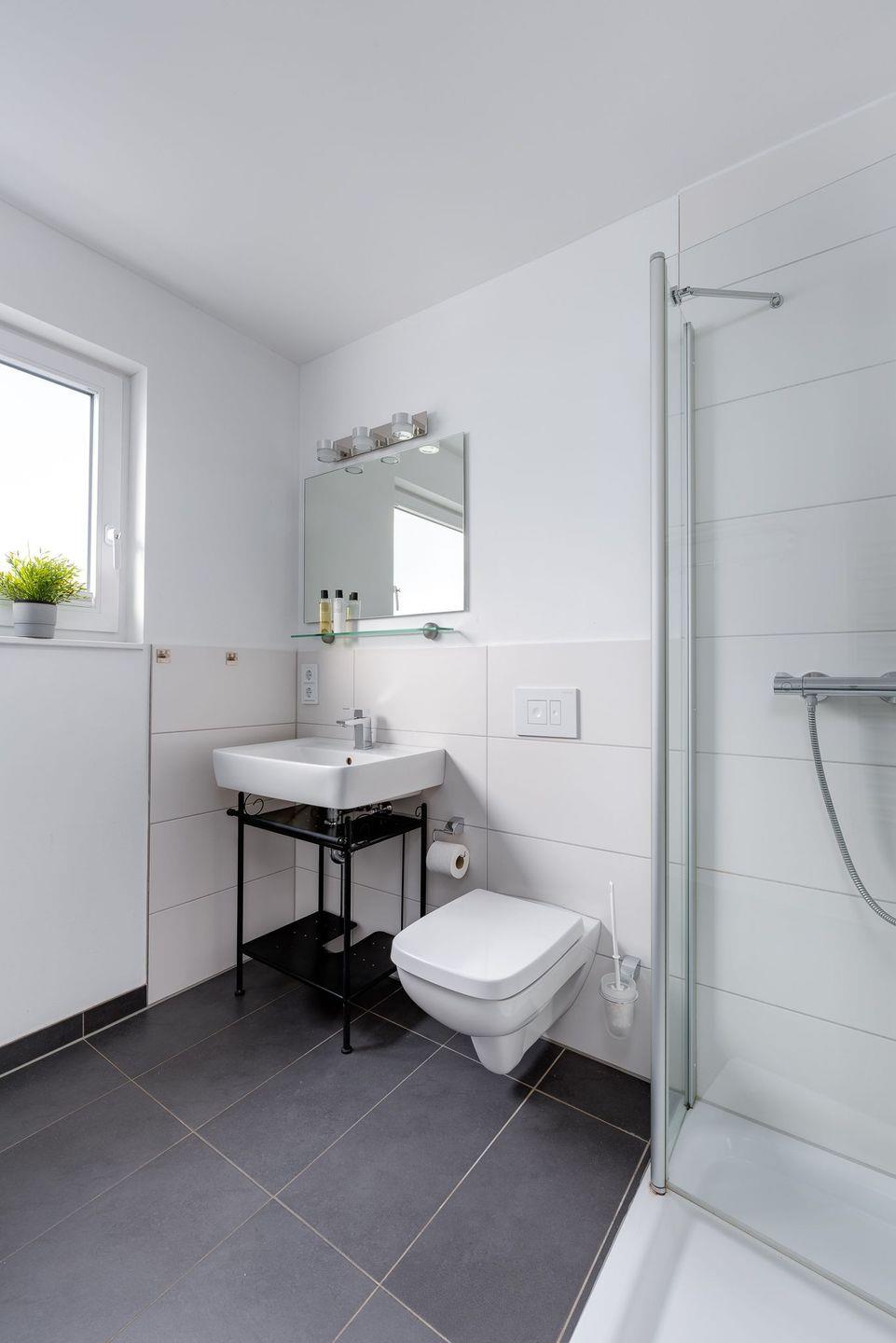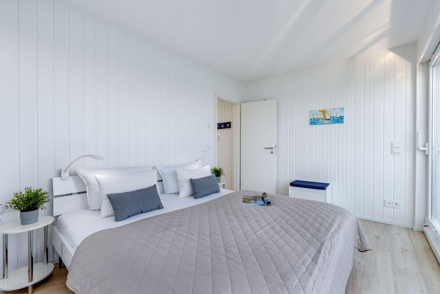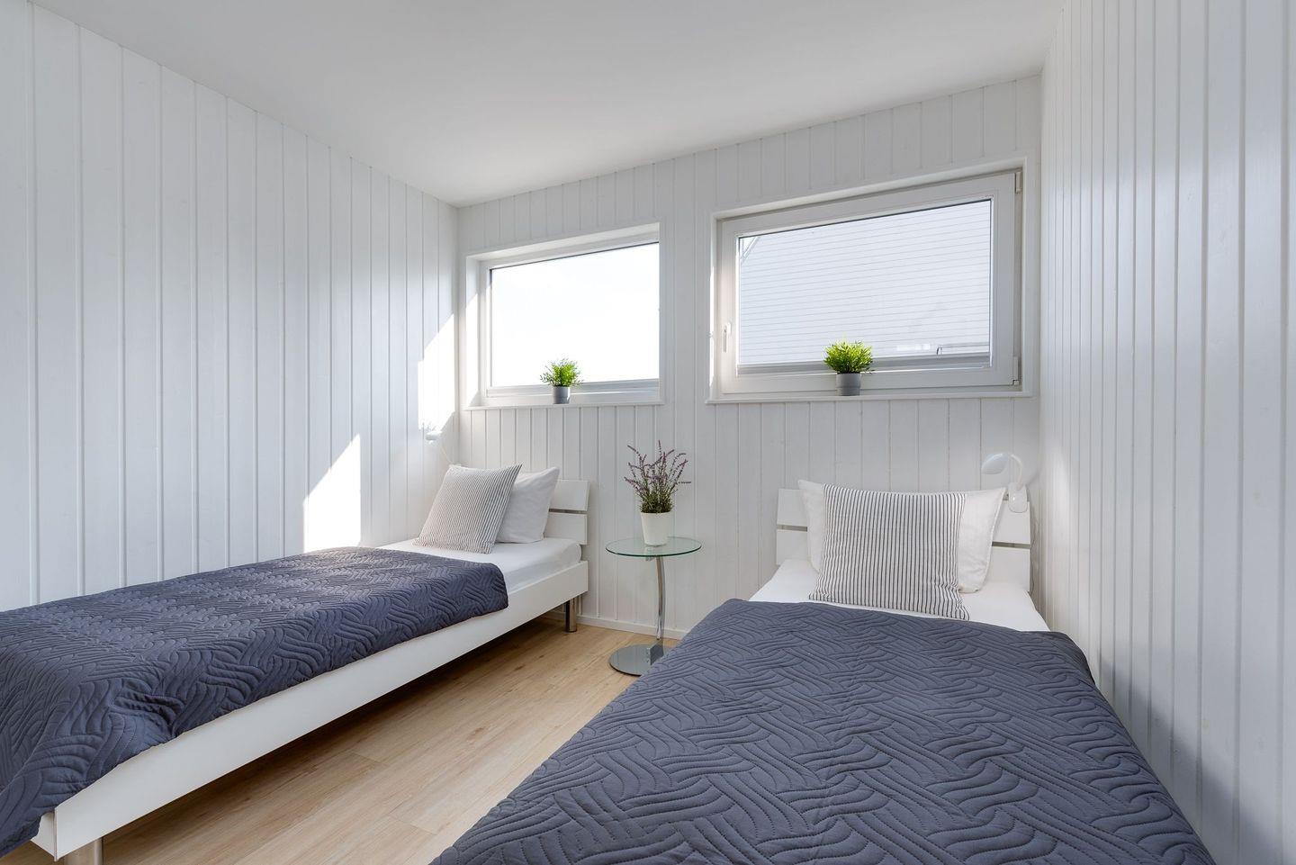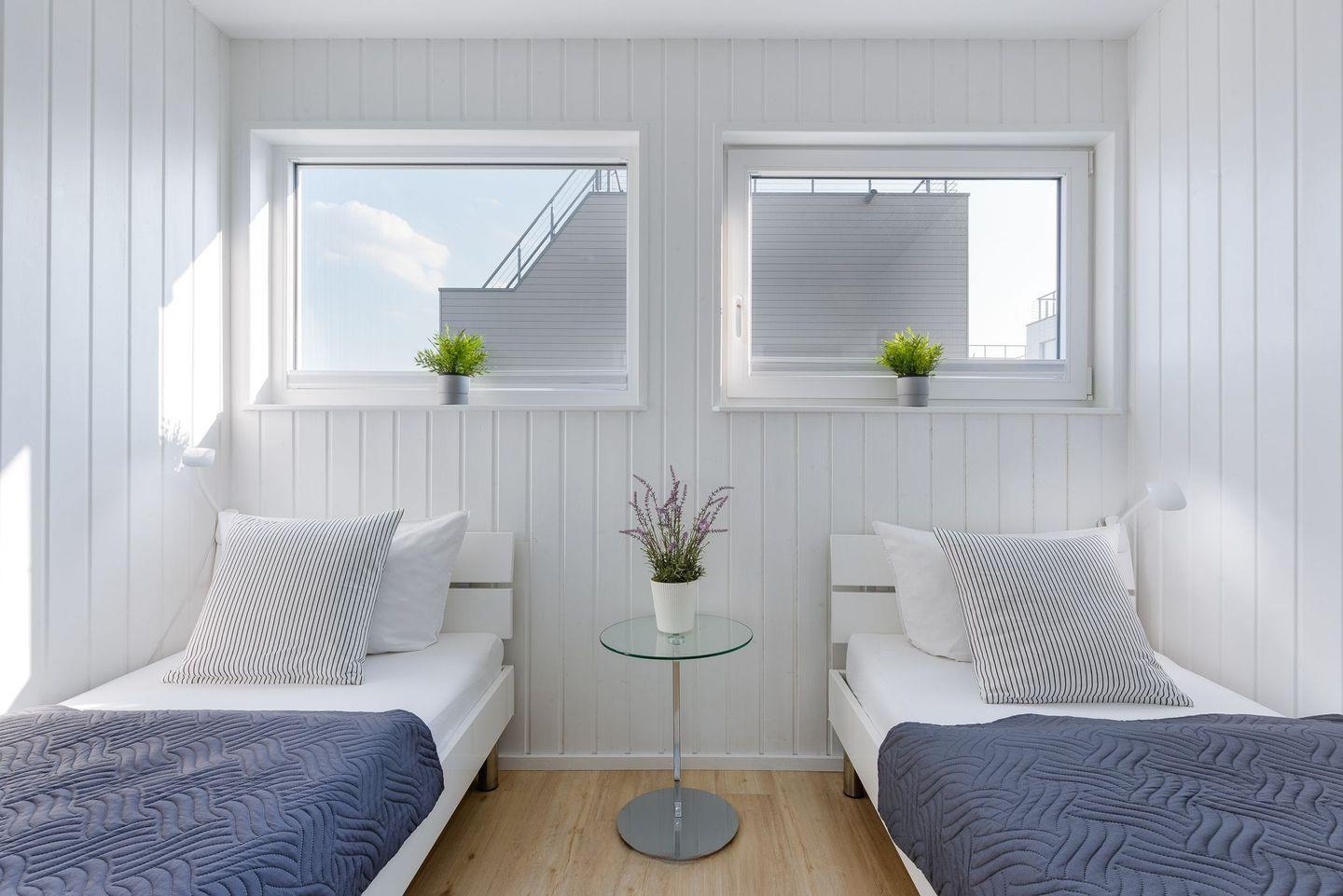 Der großzügige Wohn- und Essbereich im Obergeschoss verfügt über Panoramafenster mit Zugang zur Terrasse und Hafenblick. Im Erdgeschoss befinden sich zwei Schlafzimmer. Das Hauptschlafzimmer bietet bodentiefe Panoramafenster, eine Schiebetür und direkten Zugang zur unteren Terrasse, die das Haus umgibt. Des Weiteren finden Sie im Erdgeschoss das Badezimmer mit Dusche, WC und Waschbecken. Nach einem Tag voller Aktivitäten entspannen Sie in der Sauna mit Meerblick und können sich anschließend in der Ostsee erfrischen.
