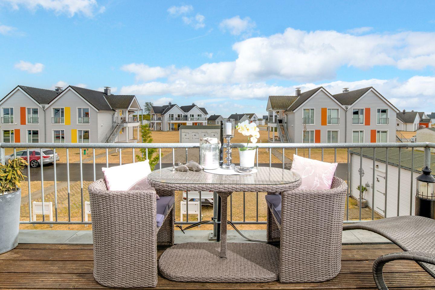 Vom offenen Essbereich, der an die Küche angrenzt, ist die Terrasse zugänglich. Diese ist großzügig ausgestattet mit einem Strandkorb, zwei Relaxliegen, einem Ampelschirm, einem Rattan-Esstisch mit Stühlen, Terrassenmöbeln und einem Weber-Grill. Für den Fall, dass ein Strandbesuch gewünscht wird, stehen ein Bollerwagen, eine Strandmuschel, ein Volleyball und Strandunterlagen zur Verfügung. Ergänzt wird diese Etage durch ein geräumiges Gäste-Duschbad.