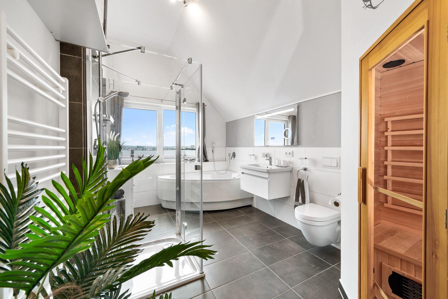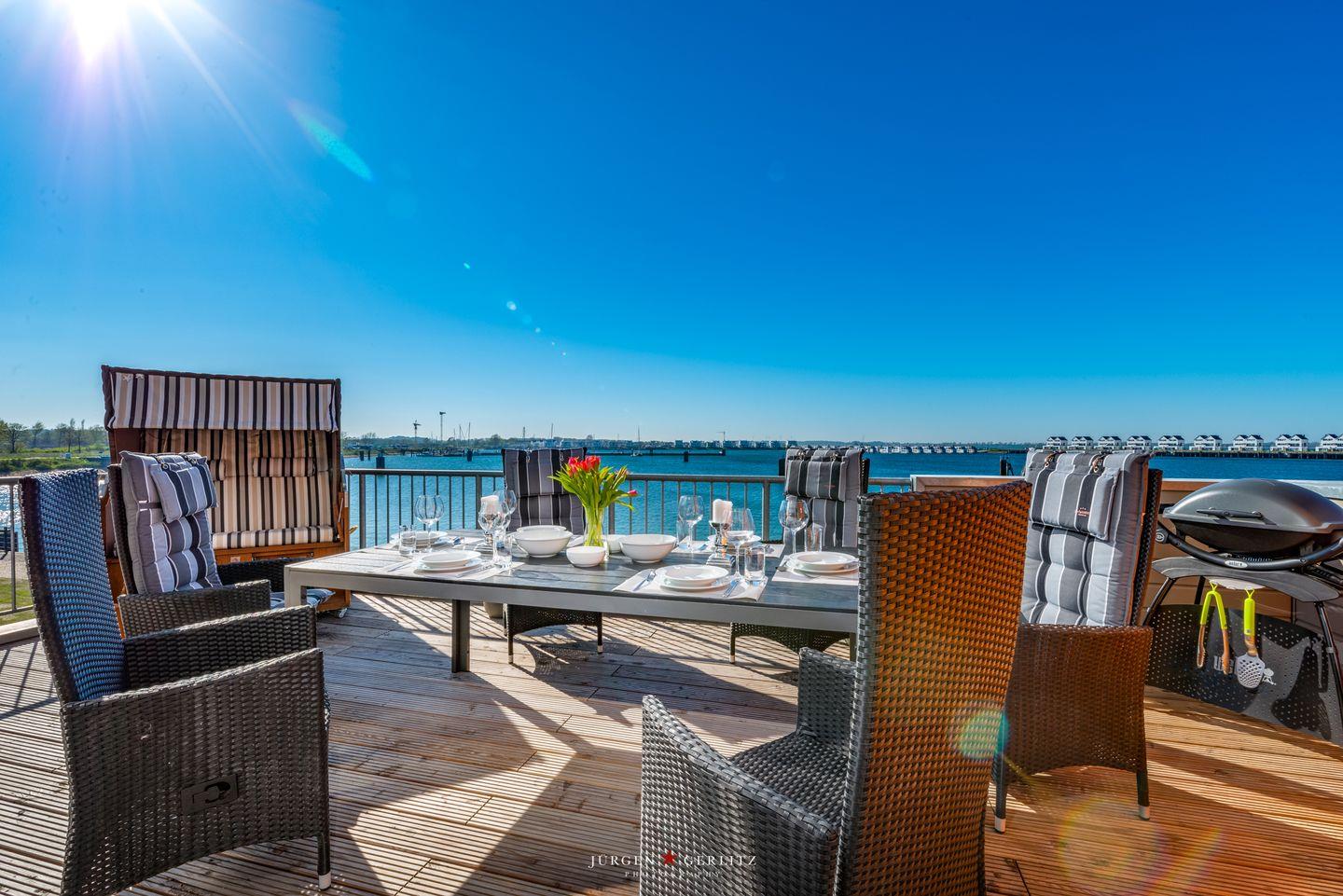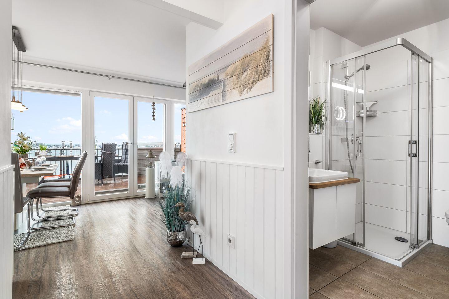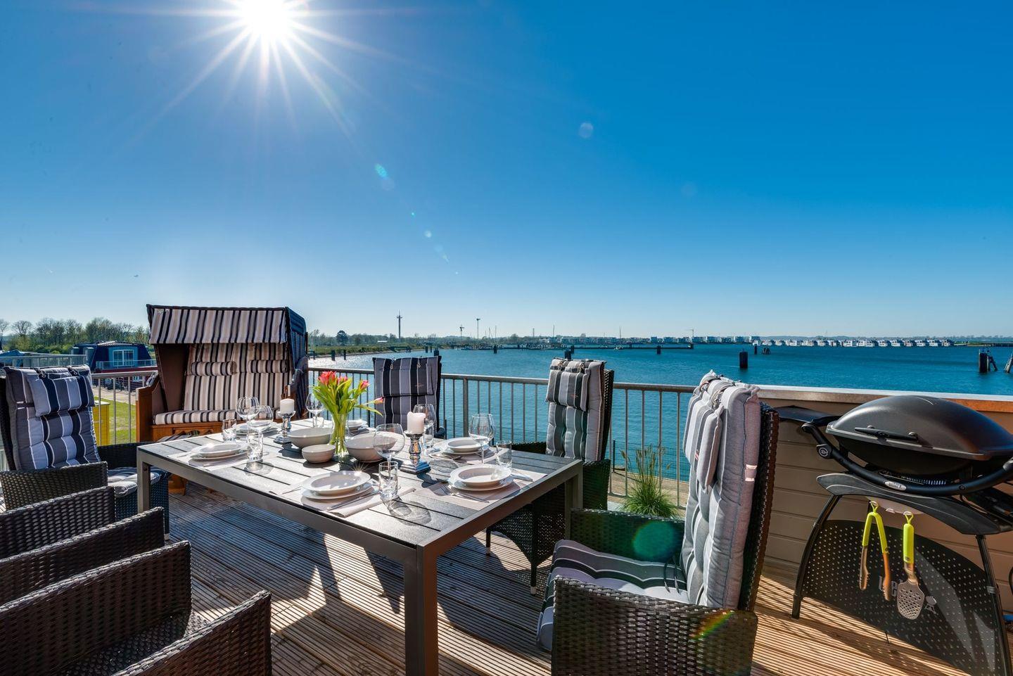 Luxusferienwohnung direkt am Wasser mit Kaminofen, Wellnesssauna, Whirlwanne und hochwertiger Ausstattung. Ein Traumblick auf den Yachthafen und die Ostsee.