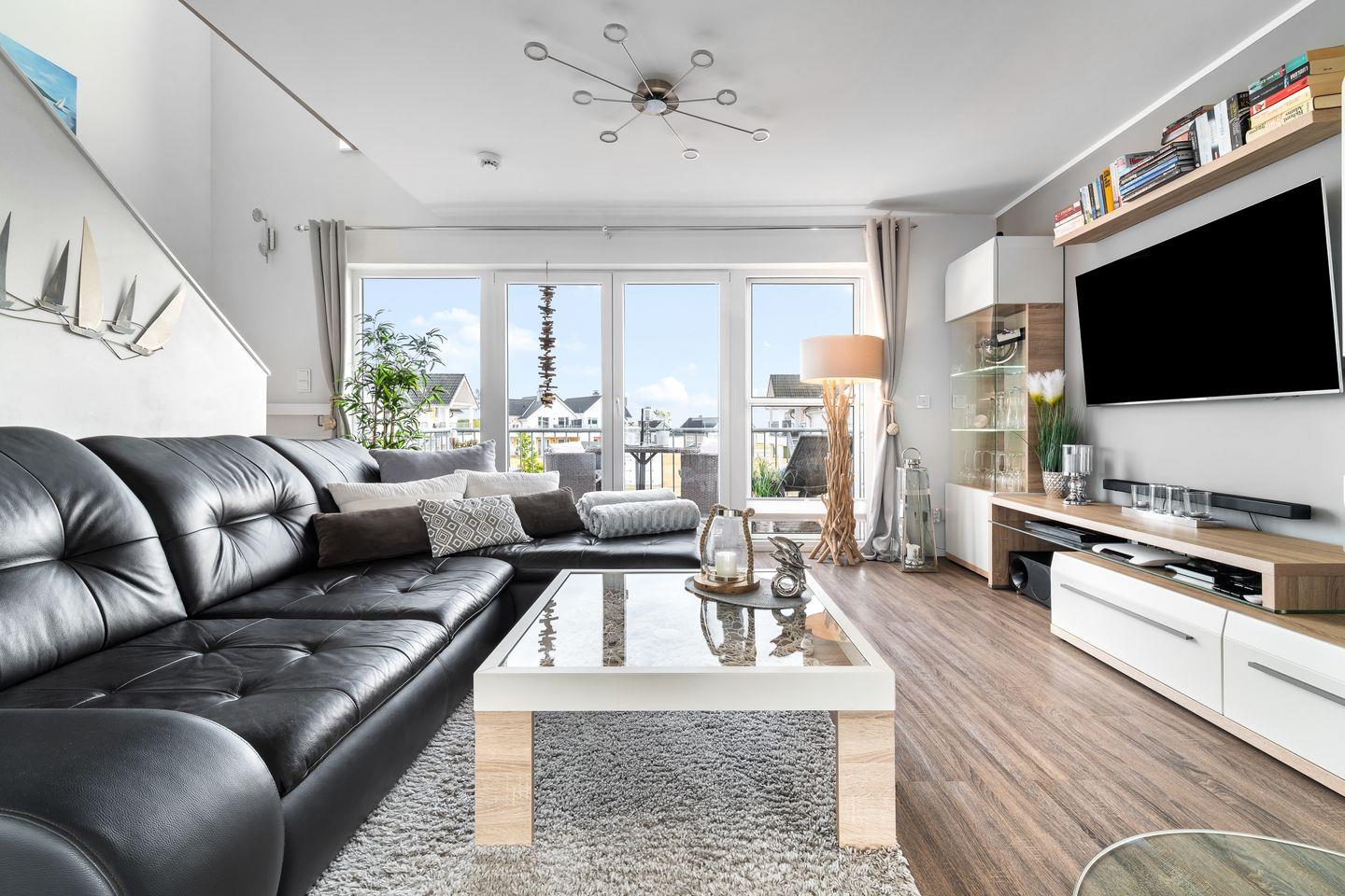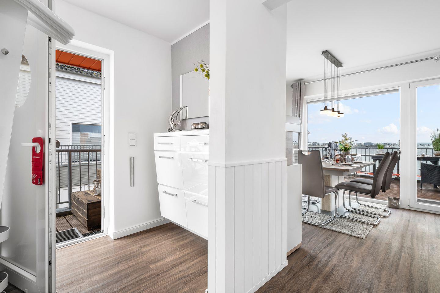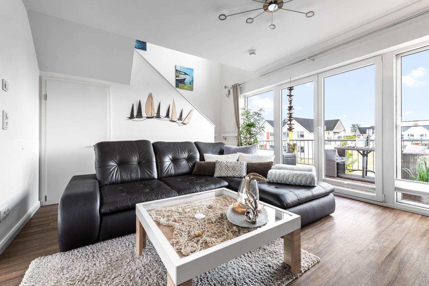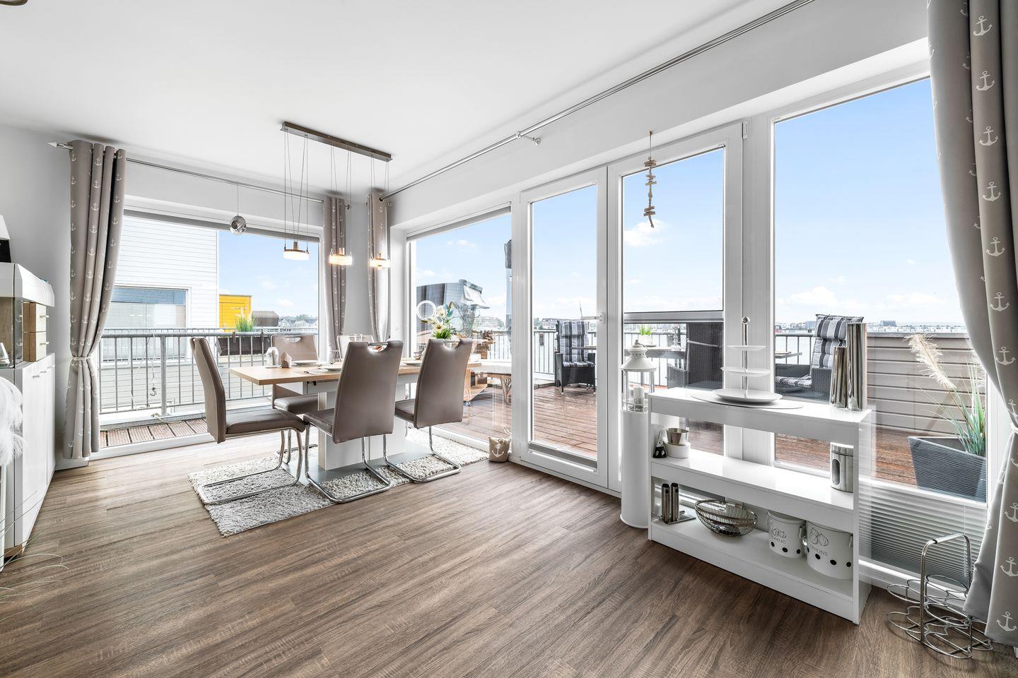 Die Maisonette-Wohnung "Hafenlounge" bietet eine hochwertige Ausstattung und befindet sich in direkter Wasserlage. Der großzügige Wohn- und Essbereich profitiert von reichlich Tageslicht durch großen Panoramafenster, wodurch eine helle und einladende Atmosphäre entsteht. Dank der Ausrichtung zur Südseite des Gebäudes können die Gäste den ganzen Tag über Sonnenschein genießen.