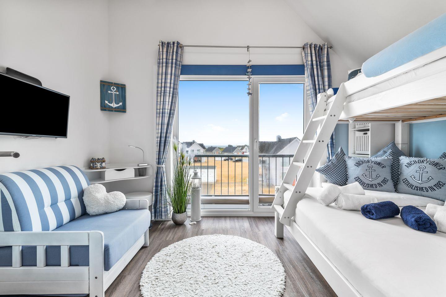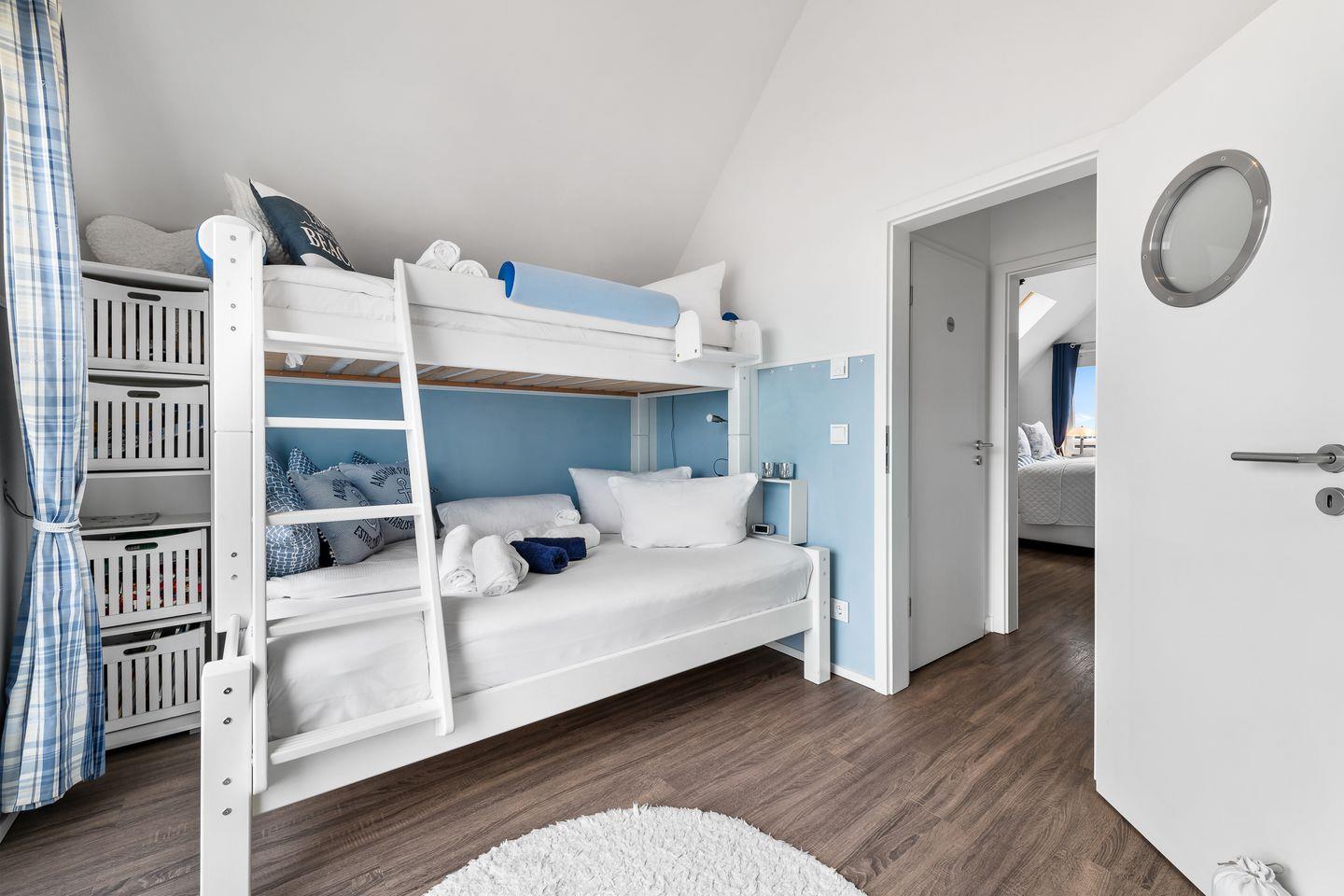 Das zweite Schlafzimmer verfügt über einen Eckkleiderschrank, einen Eckschreibtisch mit Sitzhocker für Jugendliche, einen Full-HD-LED-Fernseher, einen Schlafsessel aus Massivholz mit Federkern (87x197 cm) und ein Hochbett für Erwachsene. Der untere Teil des Hochbetts (140x200 cm, bis 180 kg) ist für zwei Personen geeignet, der obere Teil (90x200 cm, bis 75 kg) für eine Person.
