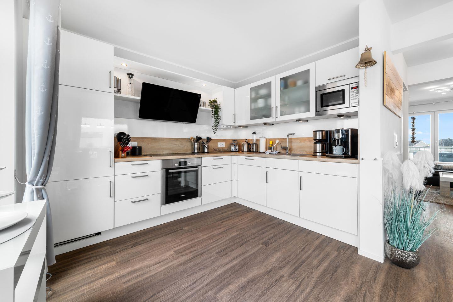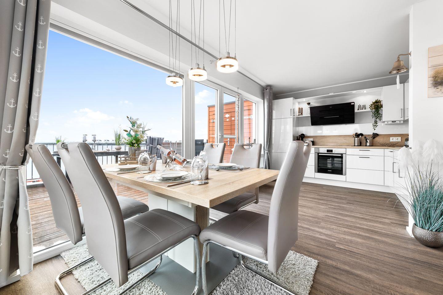 In der exzellent ausgestatteten Küche können Gäste regionale Spezialitäten zubereiten. Alternativ zur Nutzung des Herds oder Kochfelds stehen ein WMF-Tischgrill, ein Raclette und ein elektrischer Webergrill zur Verfügung. Die freie Lage und die bodentiefen Fenster ermöglichen einen Panoramablick auf den Yachthafen und einen eindrucksvollen Sonnenuntergang.