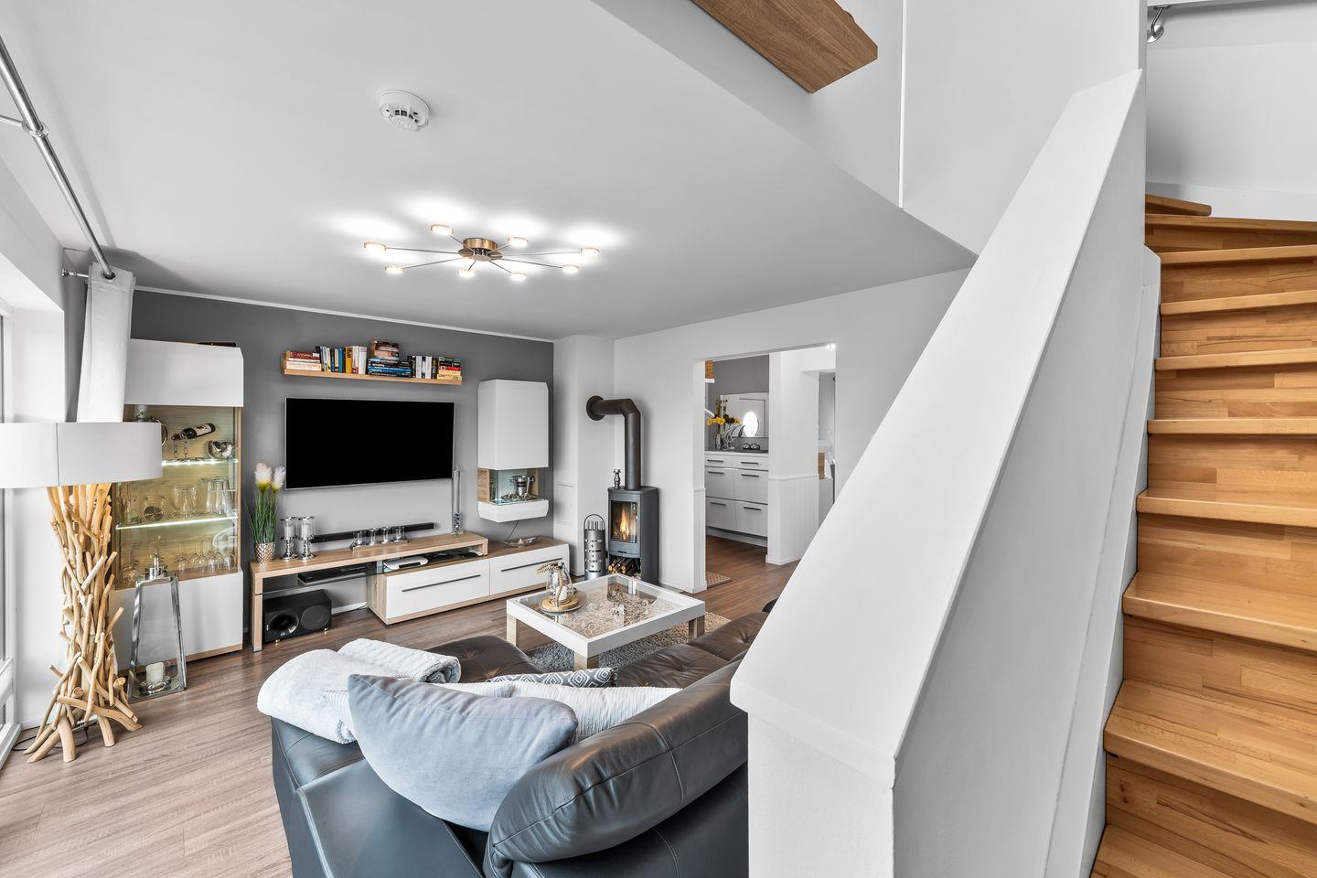 Das Obergeschoss bildet den zentralen Bereich der Wohnung und präsentiert sich mit einem offenen Loft-Design, das einen fließenden Übergang zwischen den Räumen ermöglicht. Das geräumige Wohnzimmer ist mit einem Designersofa (mit elektrisch verstellbarer Ottomane), einem Kaminofen und einem 55-Zoll-4K-UHD-Fernseher mit Blu-Ray-Player und Bluetooth-Soundbar ausgestattet. DVDs für Kinder, Jugendliche und Erwachsene sowie Spiele für verschiedene Altersgruppen sind ebenfalls vorhanden.