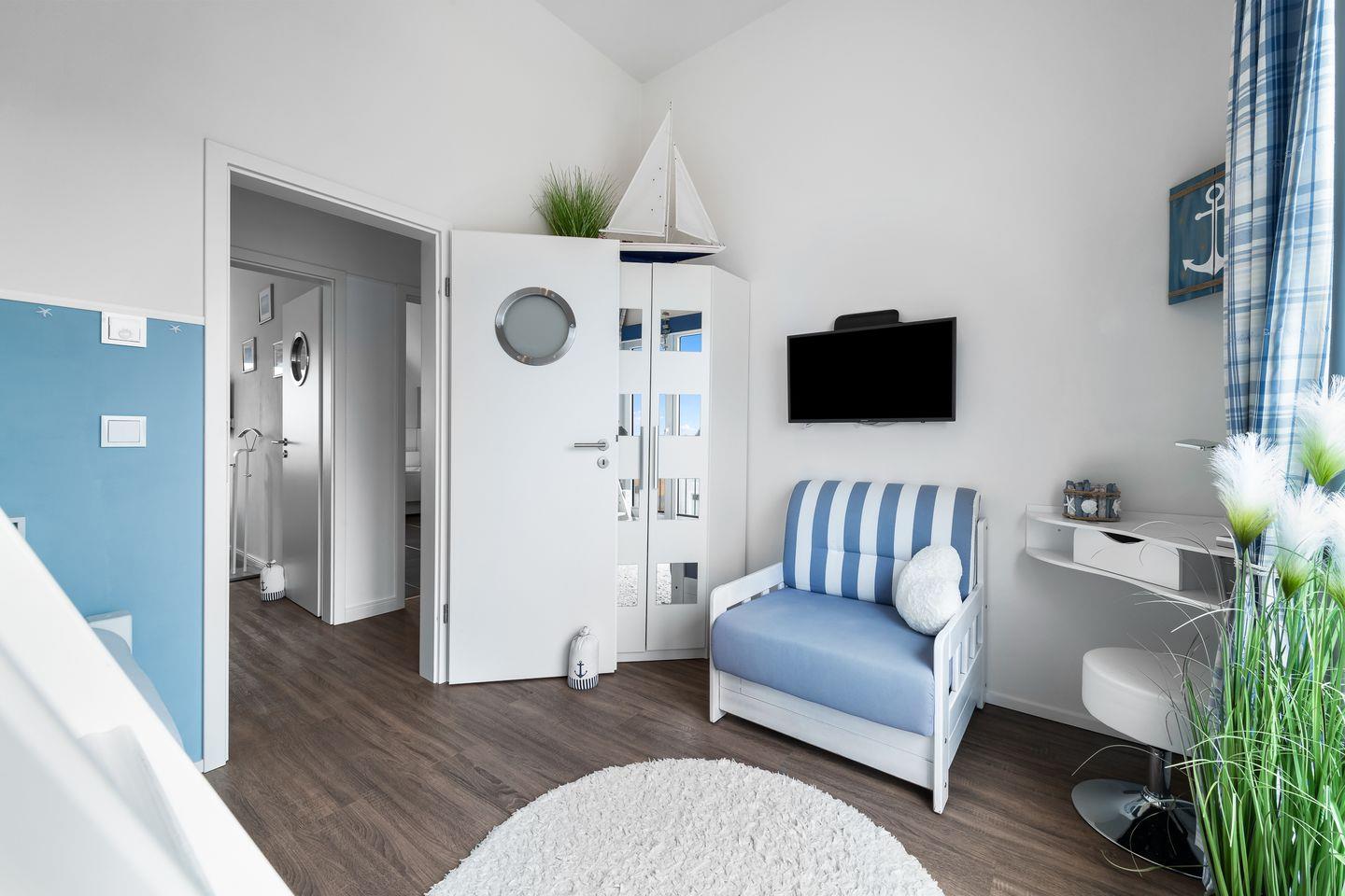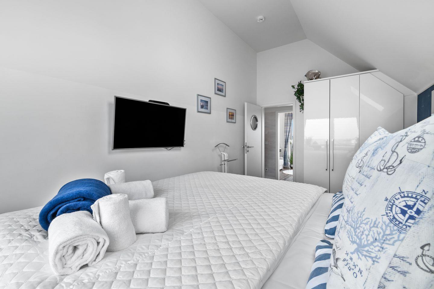 Das erste Schlafzimmer ist mit einem Boxspringbett mit hochwertiger Matratze, einem großen Einbauschrank, einer Kommode, einem UHD-LED-Fernseher und einem Ausblick auf das Hafenbecken ausgestattet. Ein Kinderreisebett für Babys und Kinder ist ebenfalls vorhanden.