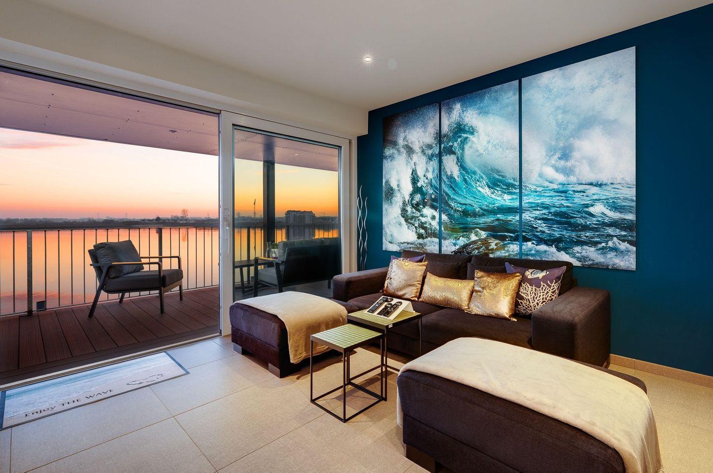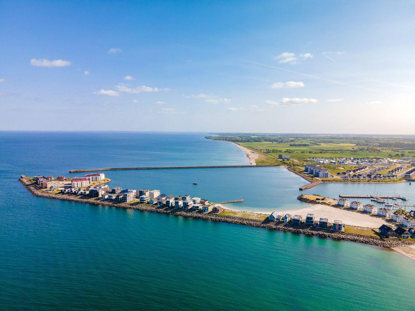 Die 2018 fertiggestellte Ferienwohnung „The WAVE“ liegt im ersten Obergeschoss eines kleinen Apartmenthauses, direkt am Wasser auf der Nordmole im Ostseeresort Olpenitz.