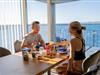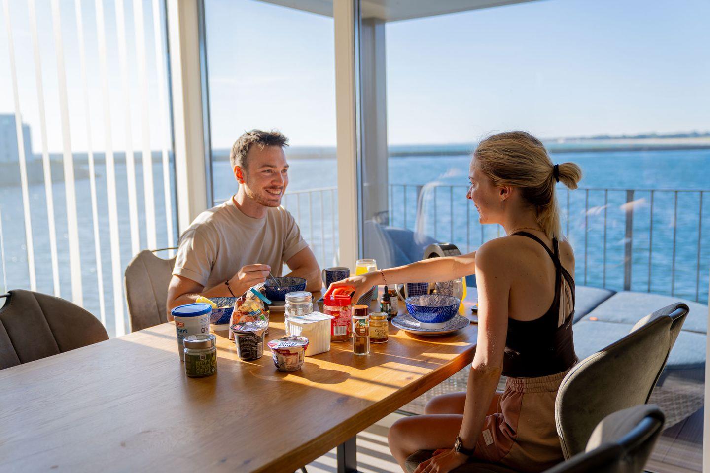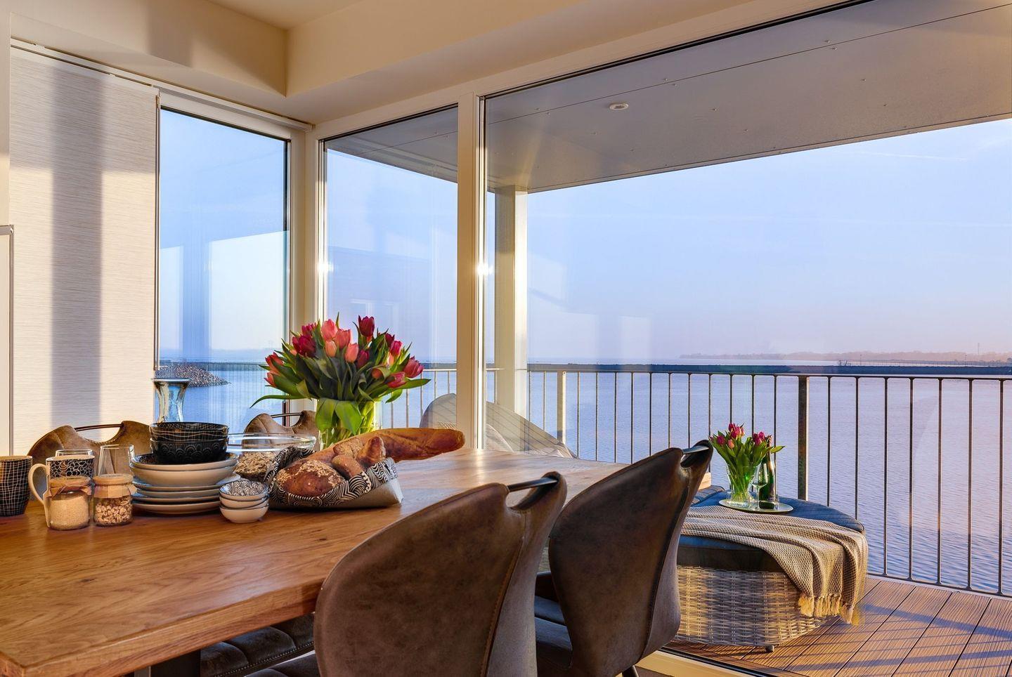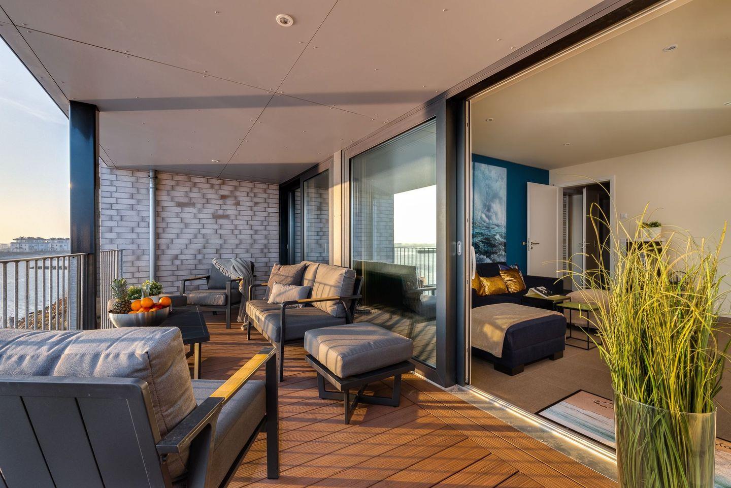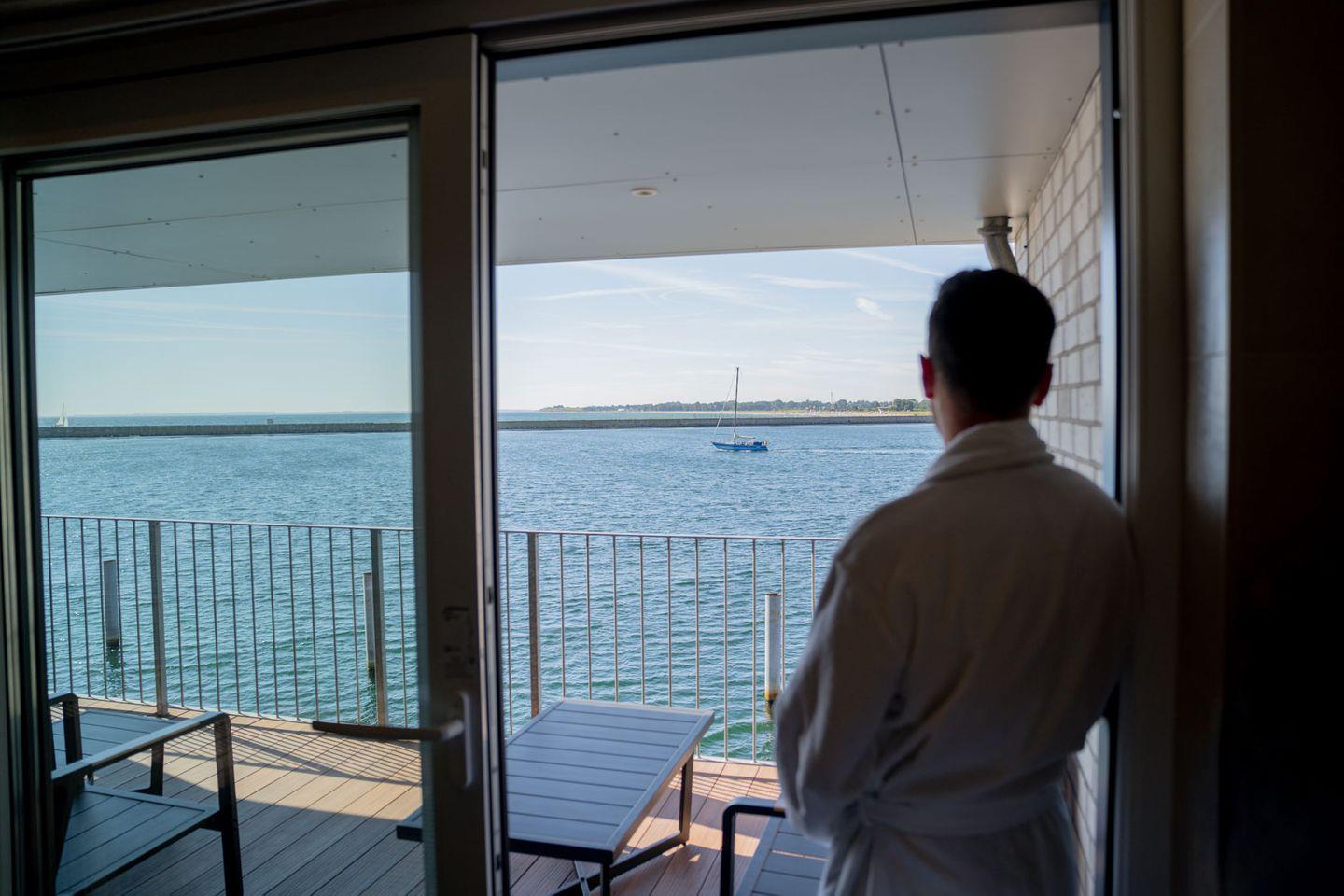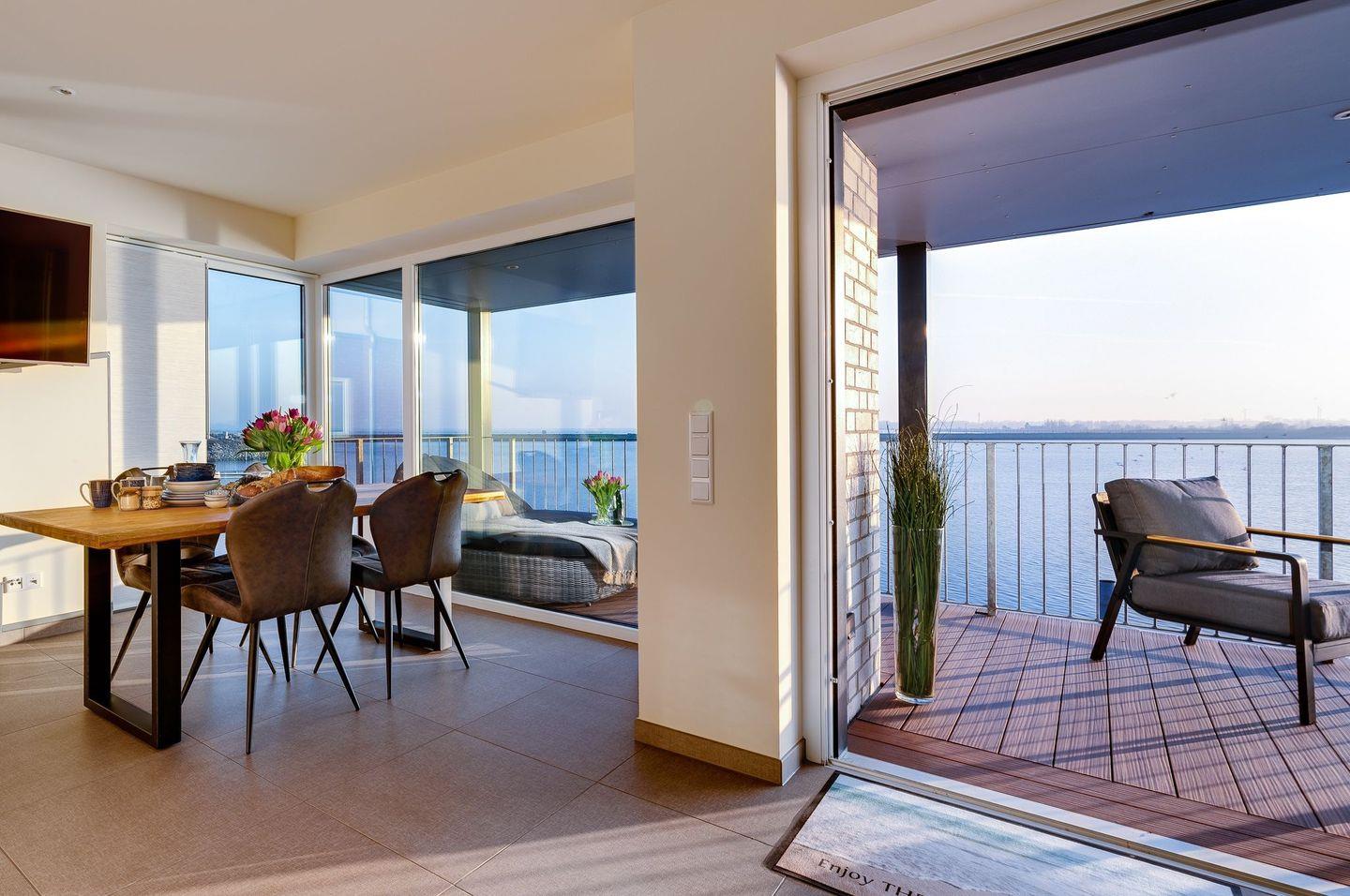 Die bodentiefen Panoramafenster mit Zugang zum großzügigen Balkon ermöglichen zu jeder Zeit einen freien Blick auf die Hafeneinfahrt, die Ostsee und die Marina des Yachthafens.