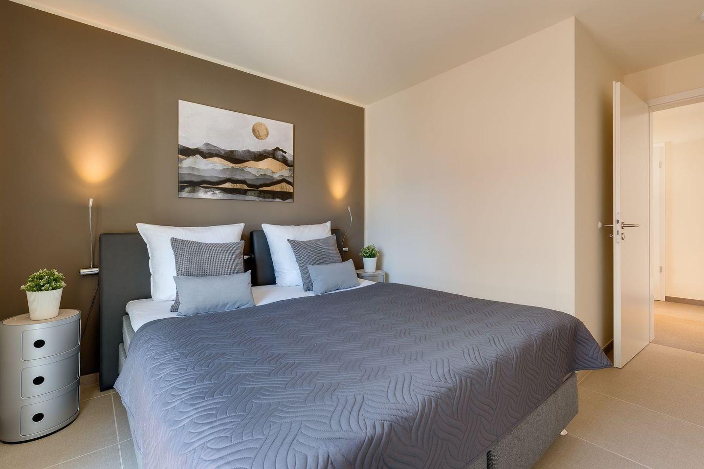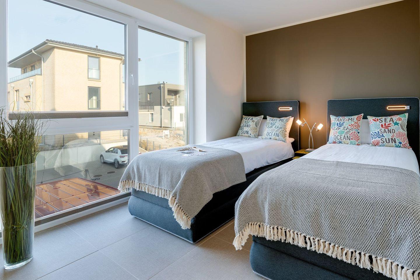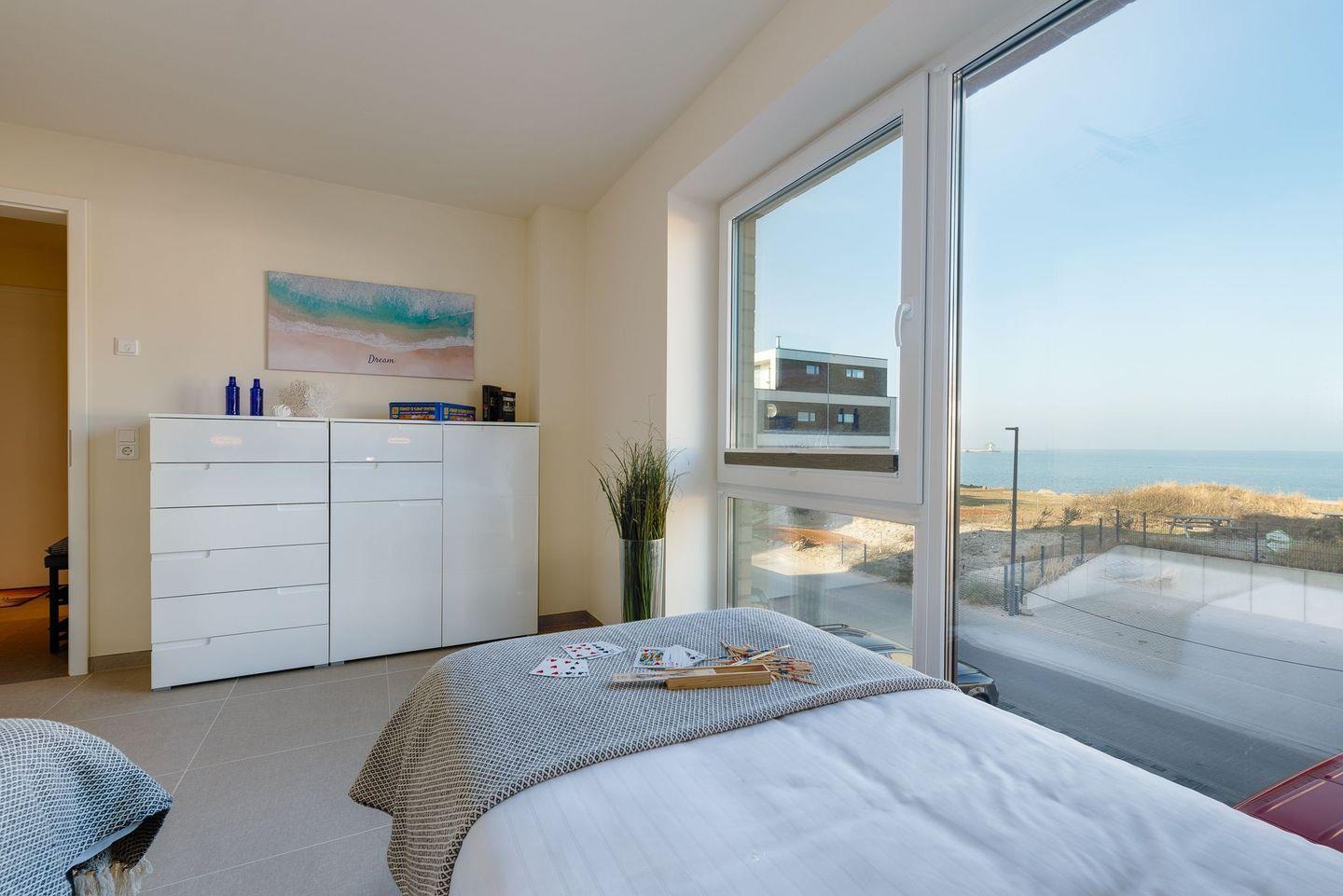 In beiden Schlafzimmern befinden sich hochwertige Boxspringbetten und im Masterbedroom außerdem ein großer Kleiderschrank. Das zweite Schlafzimmer verfügt über zwei einzelne Boxspringbetten und zwei Kommoden, die ausreichend Aufbewahrungsraum bieten. Aus diesem Schlafzimmer kann beim Aufwachen schon der Blick auf die freie Ostsee genossen werden. Alle Schlafzimmer sind mit Plissees und Verdunklung versehen, sodass einem erholsamen Schlaf nichts im Wege steht.