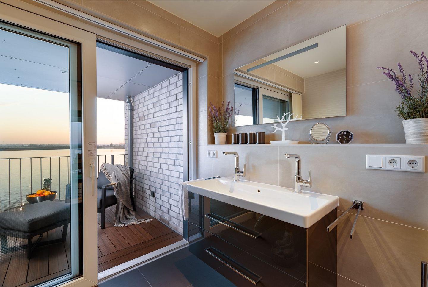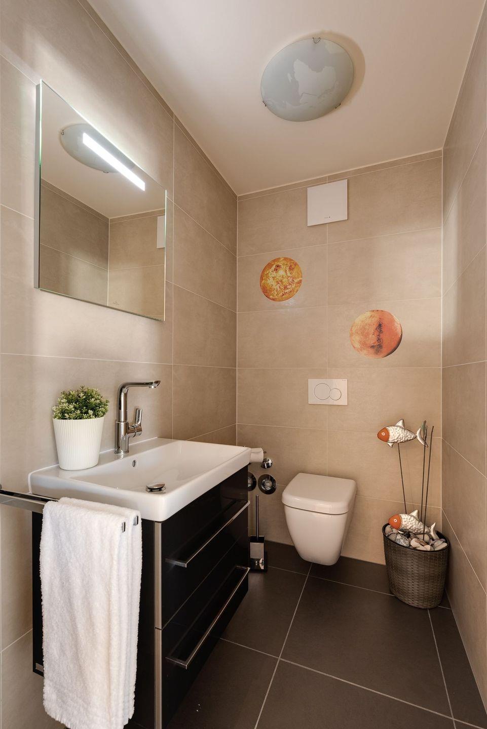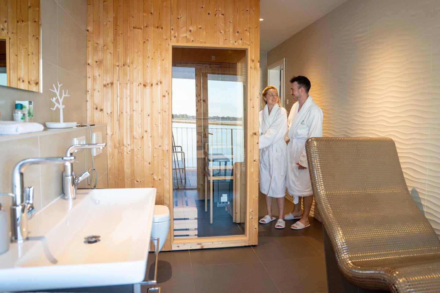 Ein besonderes Highlight in dieser Wohnung ist das Badezimmer. Neben einer ebenerdigen großen Regendusche und einer finnischen Sauna mit direktem Meerblick erwartet unsere Gäste eine Luxus-Wellnesswärmeliege, welche direkt vor dem großen Panoramafenster mit Blick auf die Ostsee steht. Entspannung pur für Körper, Geist und Seele und dabei das Rauschen der Wellen hören. Die hochwertige Bad-Ausstattung mit Doppelwaschtisch, Kosmetikspiegel und großem beleuchtetem Spiegel von Villeroy & Boch, sowie der Zugang zum großen Balkon, lassen diesen Raum zu einer Wellnessoase werden. Ein Gäste-WC steht unseren Gästen ebenfalls zur Verfügung. Die gesamte Wohnung ist mit einer Fußbodenheizung ausgestattet.