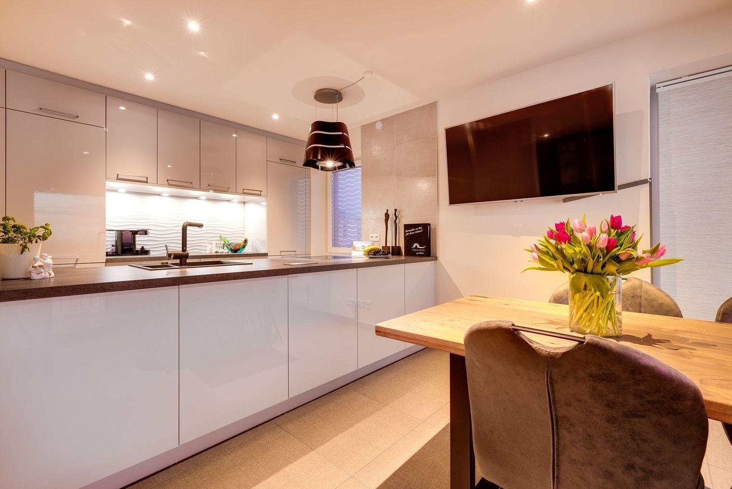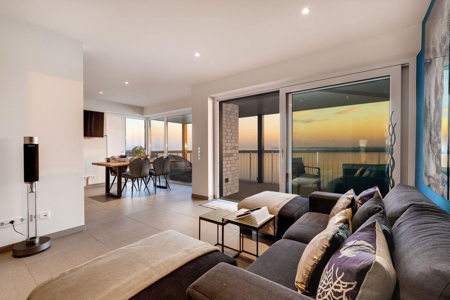 Das Luxus-Flair der Wohnung fängt unsere Gäste schon beim Betreten der Wohnung mit der Begrüßung durch italienische Designerfliesen ein. Vom Flur gelangen unsere Gäste in den offenen Wohnbereich, der mit seiner hochwertigen Einrichtung, der auf das Meer abgestimmten Ausstattung und der großen, bodentiefen Panoramaglasfront jedes Urlauberherz höher schlagen lässt.