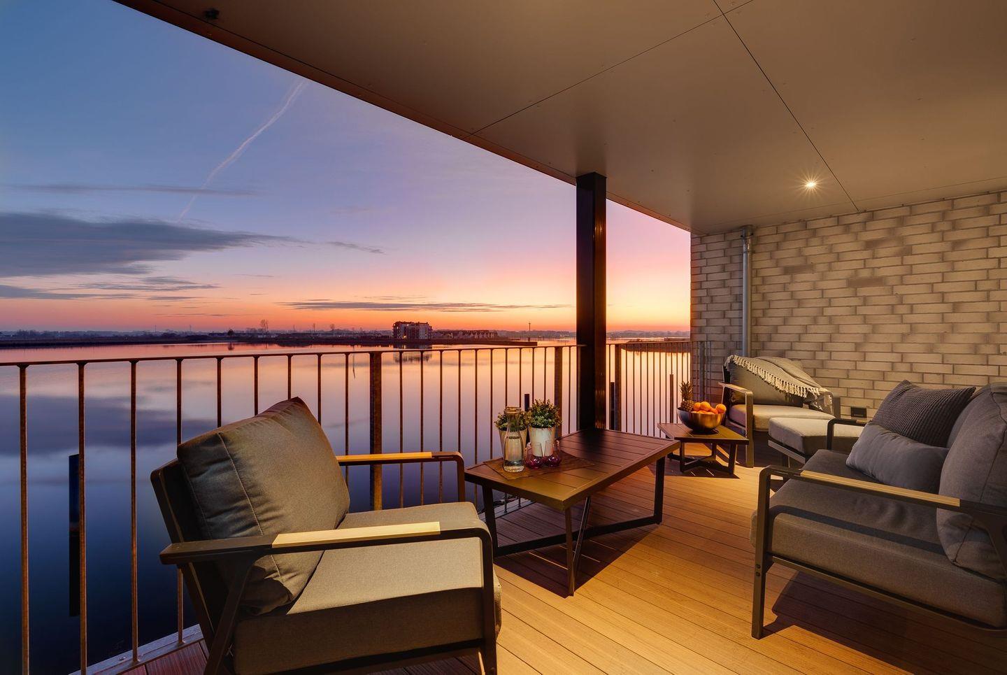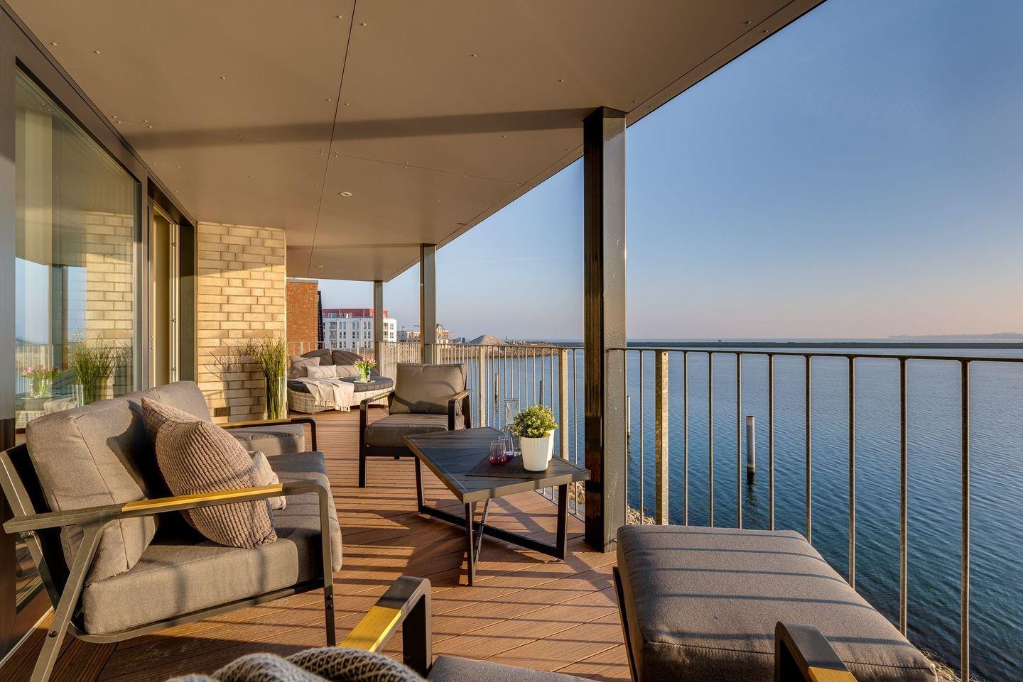 Der große nach Süden ausgerichtete und überdachte Balkon ermöglicht ganztägig die Sonnenseite zu erleben und ist mit einer Doppelloungeinsel, einer Loungesitzgruppe mit Sofa, zwei Sesseln und einem höhenverstellbaren Tisch ausgestattet. Von hier aus den Blick über das Meer schweifen lassen, das Frühstück genießen oder beim Sundowner Drink den herrlichen Sonnenuntergang genießen. Für den kulinarischen Genuss und das abendliche Candle-Light-Dinner steht ein Marken-Elektro-Grill mit Räucheraroma zur Verfügung.