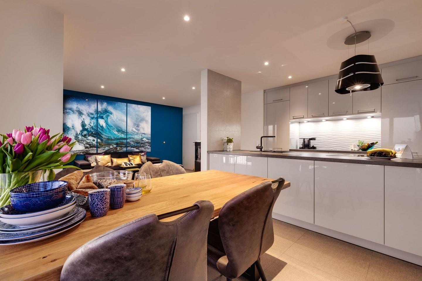 Die Ferienwohnung "The Wave" ist mit einem großen Wohnzimmer mit Essbereich und einer hochwertigen Küche, einem großen Balkon mit Meerblick, zwei Schlafzimmern und einem luxuriösen Wellnessbad ausgestattet. Direkt vor der Eingangstür parken und mit dem Fahrstuhl in das 1. Obergeschoss fahren.