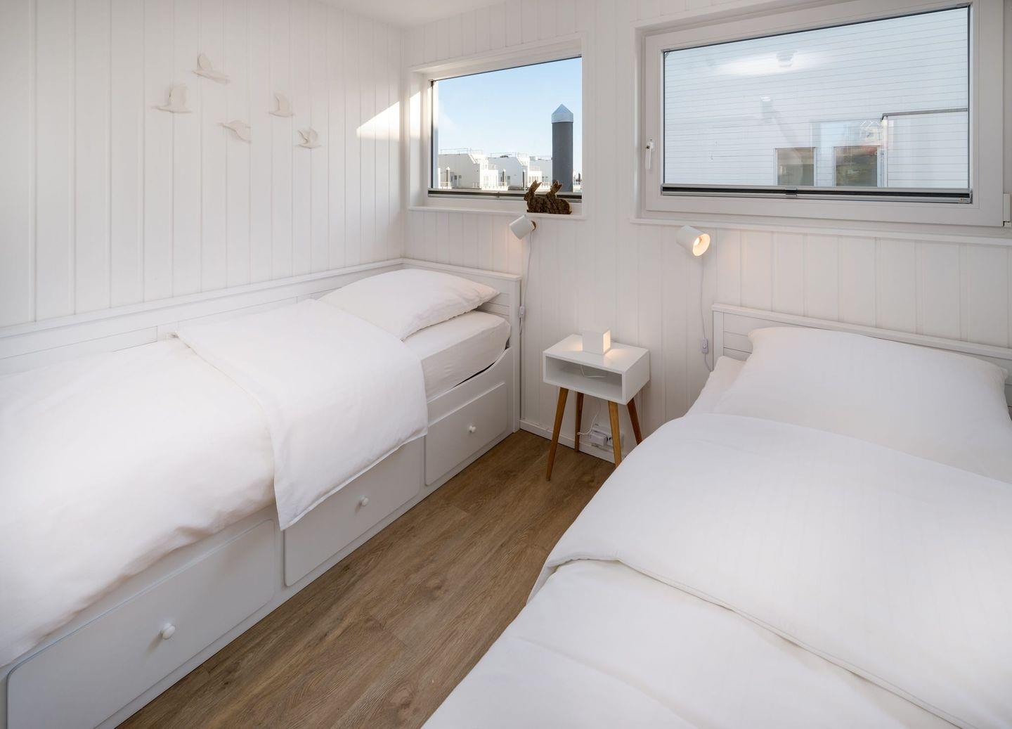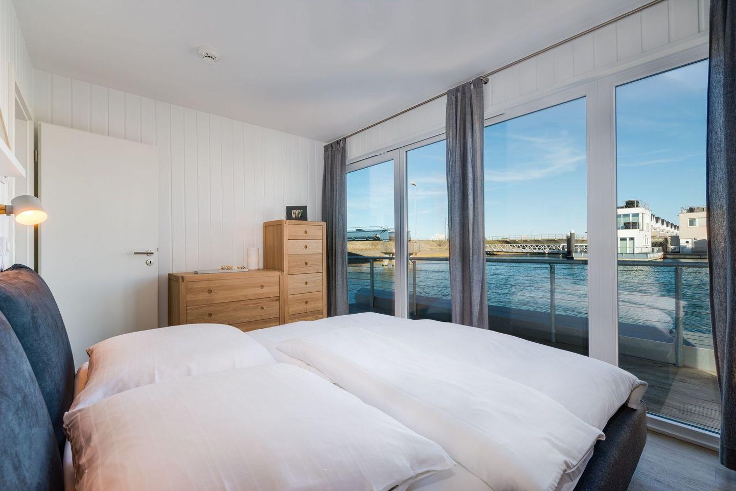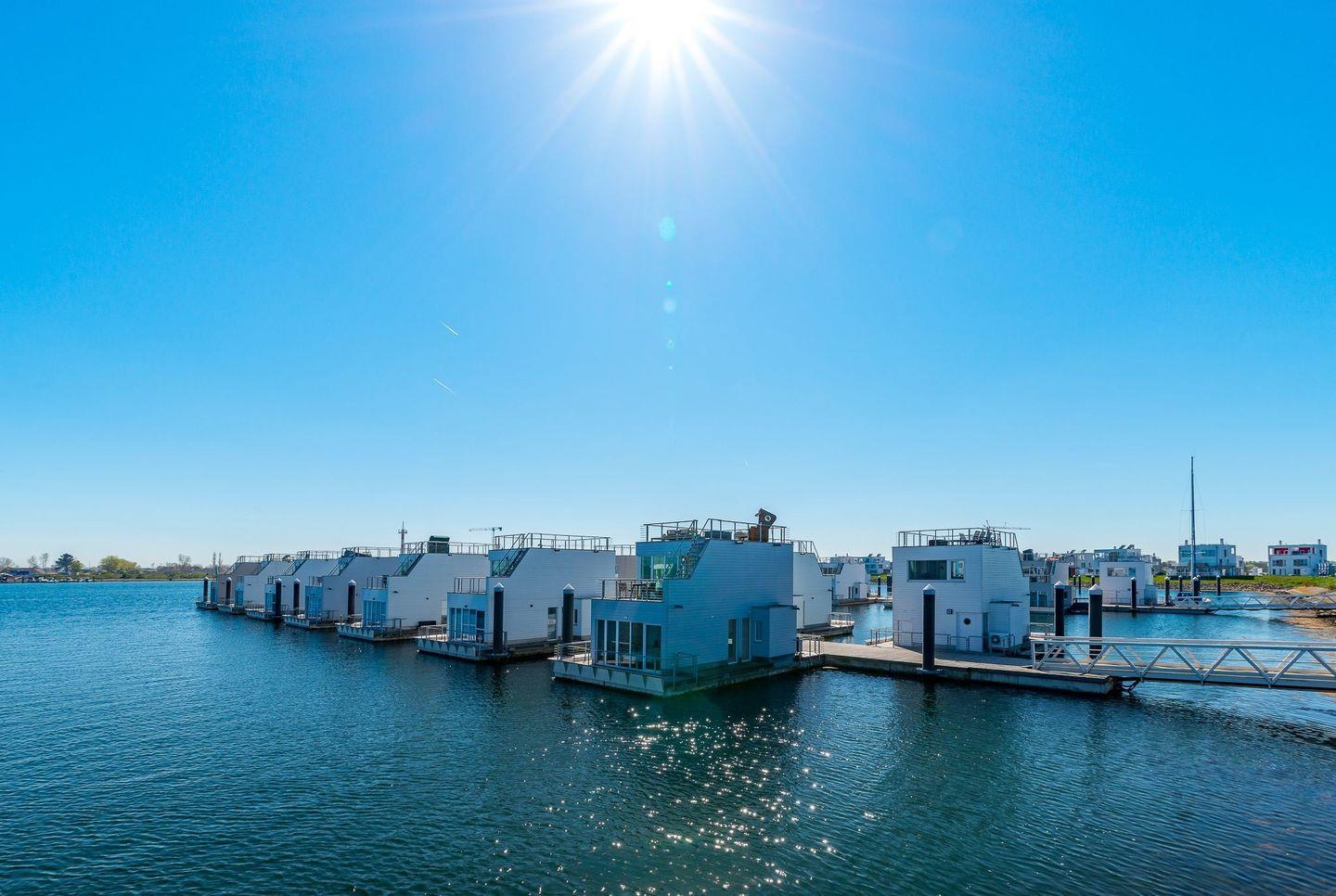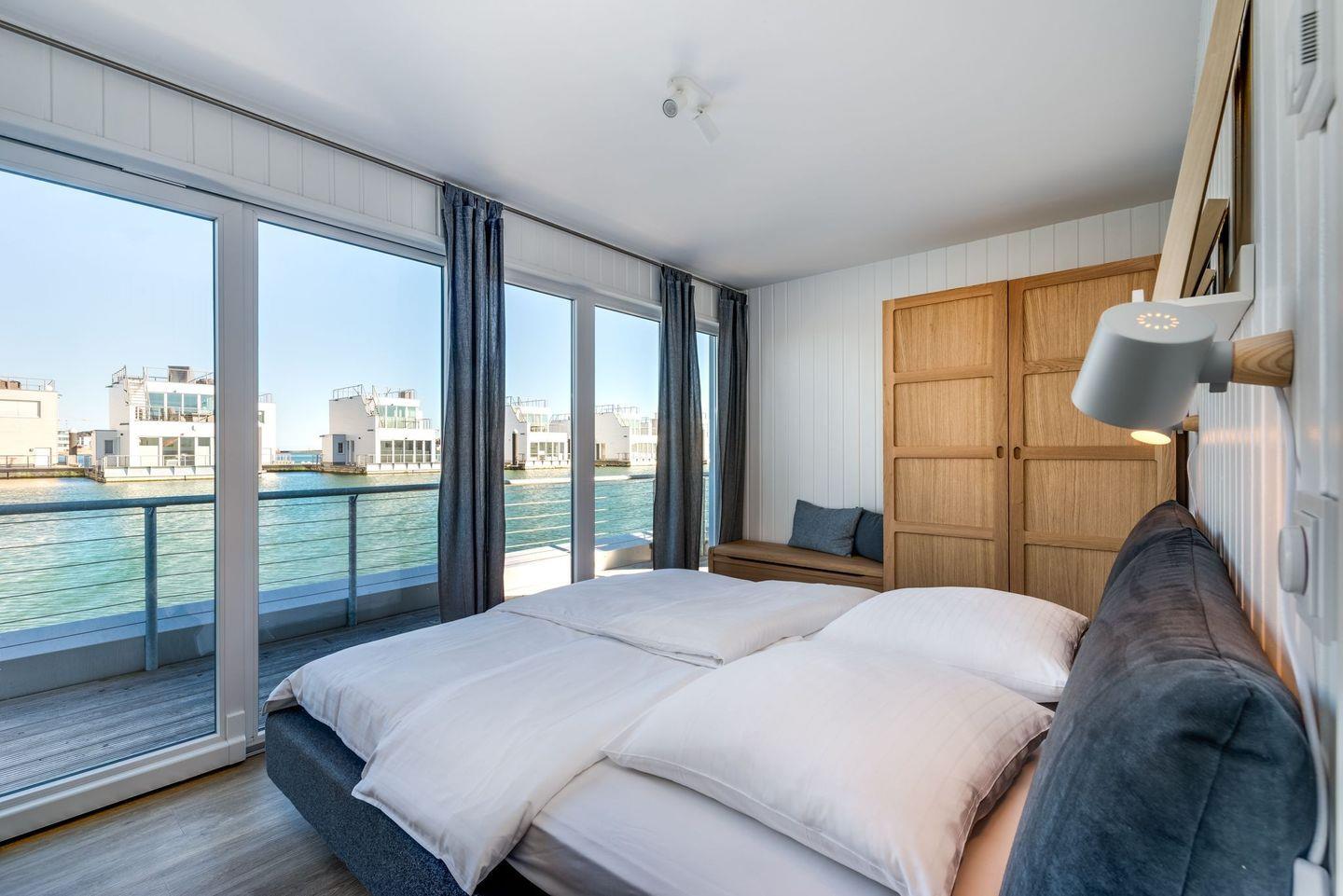 Das schwimmende Ferienhaus "The Nordic House" erstreckt sich über zwei Etagen. Im Obergeschoss befindet sich der weitläufige Wohn- und Essbereich mit integrierter Küche. Große Panoramafenster ermöglichen einen herrlichen Blick auf den Hafen. Eine breite Schiebetür führt zur großflächigen Terrasse. Das Obergeschoss mit einem komfortablen Lounge-Sofa, Designermöbeln, einem Esstisch für vier Personen und der umfassend ausgestatteten Küche bietet den idealen Rahmen für angenehme Stunden mit Freunden und Familie.