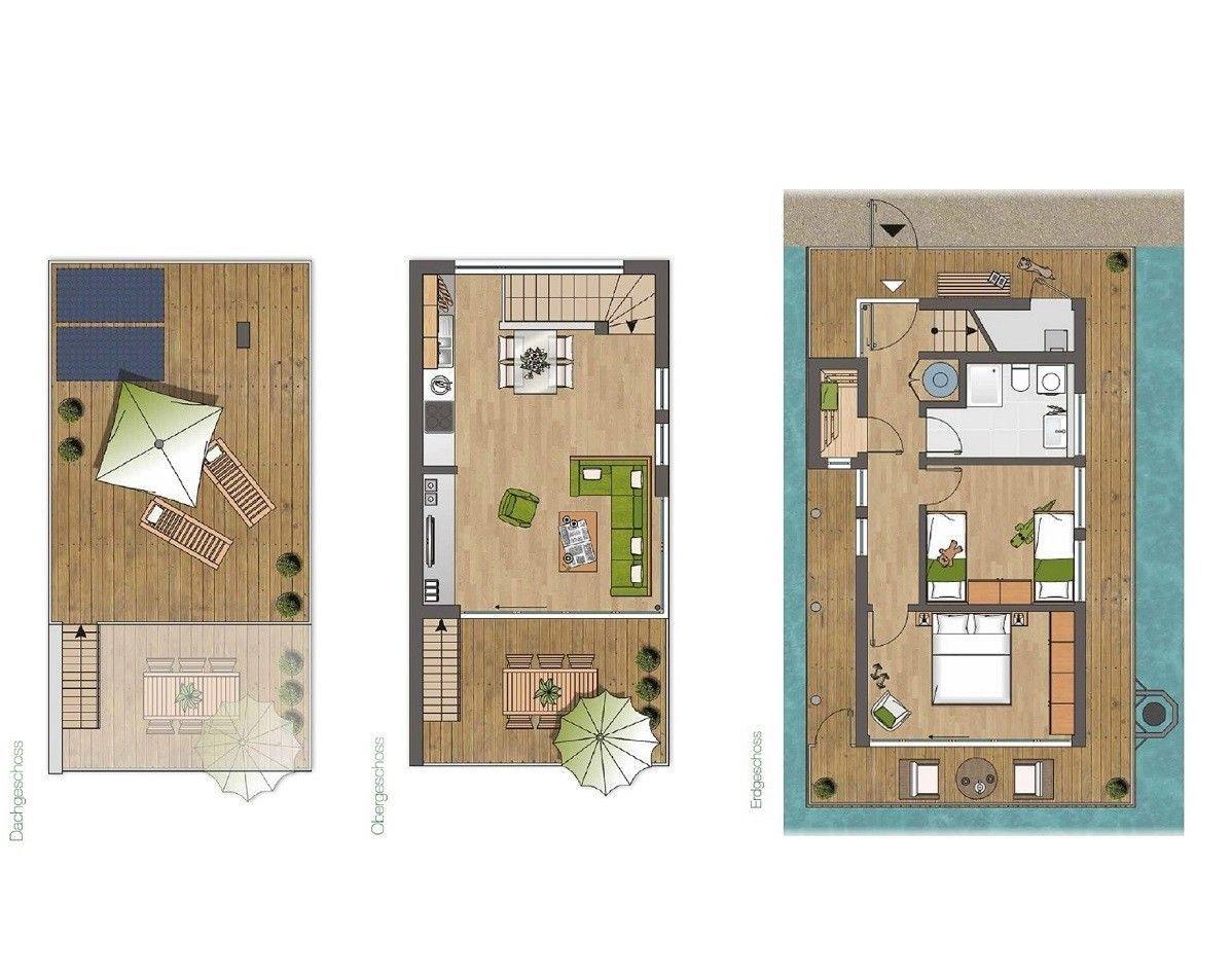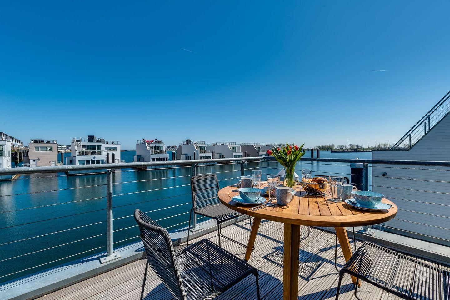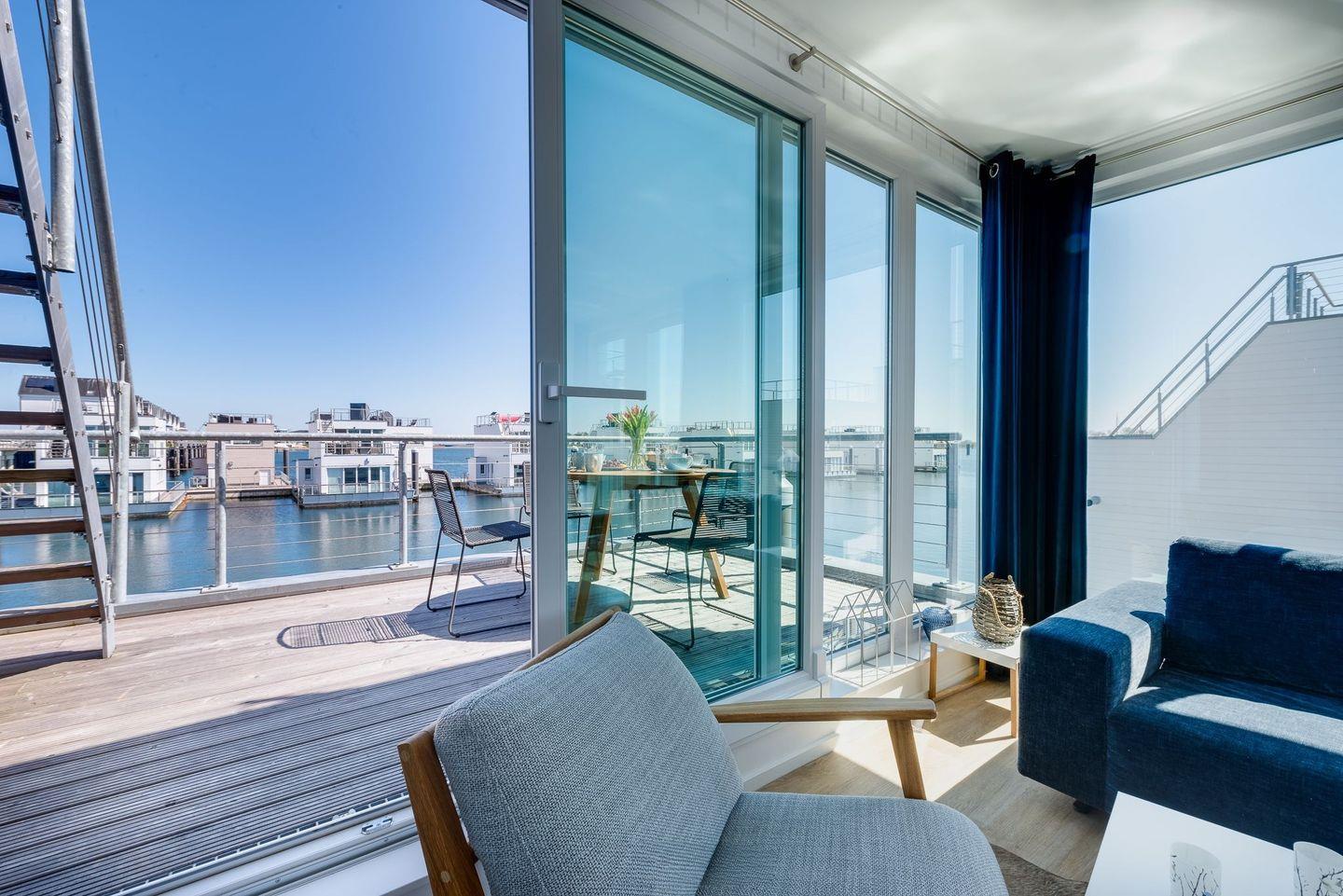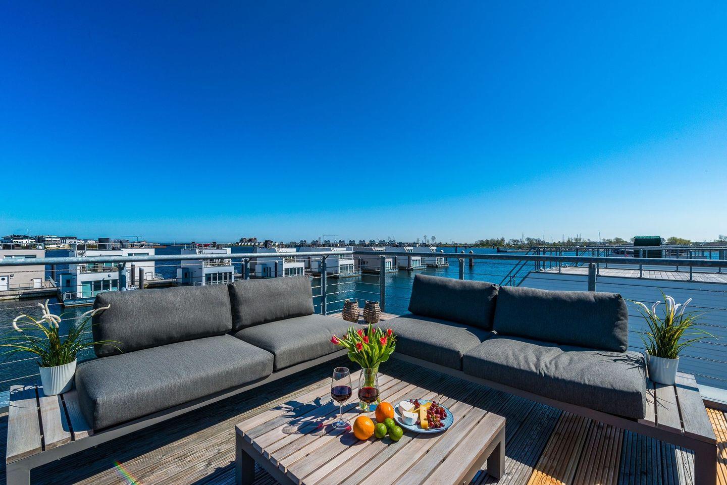 Schwimmendes Luxusferienhaus mit freiem Ostseeblick, gehobener Ausstattung, großer Dachterrasse, eigenem Bootsanleger und finnischer Sauna.